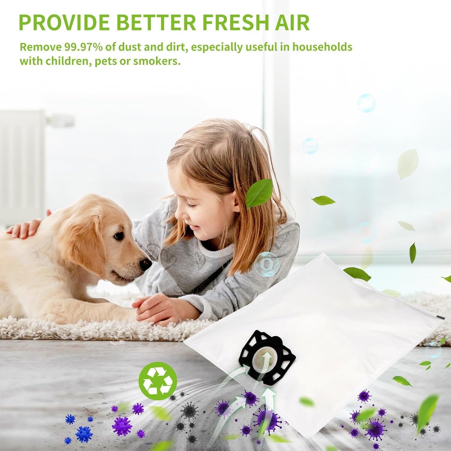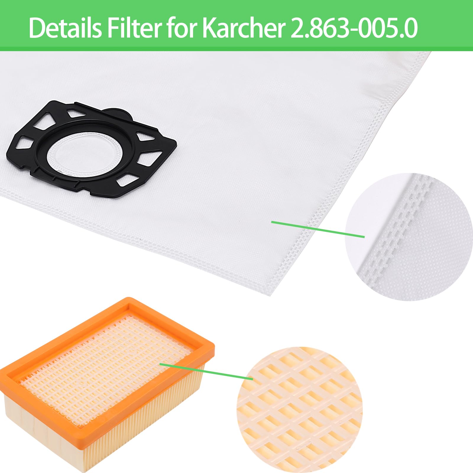 ["Good compatibility: 10 vacuum cleaner bags and 2 filters for Kärcher WD5 WD4, WD4 Premium, WD5 P, WD5 Premium, WD5 P Premium, WD6 P Premium, MV4, MV4 Premium, MV5, MV5 Premium, MV5 P, MV5 P Premium, MV6, MV6 P Premium, KWD4, KWD5, KWD6, Replaces 2.863-005.0.","Highly efficient filters: Flat fold filter for Kärcher WD4 Er up to 40 μm (= 0.04 mm), such as dust, pet hair, and pollen.","Strong adsorption: To ensure the vacuum cleaner's adsorption, it is recommended to change the filter and bag once every 3 months.","Wide range of applications: Kärcher WD6 filter and bag can be used both indoors and outdoors to meet your daily cleaning needs.","Quality service: If you have any questions about our vacuum cleaner filters, feel free to contact us to solve your problems."]