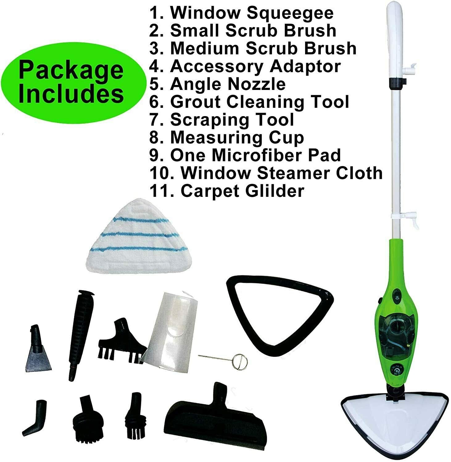 ["Cleaner: The steam cleaner eliminates and removes 99.9% of viruses, germs and bacteria. The cleaner has steam cleaning in 4 modes that can be adjusted according to your needs.","Multifunction: 11 accessories provide you with versatility. Steam cleaner offers glass brushes, floor brushes, carpet gliders, nylon brushes, etc. Simply install the necessary accessories and let the steam cleaner do all the work at your place!","Fast Preheating: Preheating is completed in just 30 seconds; powerful steam 30g-35g/min can easily remove stubborn stains on the floor without having to worry about insufficient steam or cleaning power.","Large Water Tank: The steam cleaner is detachable and the handle has two special slots for laying wires for convenient storage. 350 ml/12 oz large capacity for your long-term cleaning.","Easy to Use: Swivel mechanism and 11.5ft long power cord. The steam cleaner is equipped with an ergonomic handle that is comfortable and easy to hold. The floor steam cleaner can clean dead corners in all directions by pulling out an extension rod or a steam iron."]