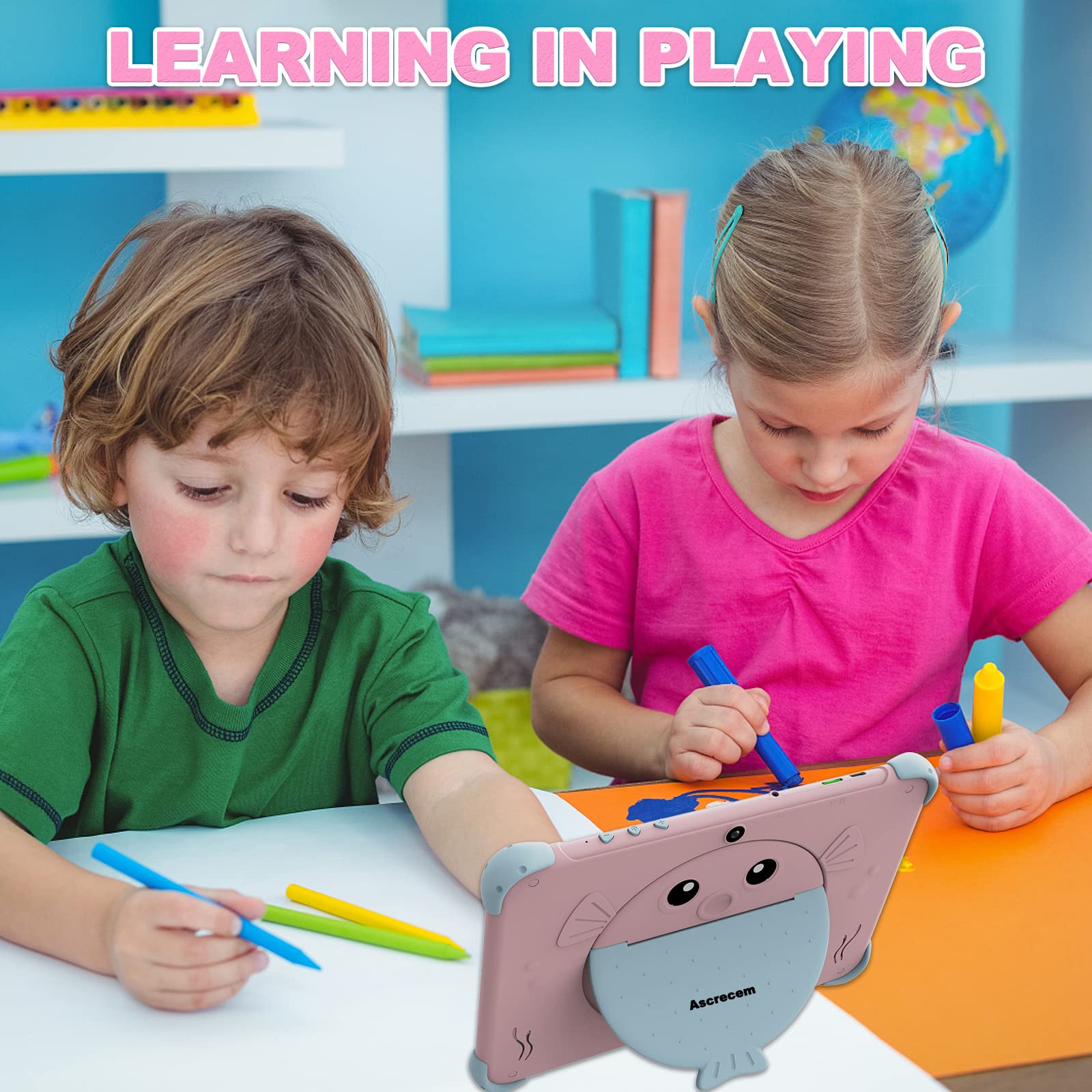 ["Newest Kids Tablet: Ascrecem tablet for kids 10 inch runs on the latest Android 11.0 and equipped with Quad-Core processor, 2GB RAM, 32GB ROM, allowing apps and media to run smoothly. Ascrecem kids tablet supports wifi, bluetooth, hotspot connective. The newly installed STEM, Art & Craft, Montessori in kids software are waiting to be explored by your kids.","Premium Parental Control: The 10 inch kids tablet comes with the [Iwawa] program for kids. In kids mode, parents can set up a separate profile for each child, add or block apps, filter content, limit and monitor screen time, and control what the kids see. The kids tablet can also be used by adults when they log out of [IWAWA]!","Keeping Kids Busy: The Ascrecem Android kids tablet comes pre-installed with a variety of educational games and videos. You can also download other favorite kids apps from the Play Store. This kids engaging content will keep them quiet in the car or when you are busy.","Large Screen with Shockproof Case: Ascrecem kids tablet 10 inch comes with a protective case included and surrounded by soft rubber that can protect the screen from occasional drops or bumps. A cute tail stand on the back of the kids tablet makes it easy for kids to watch videos hands-free. Compared to a 7-inch kids tablet, the 10-inch larger screen provides a more comfortable display for your lovely kids.","Great Gifts for Kids: The tablet for toddlers supports multiple languages, including German. What an amazing gift for kids boys girls on birthday, home school, vacation, Easter, Christmas. Our kids tablet supports 30 days free replacement or refund and lifetime technology service support. If you have any questions about our kids tablet, please feel free to contact us."]