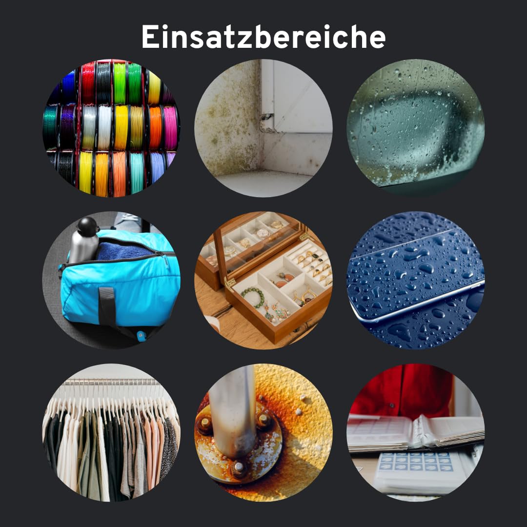 ["A dehumidifying agent for good protection against mold and corrosion", "Grain size: 2-5 mm (for a large surface area for moisture absorption)", "Color change from orange to (dark) green", "Absorbs up to 40% of its own weight in moisture", "Can be regenerated in the oven at up to 110°C at any time"]