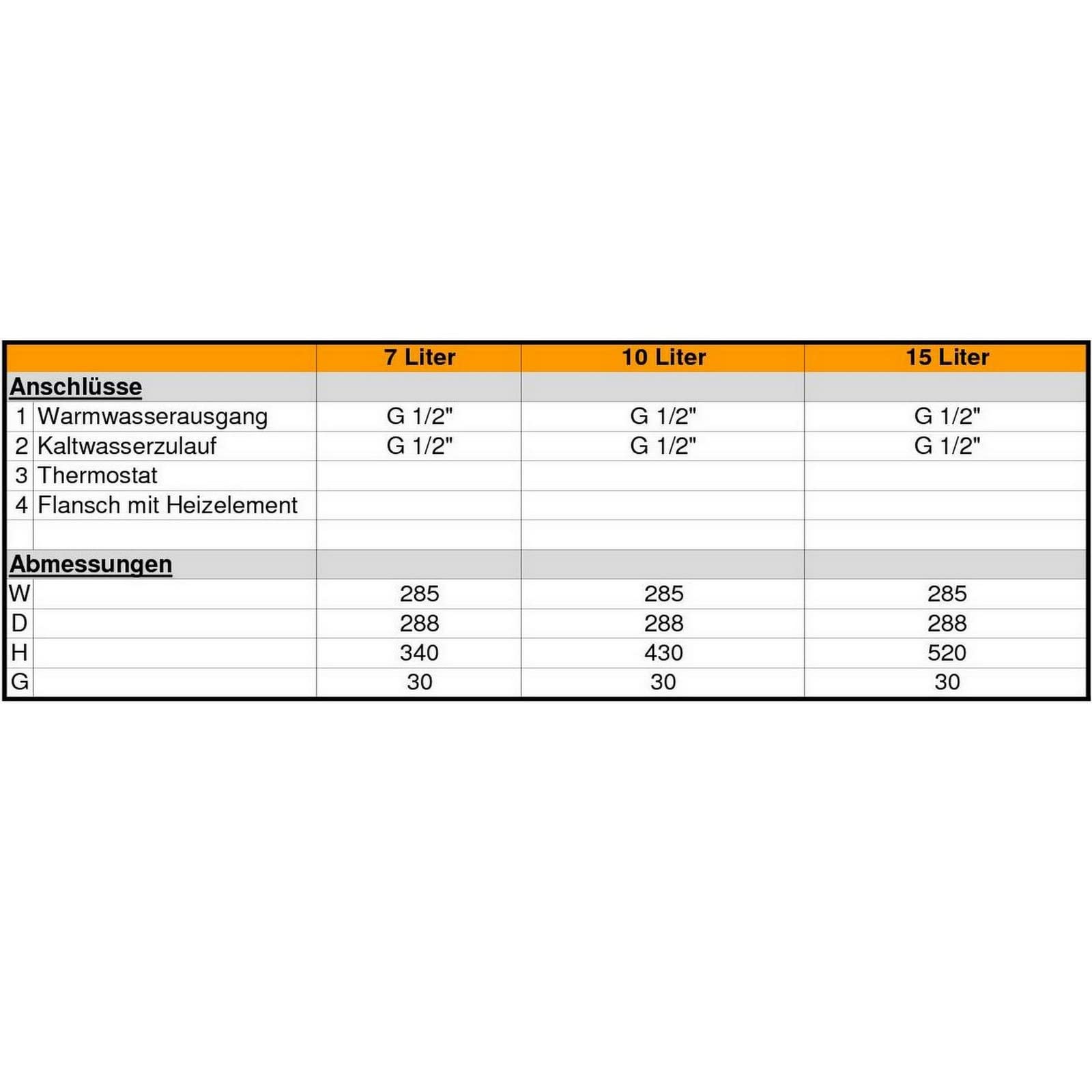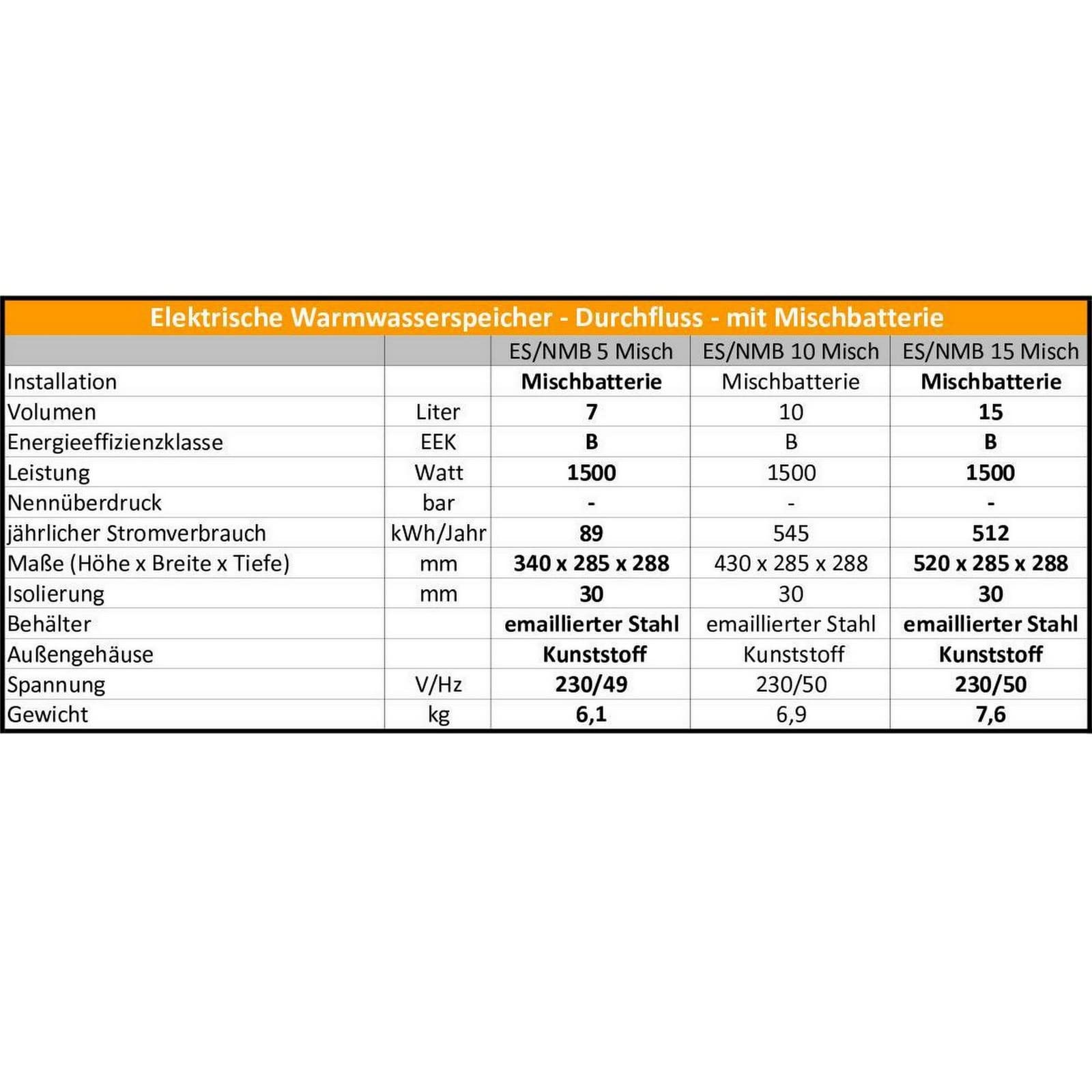 "10-liter wall-mounted hot water heater with mixer tap, including sacrificial anode and hanging bracket. Power consumption/connection: 1500 watts, 230V - 50 Hz. Weight: 6.9 kg. Height: 430 mm / Width: 285 mm / Depth: 288 mm"