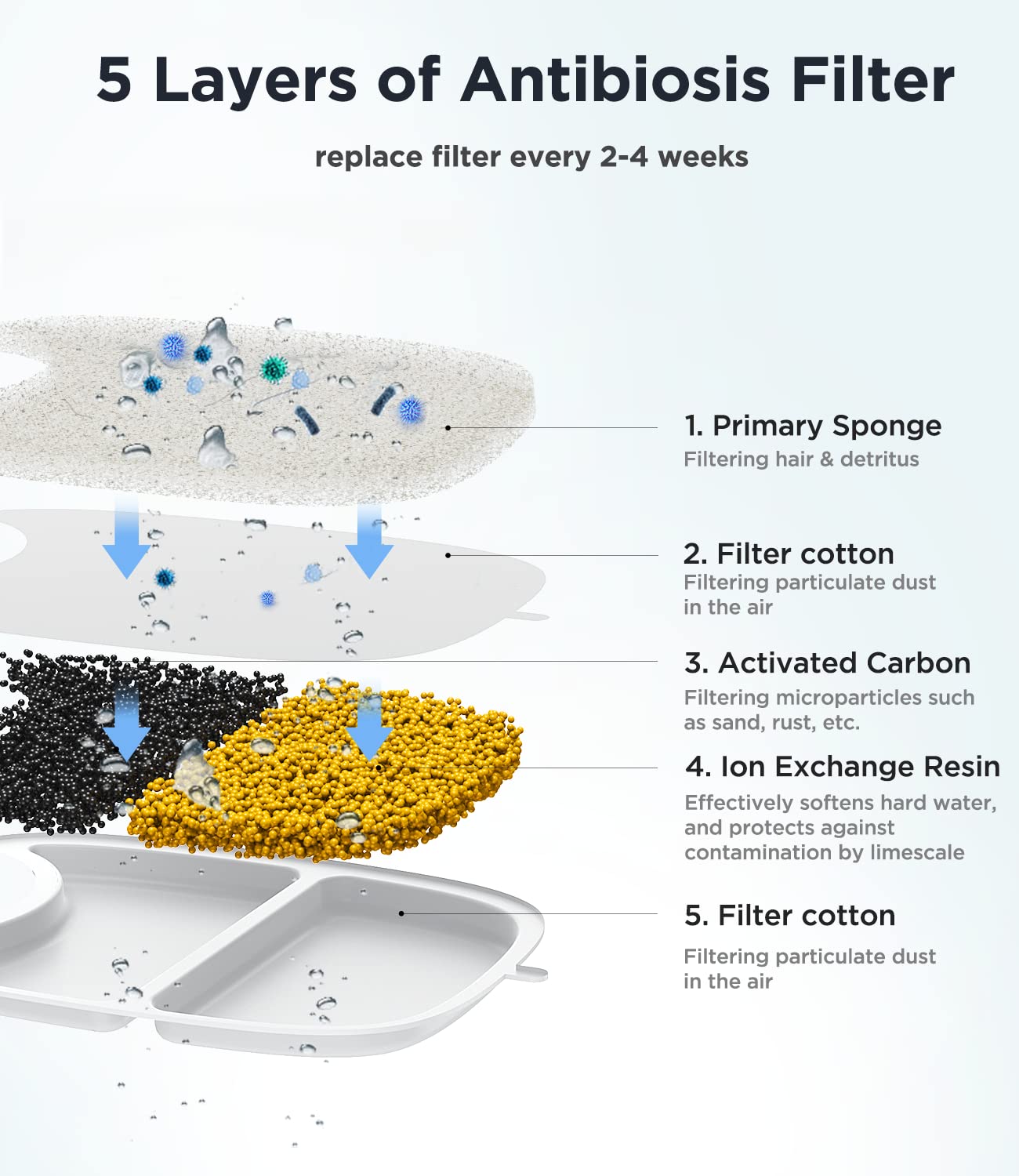 "Every sip is clean & fresh: provides the cat with fresh water through a 5-layer filter system (pre-filtered sponges, high-density cotton, ion exchange resin, coconut shell activated carbon, sponge for water pump)