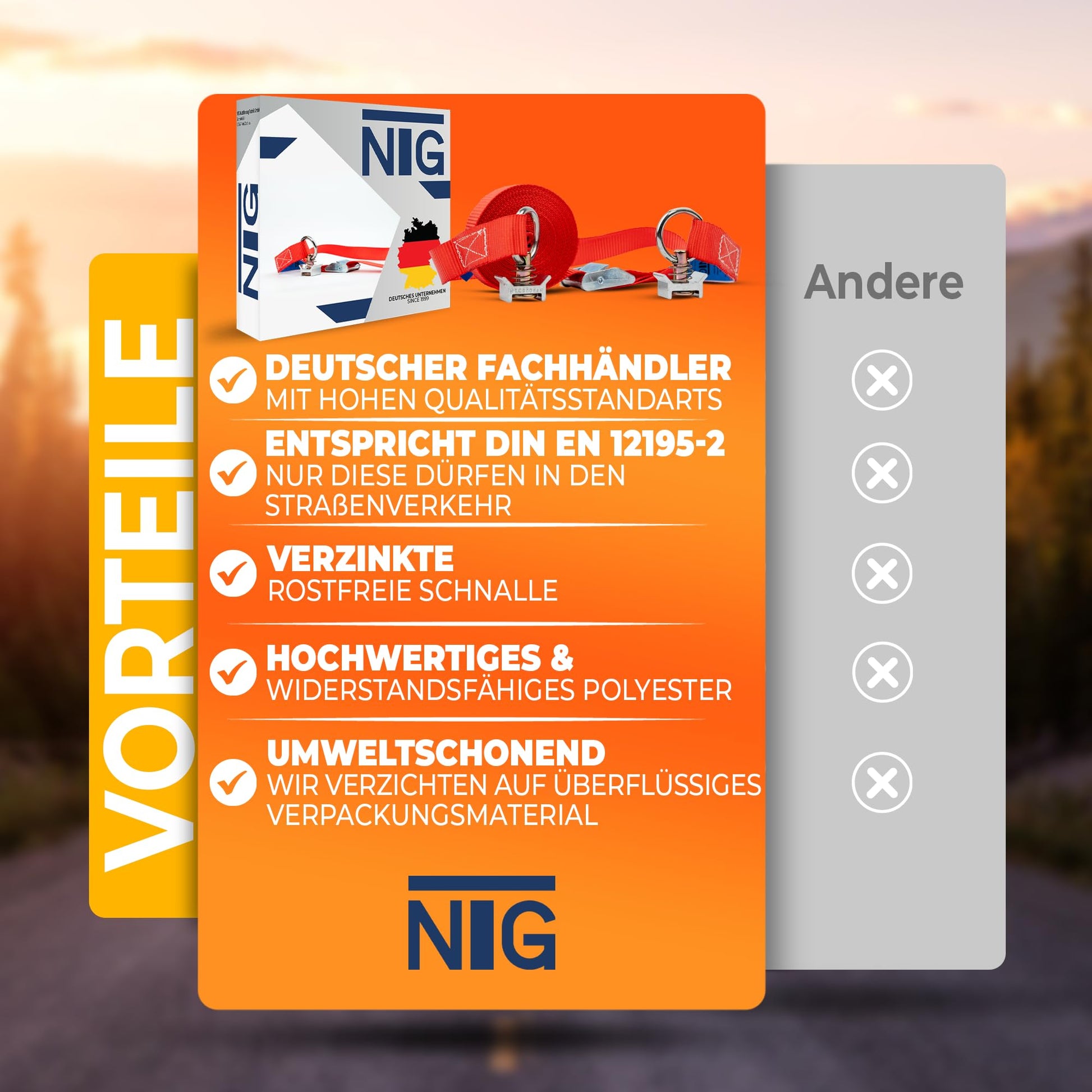 ["SET PRICE: 10 Pieces Ratchet Straps with Buckle for Airline Rails | Length 196.85 inches (Fixed end 19.68 inches, Loose end 177.17 inches) | Max. load 330 lbs in a straight pull, 660 lbs when looped","NTG stands for high-quality products, which are produced according to DIN standards. Always following the motto: Safety first","WITH SAFETY: From material selection to final inspection. Nothing is left to chance, ensuring you always receive reliable tie-down straps"]