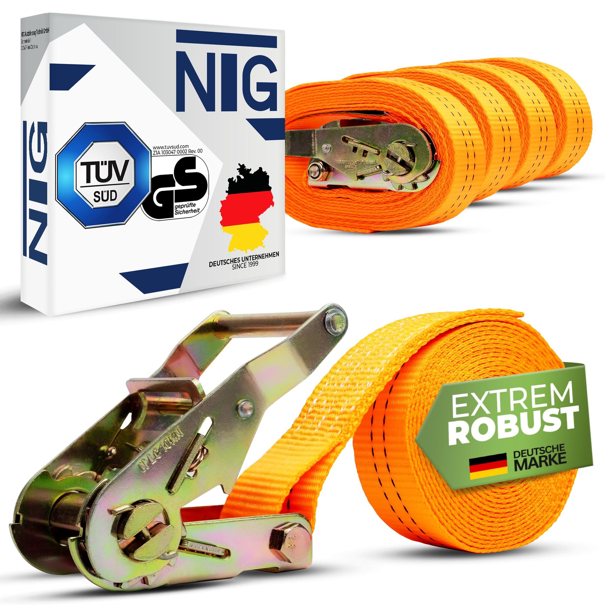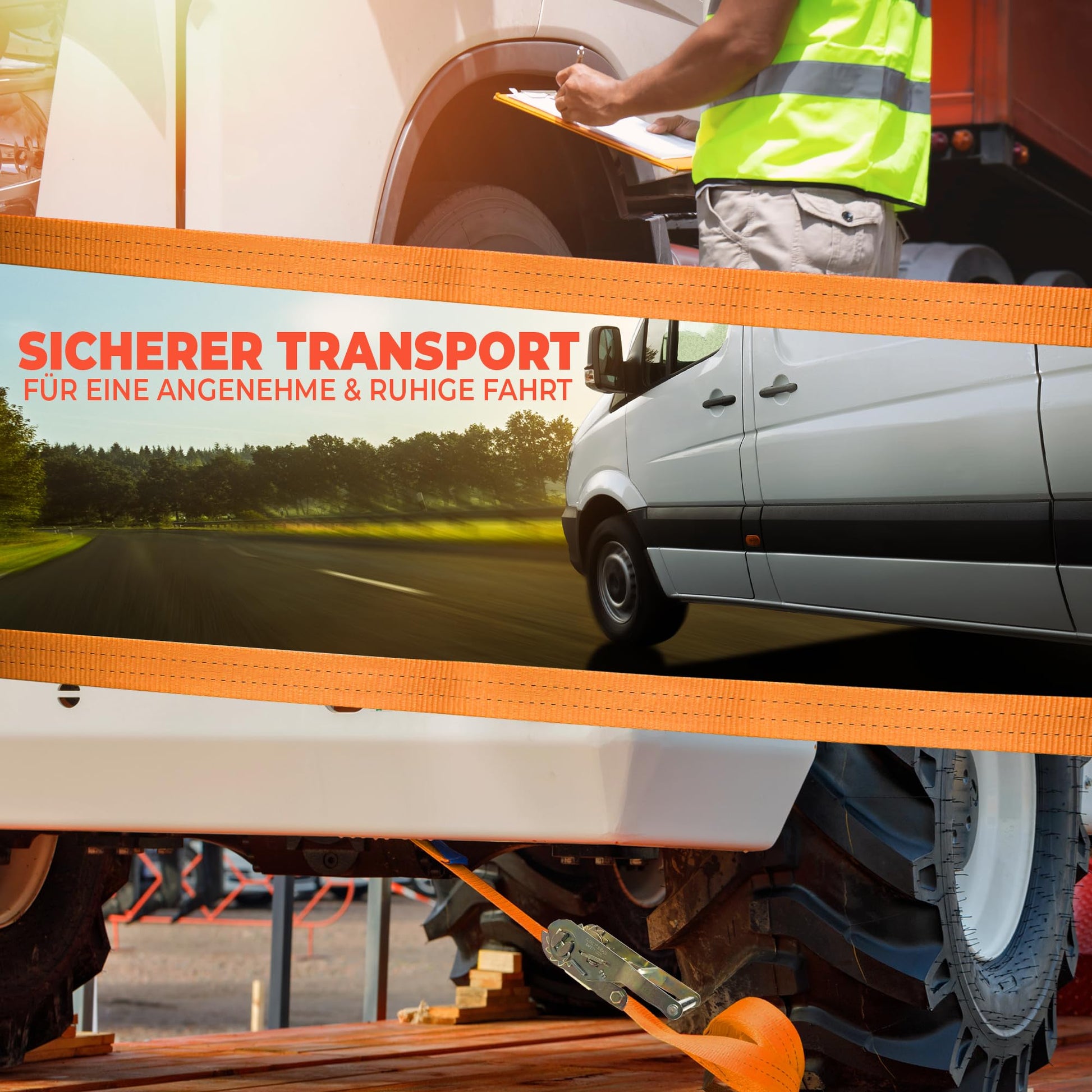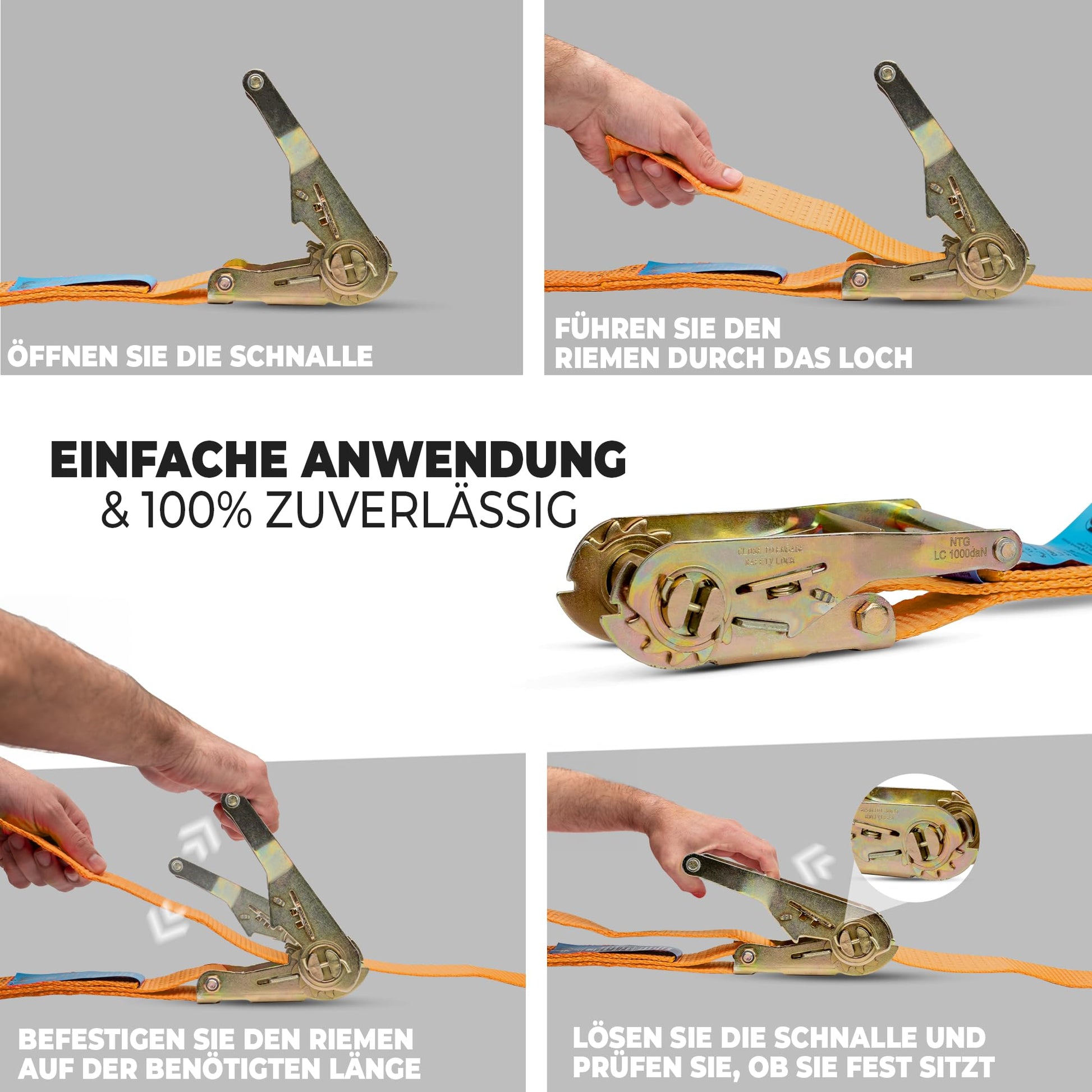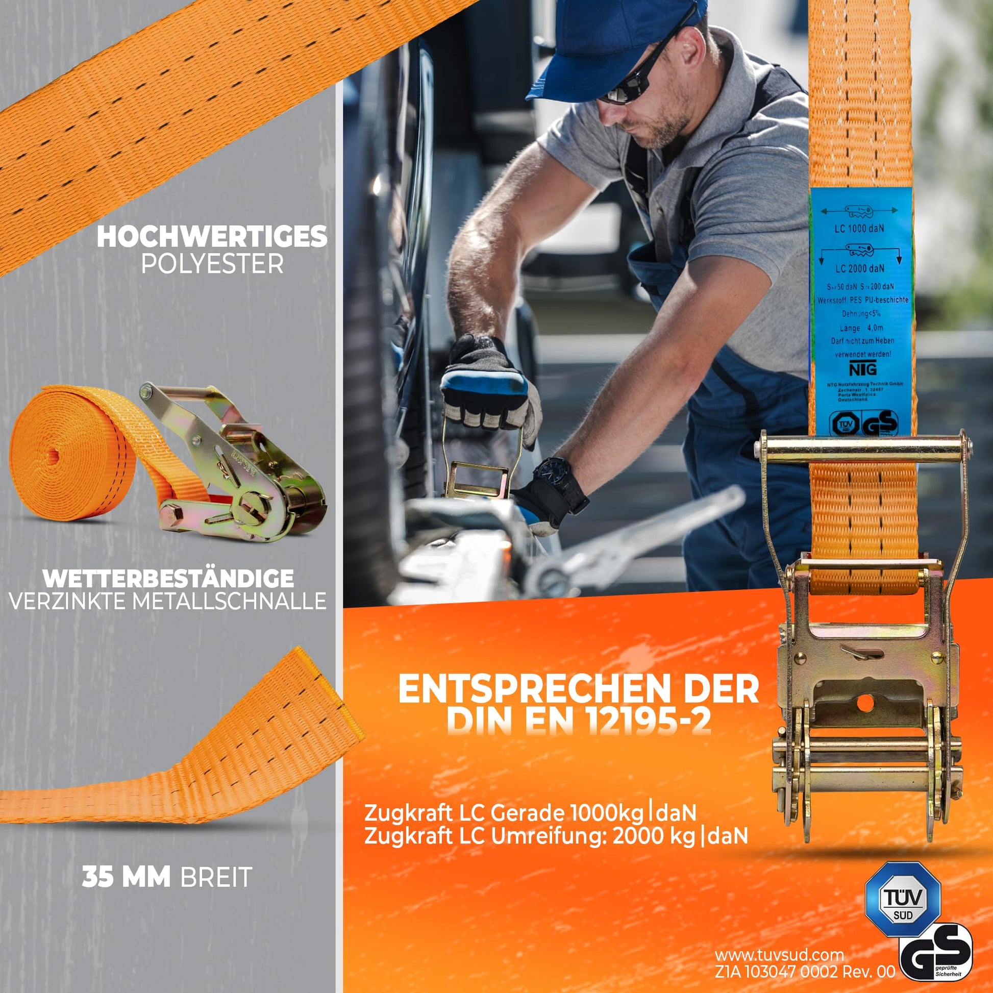 10 pieces of tie-down straps, 4m long, 2t (2000 daN, KG) - TUV/GS tested - one-piece, 35mm wide with galvanized steel ratchet - sturdy & weatherproof -