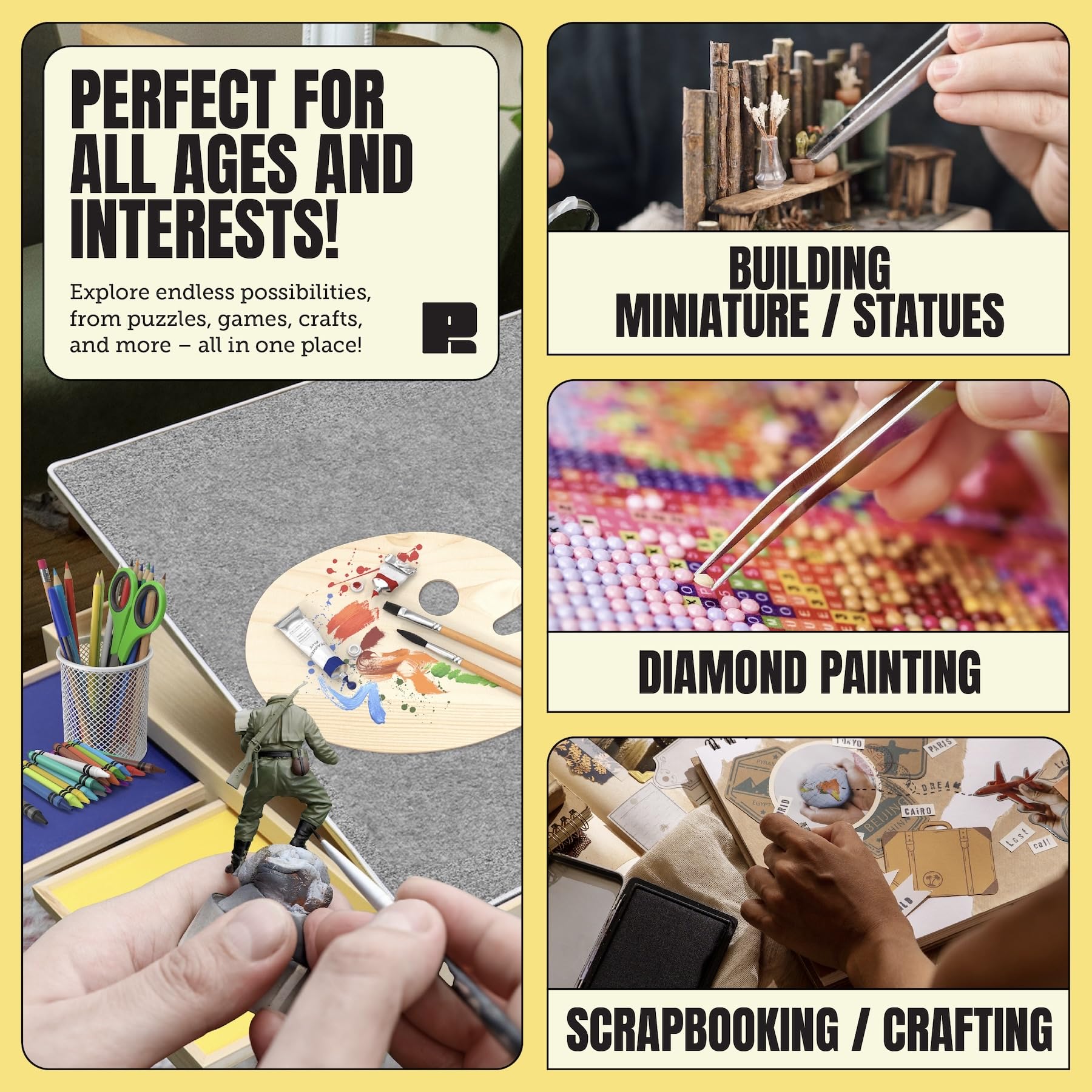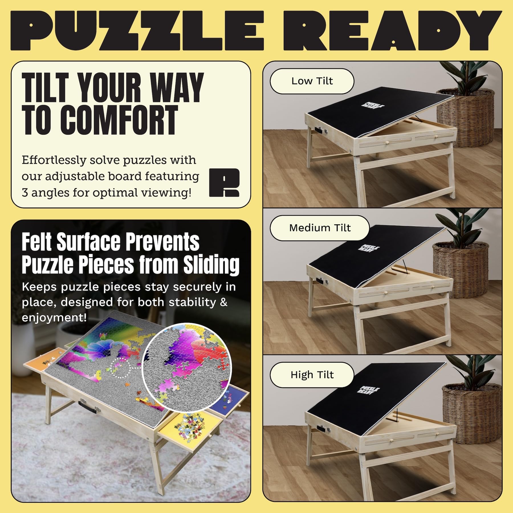 ["Family Fun Puzzle Table with Legs! This stylish puzzle table with drawers offers a sturdy structure and a soft felt work surface, perfect for organizing and assembling puzzles with the whole family","Customizable 3 tilt angles - Enhance your puzzle experience with the 3 adjustable tilt function. This innovative feature provides comfort and optimal ergonomics, reducing neck and back strain","Premium 1000 Piece Puzzle Table with Cover - Your new wooden puzzle board measures 24\" x 30\" and fits most 1000-piece puzzles. Four color-coded compartments and the cover keep your puzzle secure and organized","Portable Puzzle Table with Drawers - Simply cover and store away when you need space. With the convenient carrying handle, you can quickly store the puzzle. Ideal for storing under the couch or bed","Designed for Puzzle Enthusiasts - Colorful drawers for sorting, removable puzzle mat for protection from pets and children. Carrying handle and non-slip feet protect your living room table from scratches"]