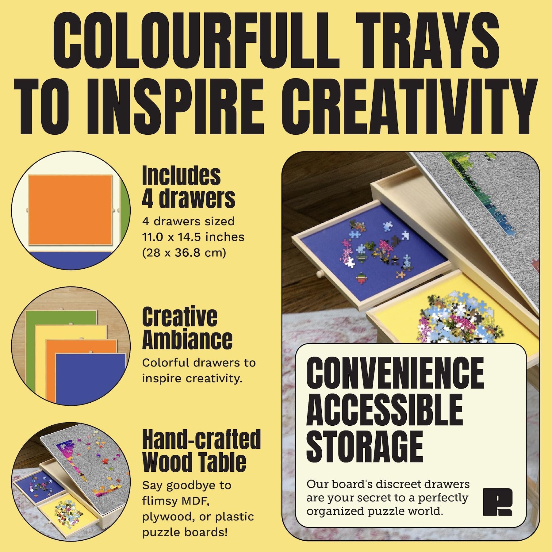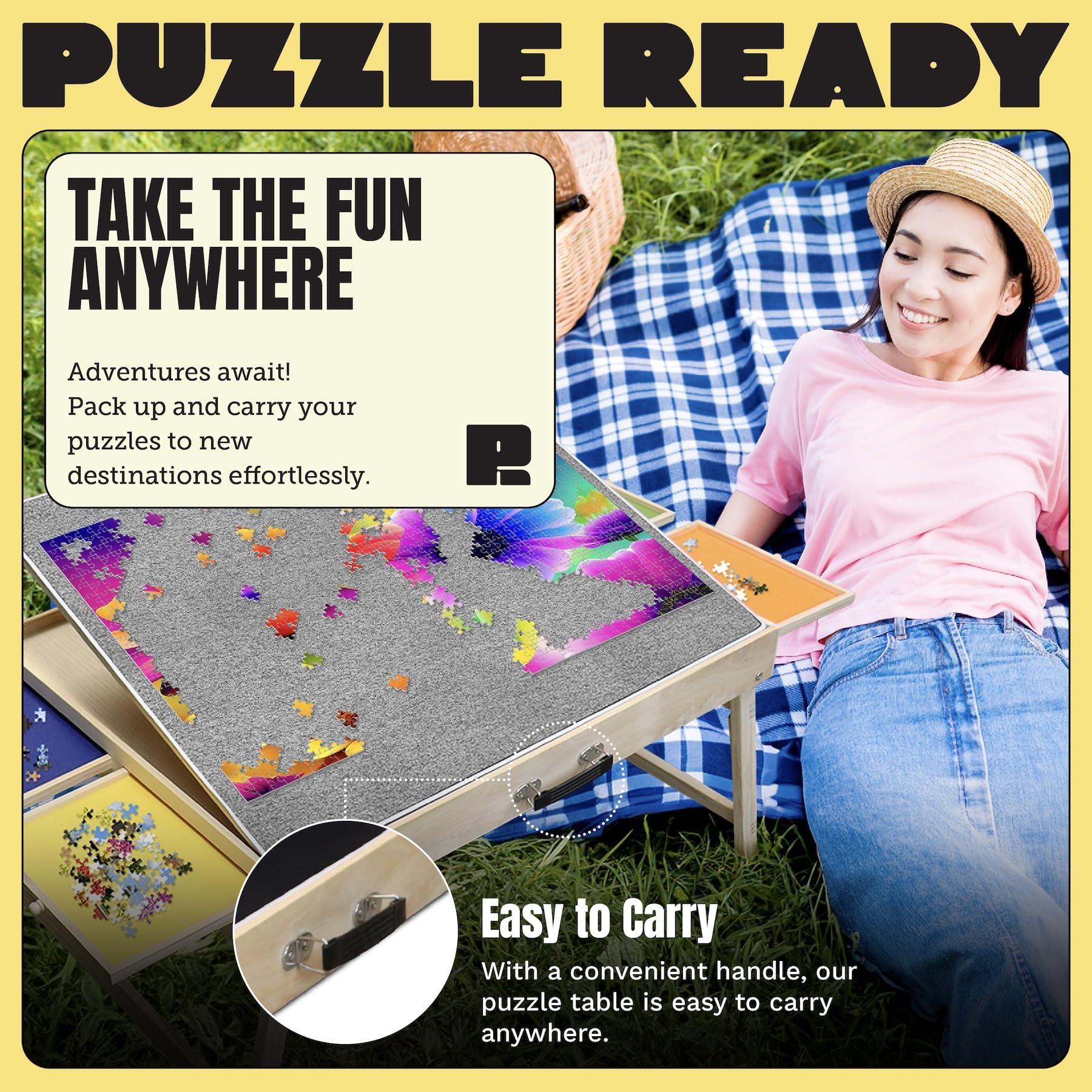 1000 Piece Wooden Puzzle Table - 30" x 24" Folding Puzzle Table with shorter legs, 4 colored drawers, 3 tilt angles & puzzle cover mat - Portable Puzzle Table