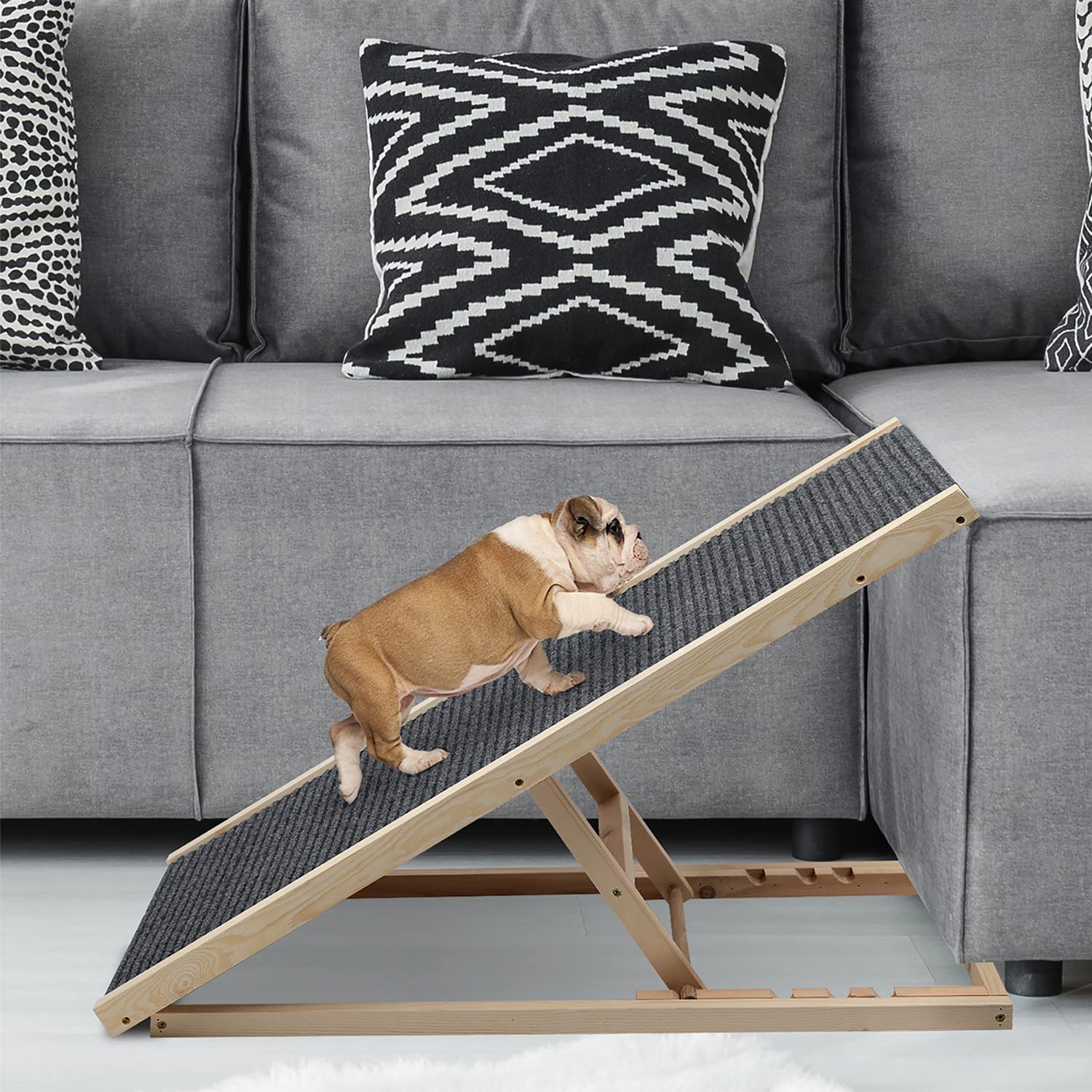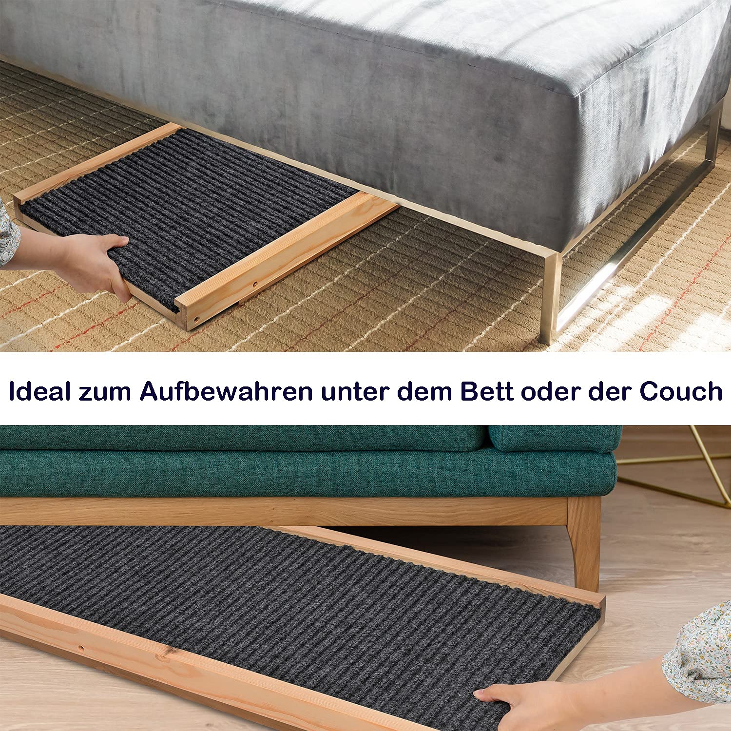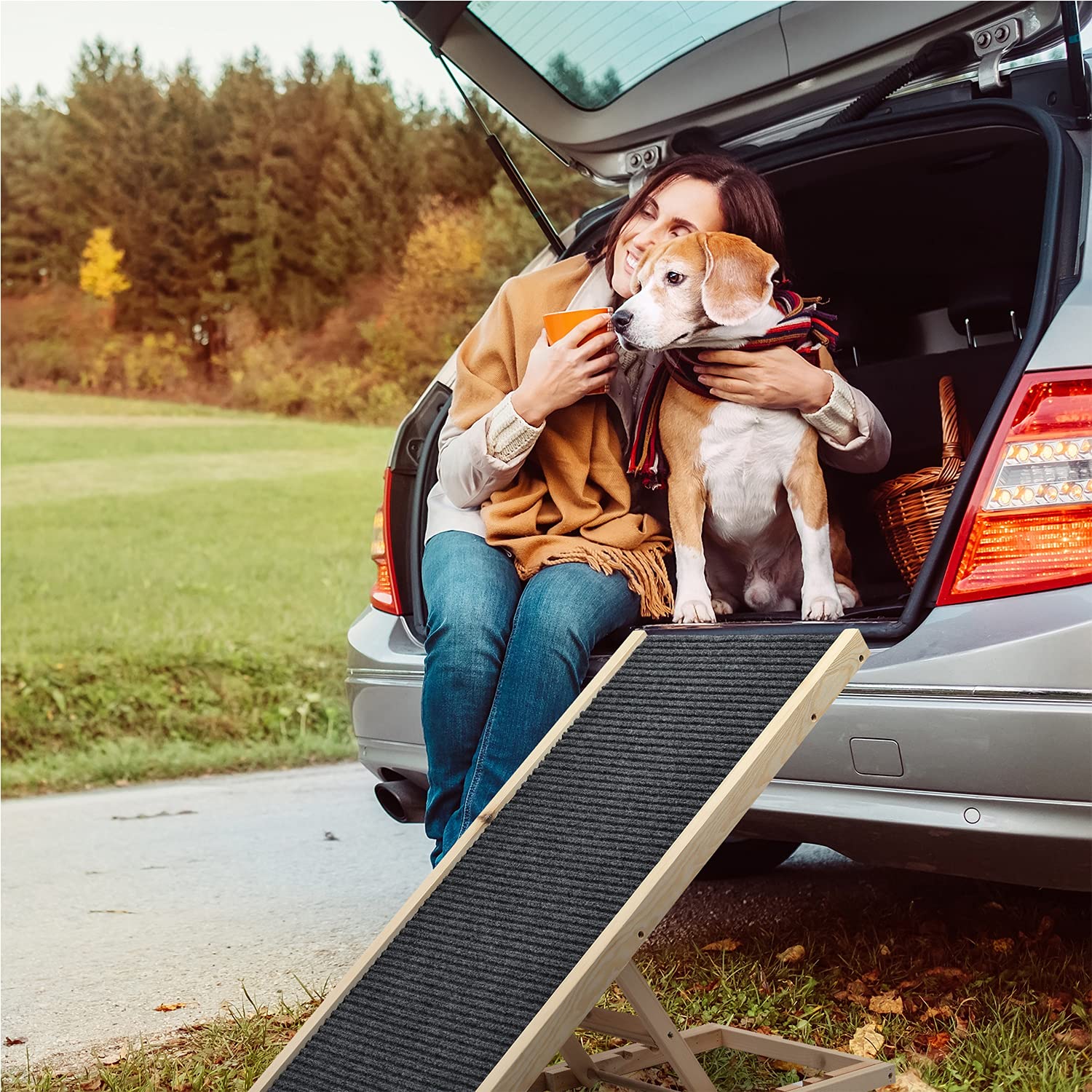 "It is made of a high-quality pine wood frame, very strong and durable, and can support up to 150 kg. It can accommodate pets of different sizes. 100 cm x 40 cm. The height of the dog ramp is adjustable. The pet ramp can elevate from 30 cm / 40 cm / 50 cm / 60 cm (4 separate heights). Note: Please measure the size before purchasing. The dog ramp is great for dogs, cats, puppies, rabbits, who need extra help getting into the car, van, sofa, caravan, bed, couch, small stairs, or rock outcrops. The adjustable dog steps have a textured gripping surface to prevent slipping and falling. It is ideal for pets or people with limited mobility. The sturdy mobile dog steps can support over 150 kg and provide a comfortable walking surface for all pets. 👍 Upgrade non-slip fabric"