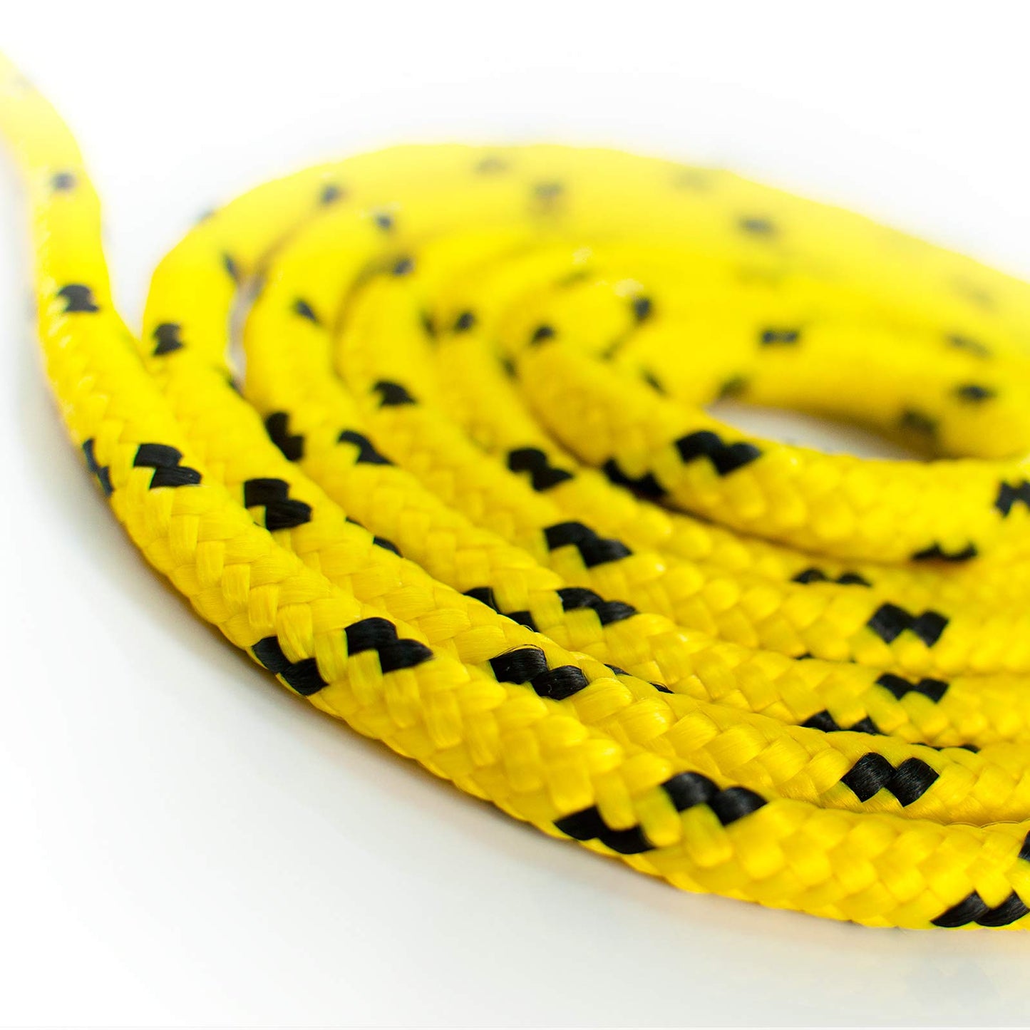 100m yellow 8mm polypropylene rope with a load capacity of up to 750kg. Braided textile cord made of plastic for various uses.