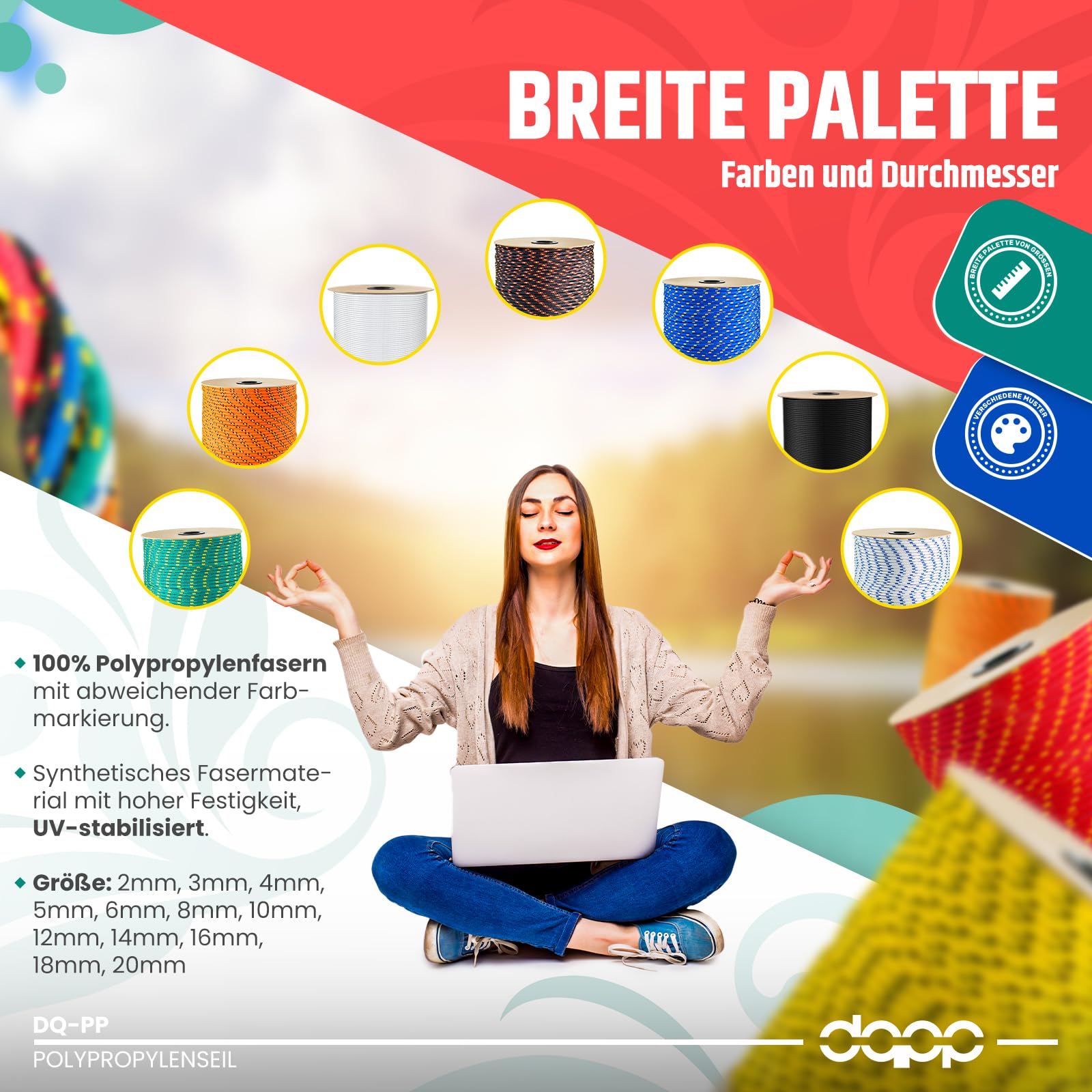 "APPLICATION: Polypropylene ropes are extremely light and are particularly suitable for outdoor use, camping, securing tarpaulins, as tent lines, clotheslines, and for various private applications around the house and garden. They are also resistant to dirt."]