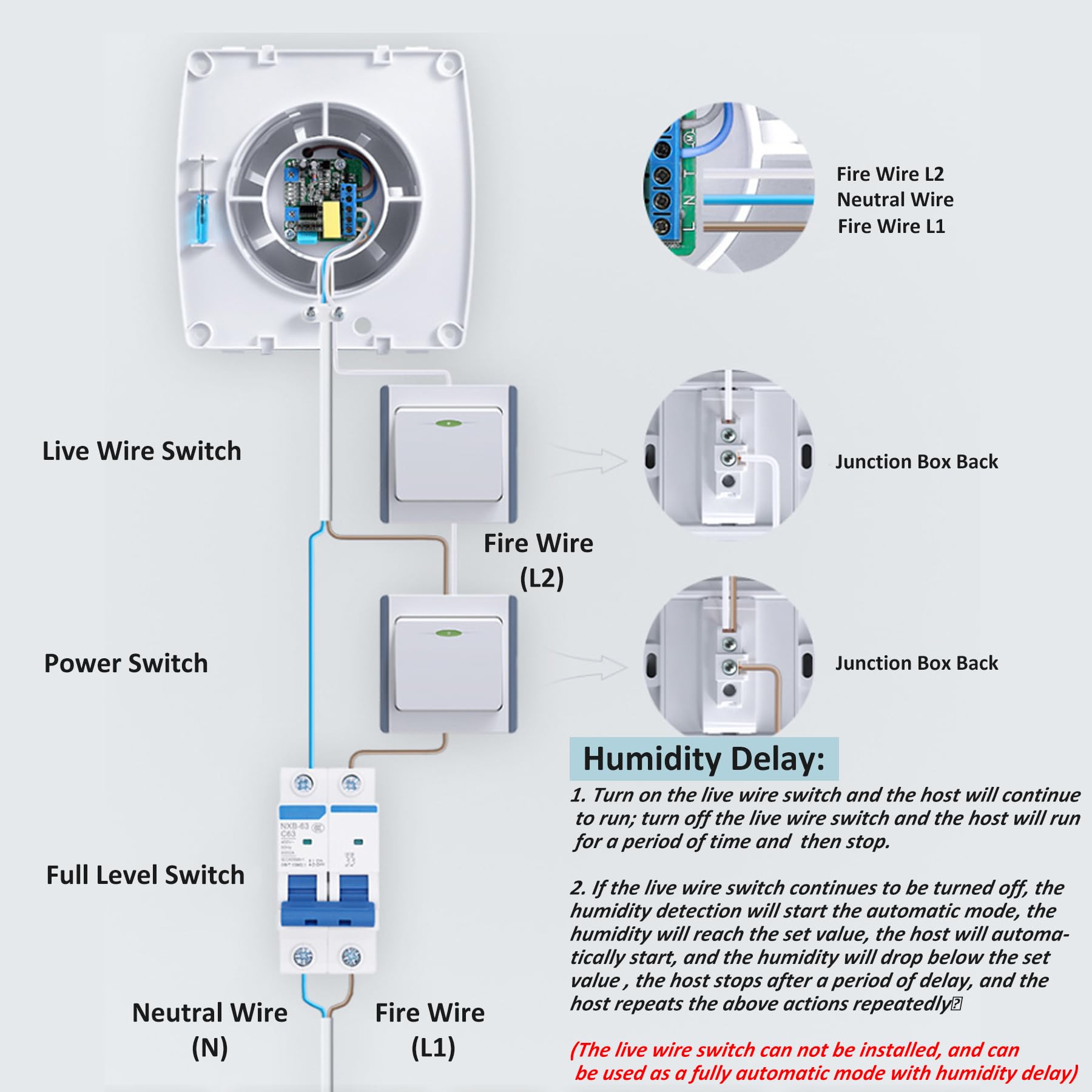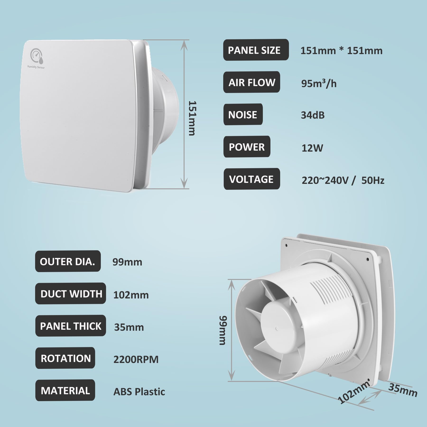 ["IPX4 WATERPROOF: The bathroom exhaust fan is made of high-quality ABS material, the front panel highlights its black color which fits modern industrial home decoration. Ultrahigh waterproof rating of IPX4 to place it where it needs to be moist.","HIGH PERFORMANCE: The bathroom exhaust fan with full copper with ball bearing ensures stable and long-lasting performance. Performance of the 100mm exhaust fan: Power: 12W; Air flow: 95m³/h; Noise: 34dB; Operating voltage: 220 ~ 240V/60 Hz.","100mm COMPATIBLE: The outer diameter is 100mm (4 inches), specially designed for 100mm round duct systems or holes. Ideal replacement exhaust fan for toilet, WC, kitchen, bathroom, office, garage or any rooms where air needs to be exchanged.","Bathroom fan with timer: Exhaust fan comes with a controlled timer with an operation time of 5 to 30 minutes.","BACKDRAFT DAMPER & MOUNTING RING: The package also included a 2-door backdraft damper and a quick mounting ring for window installation. In any case, if you need a ceiling mounting, please remove the backdraft damper of the bathroom exhaust fan to achieve maximum airflow."]