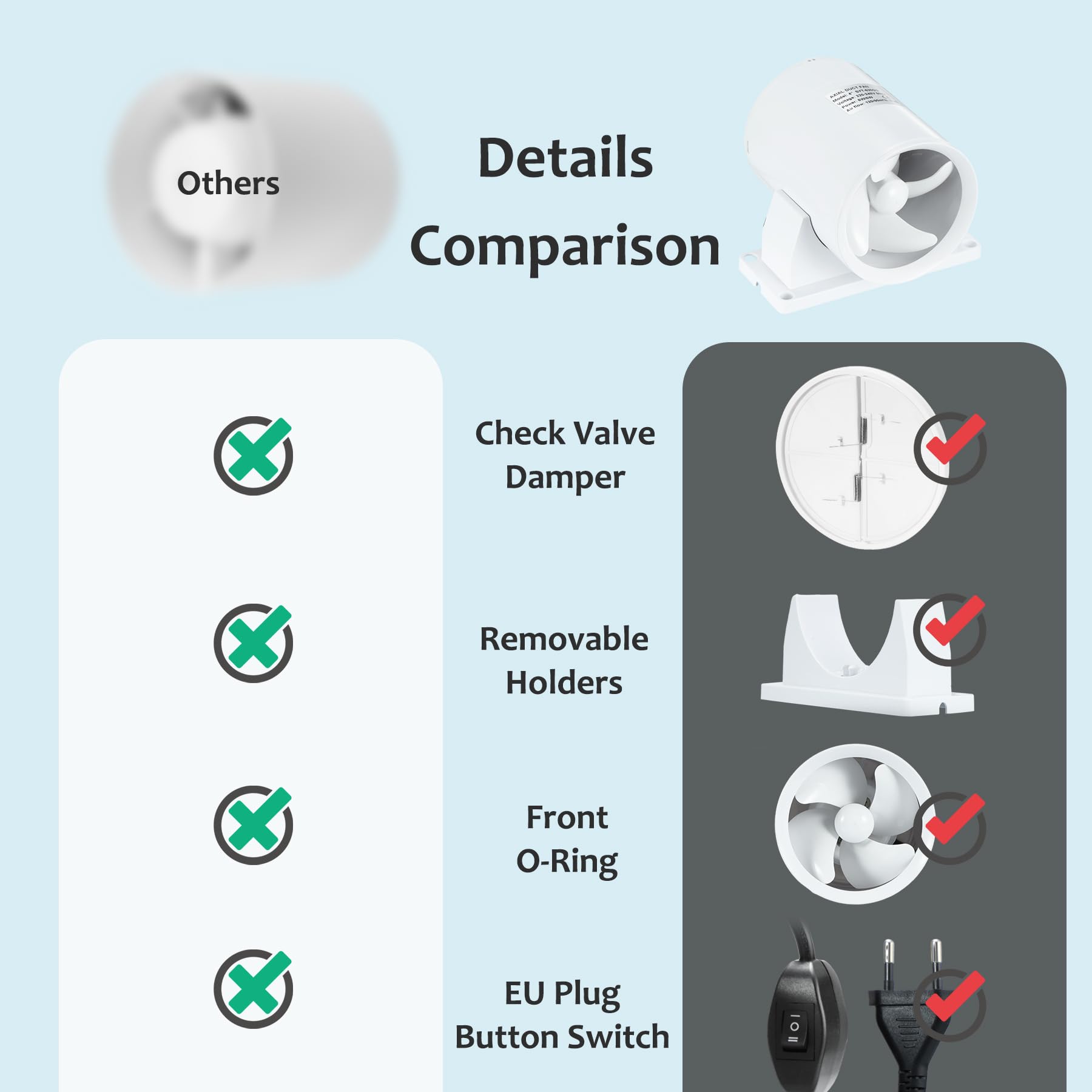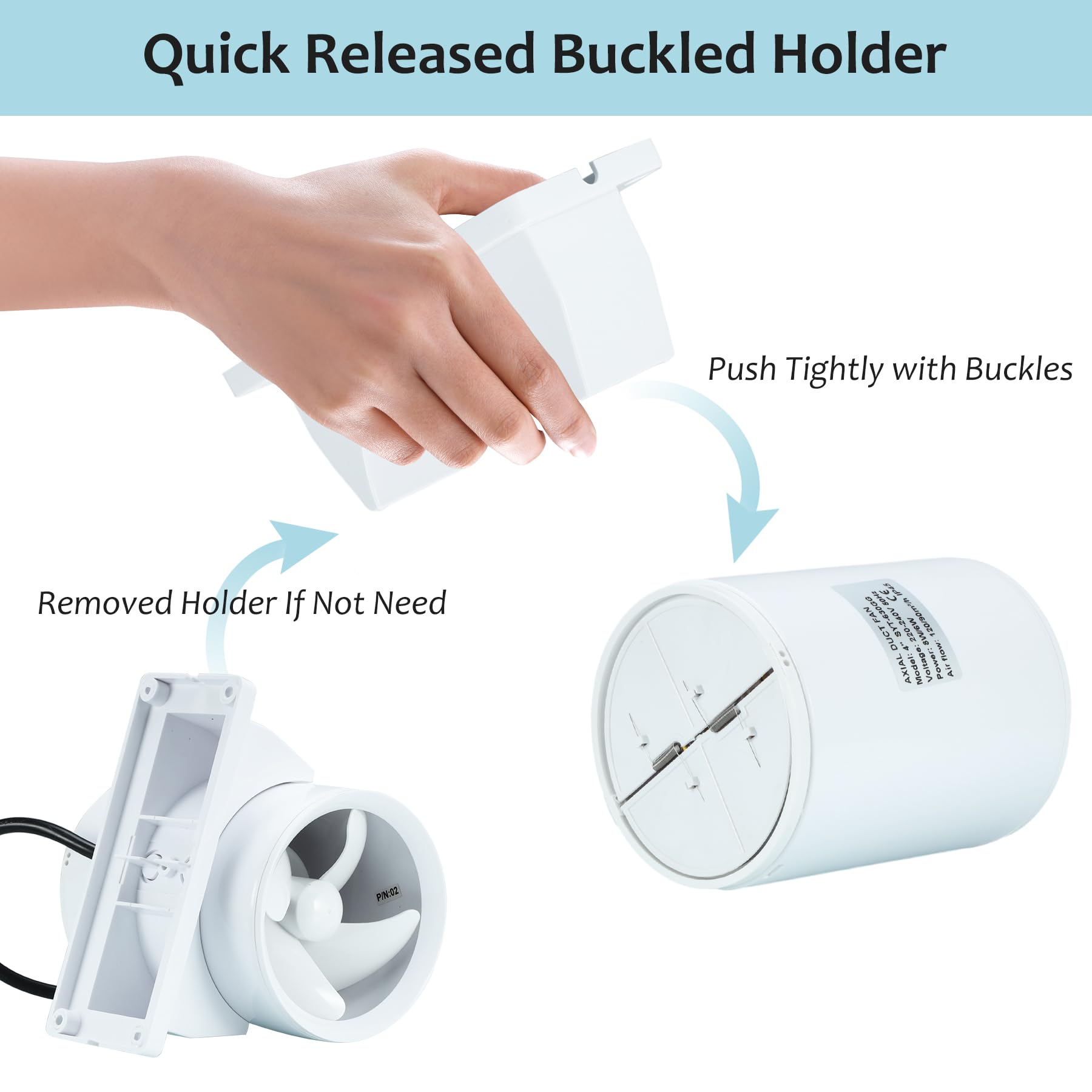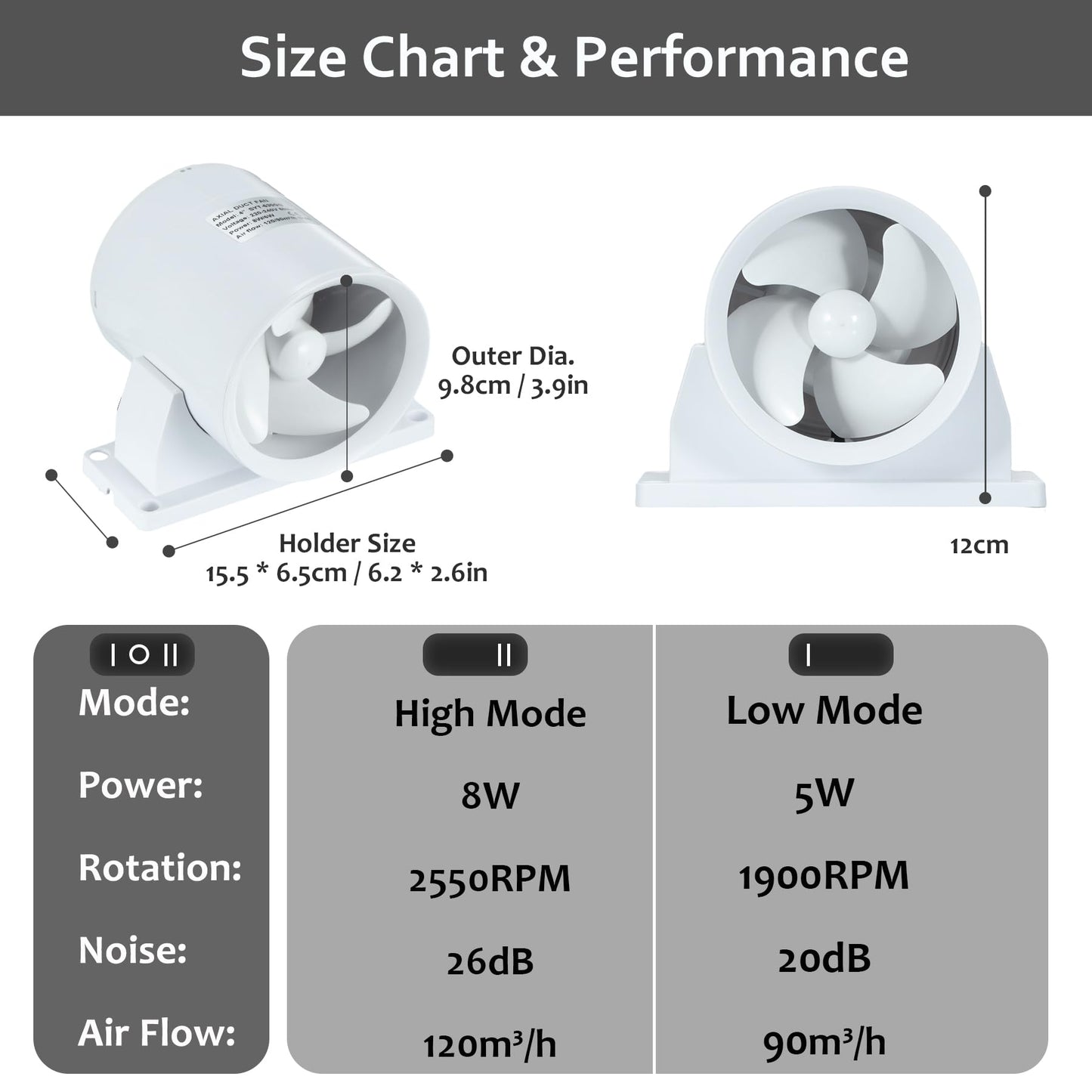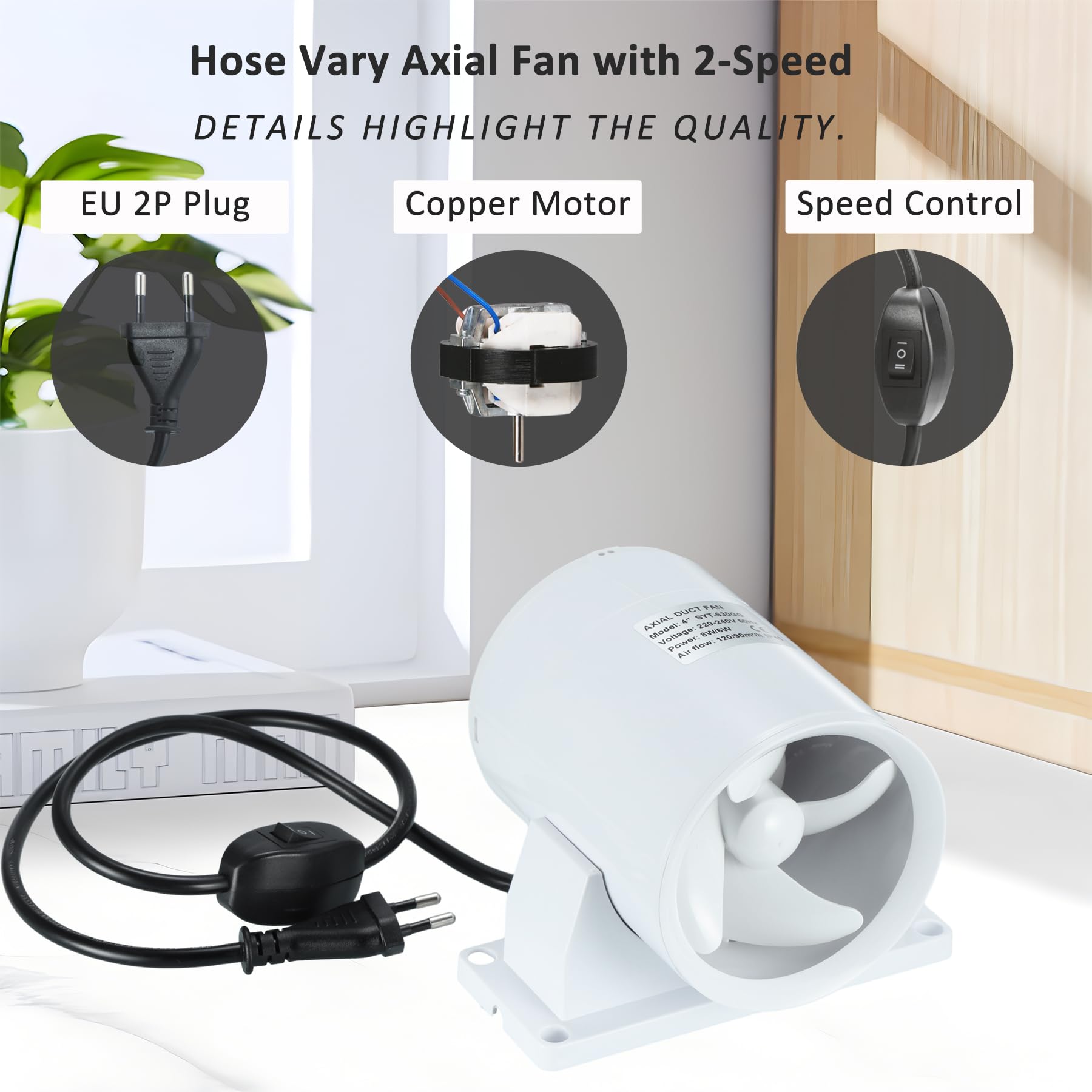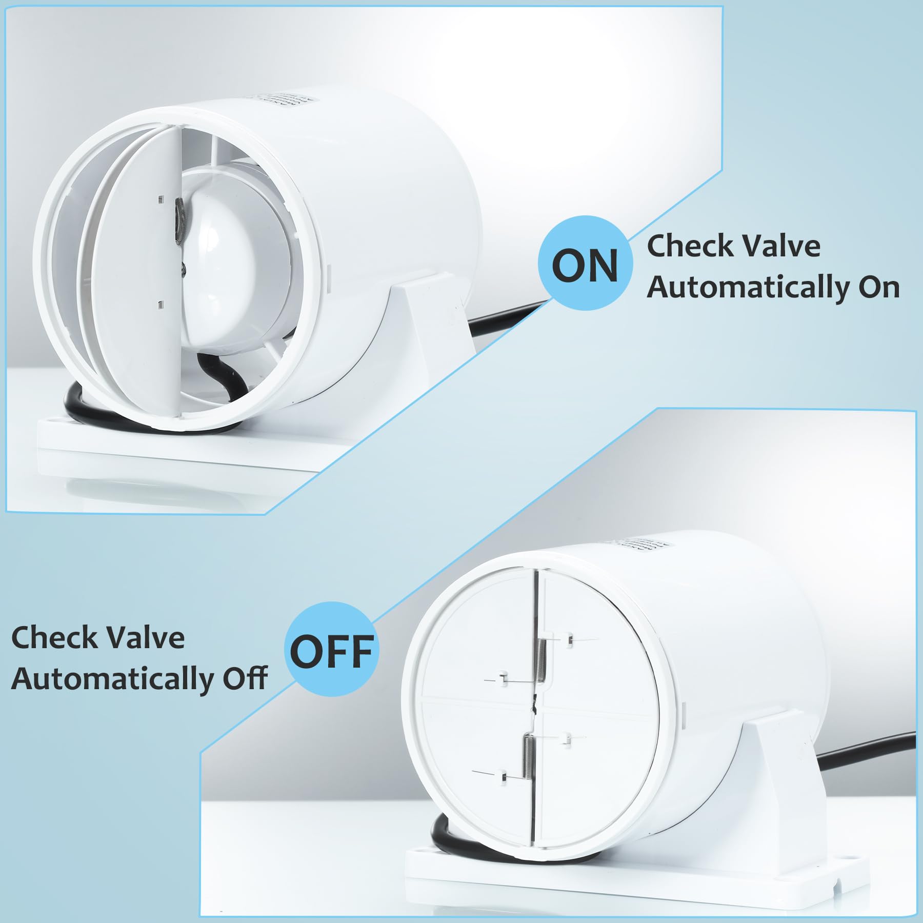 ["ABS MATERIAL: The fan body is made of high-quality ABS material and increased support for stable operation when using a ceiling or table mount. Ball bearings ensure long-lasting ventilation function.","HIGH/LOW 2-STAGE: High-speed performance: Power: 8W, 2550 RPM, 26dB, 120m³/h. Lower speed performance: 5W, 1900 RPM, 20dB, 90m³/h. Waterproof: IP45; Working Voltage: 220V/50Hz.","BACK DAMPER & THICK RING: Specially designed with a back damper that effectively stops air from returning inside. Spring automatically holds two plastic doors open/closed when air flows through. The channel configures a thickened ring to reduce air force and ensure the blade's working safety.","WIDE APPLICATION: The duct fan can be used in an HVAC duct system to improve ventilation better. To build a simple and small ventilation system with your 3D laser printer box, spray box, or other small experiment in box size; To start with your grow tent project, helping exhaust or blow air for your plants or seeds.","REMOVABLE BRACKET: The axial fan has been upgraded with a removable bracket for easier installation in different situations. Mount the base on the desk or securely on the wall; Remove the base to hide it in a duct pipe."]