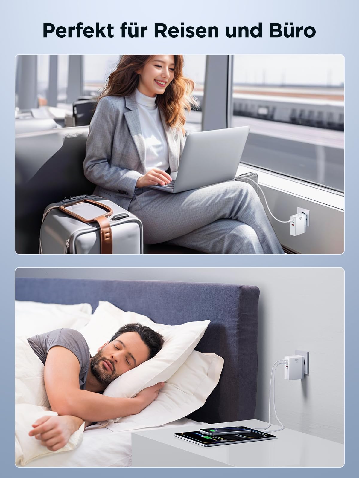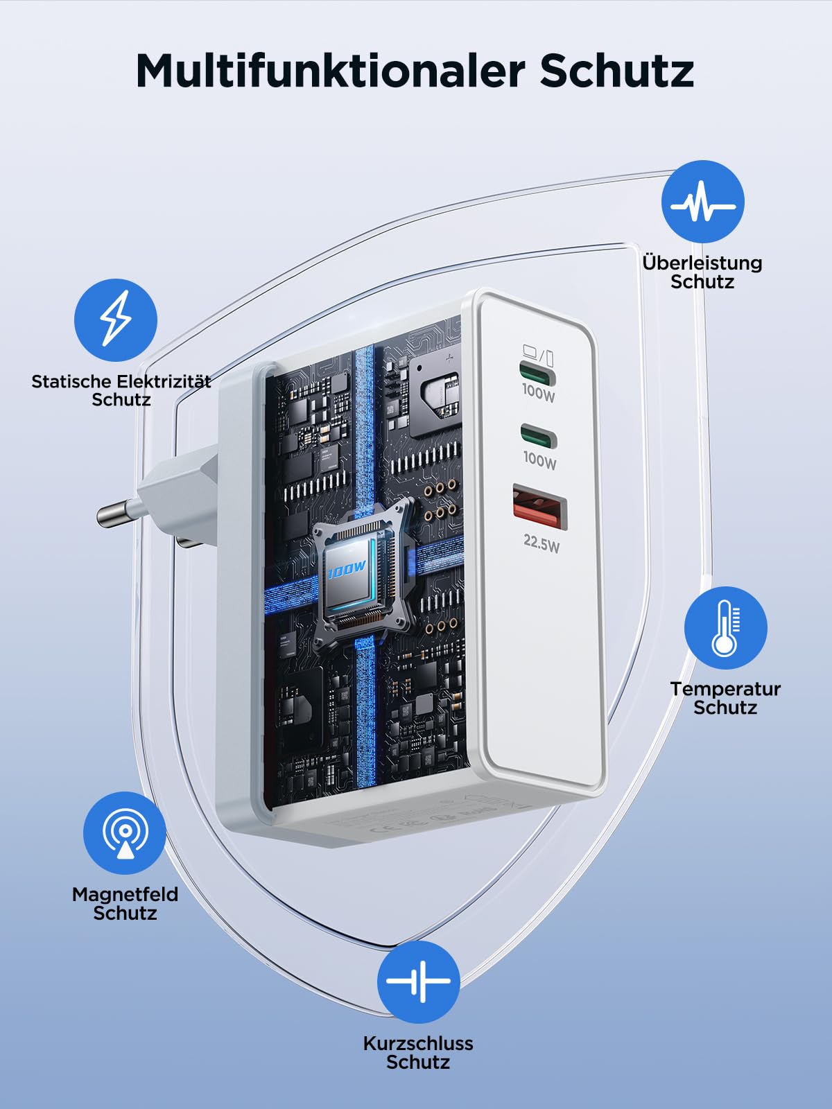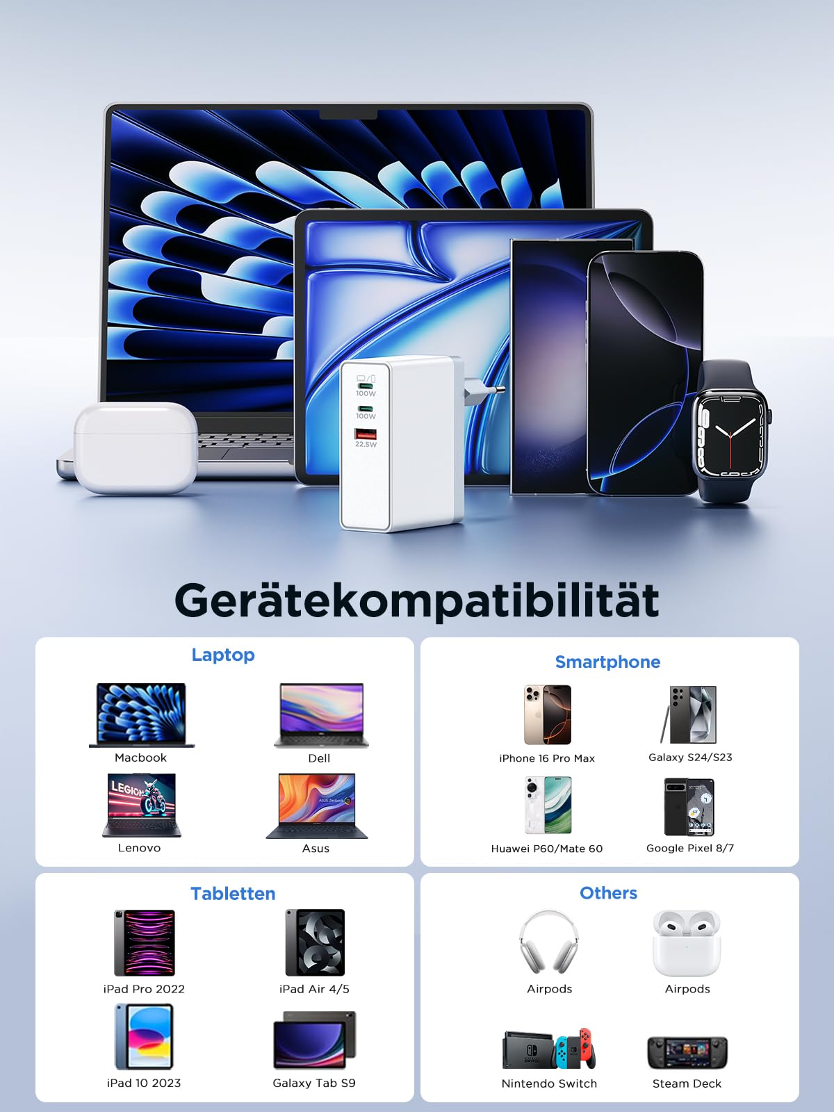 ["3 in 1 Multiple Charger】: Our 100W charger with 3 ports (2× USB-C + 1× USB-A) offers maximum flexibility and speed. Perfect for laptops, smartphones, tablets, and more. Charge up to three devices simultaneously without any loss of performance. With Power Delivery 3.0, Quick Charge 4.0+, and PPS, it is ideal for MacBooks, iPhones, Galaxy devices, and gaming handhelds like the Steam Deck.","100W High-Speed Charging:】: 100W USB-C fast charger charges a MacBook Pro 16" from 0% to 50% in just 30 minutes, while the other ports provide up to 30W or 18W for smartphones or tablets. No more waiting. Full power for your productive everyday life!","Universal Compatibility】: Aioneus PD Charger compatible with MacBook Pro 16" (M1 Pro/Max, M2 Pro/Max, M3 Pro/Max), MacBook Pro 14" (M1 Pro/Max, M2 Pro/Max, M3 Pro/Max), MacBook Air 13" (M1/M2/M3), MacBook Pro 13" (Intel/M2 2022), Dell XPS, HP Spectre, iPhone 16/15/14, Galaxy S24/S23, iPad, Pixel, and more. One charger for your entire ecosystem, no cable clutter, no compromises!","Intelligent Protection】: 3-port power adapter with multiple overload protection (over-voltage, over-heating, short circuit) ensures safe charging. GaN chips reduce energy losses and keep the device cool even at full load.","Compact & Travel-Friendly】: Thanks to GaN technology, the USB plug charger is 30% smaller than conventional 100W adapters, making it fit in any pocket. The lightweight, sturdy design makes it the perfect companion for travel, office, or home office.","What You Get】: The Aioneus 100W 3-Port USB-C charger (white), an 18-month warranty, 24-hour response service, and a lifetime customer experience. If you have any questions, feel free to contact us.","Intelligent Power Distribution】: 1 device: Up to 100W (USB-C1) for laptops, phones, and tablets. 2 devices: USB1+USB2(60W + 40W), USB1+USB3(80W + 18W), USB2+USB3(60W+22.5W). 3 devices: USB1+USB2+USB3:45W + 30W + 18W (Laptop + Phone + Headphones)"]
