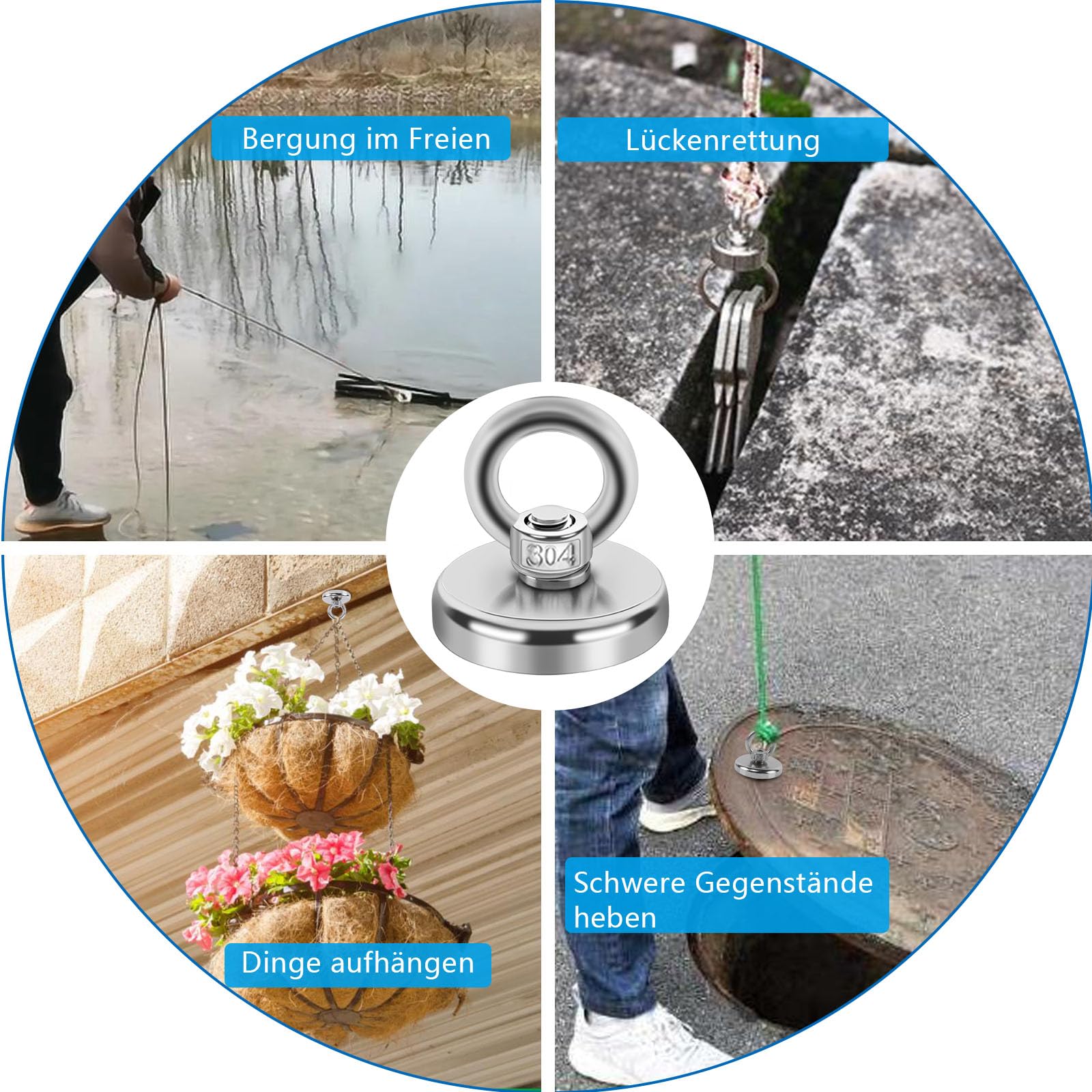 "【Magnet Fishing】: Strong magnets for fishing, lifting, hanging, and holding. Enjoy finding lost treasures in rivers, lakes, wells, canals, or swimming pools. Magnet fishing can also be used as a garage organizer to store garden tools, obstacles, hooks, or other items. Wherever you are, you need an extremely strong magnet.",