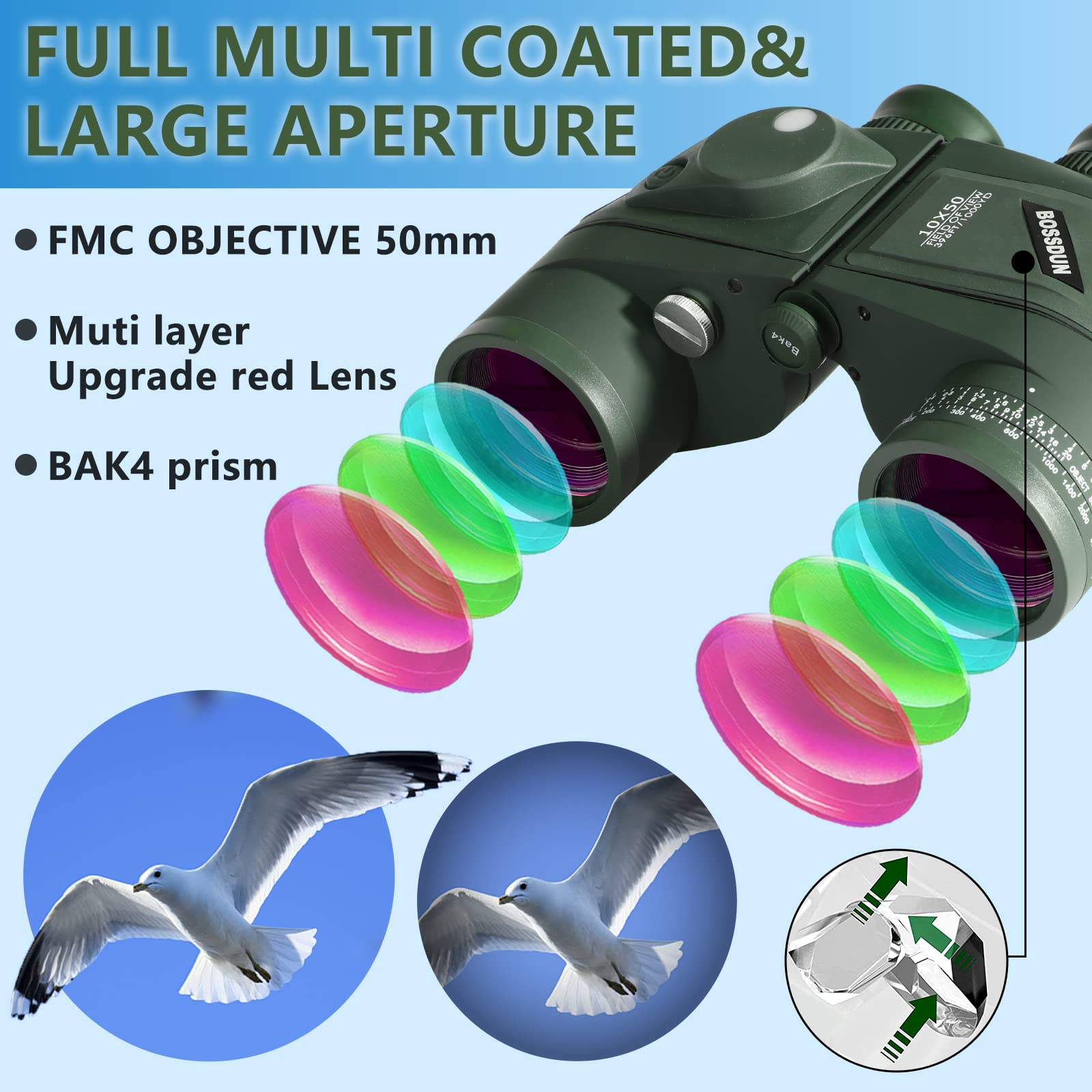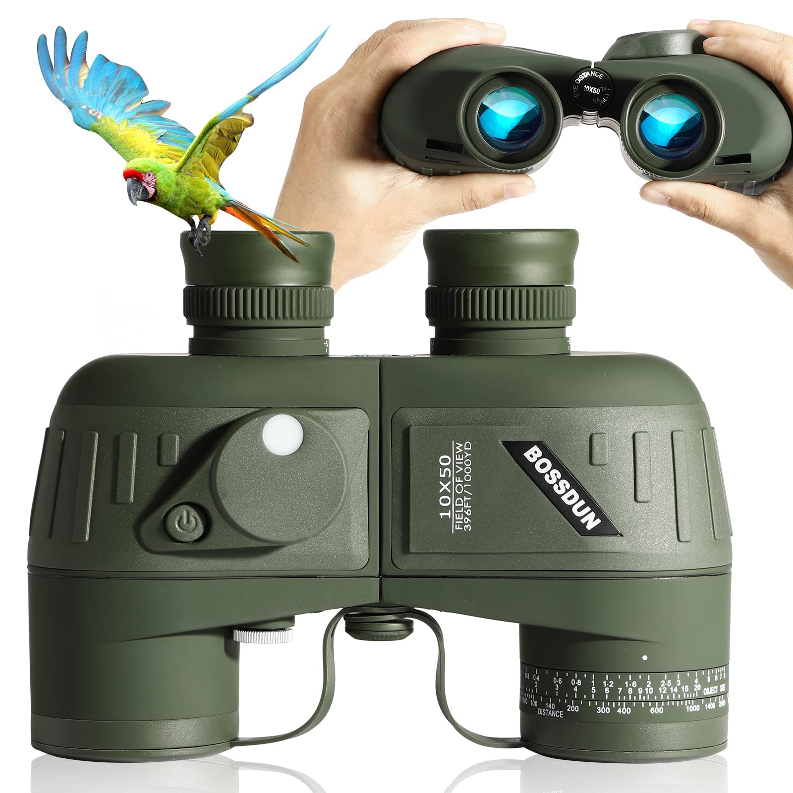 ["【Professional Military Binoculars】 - BOSSDUN binoculars use 10x real magnification instead of 7x optics to reduce costs. Binoculars with 50mm HD objective lenses and 23mm eyepieces provide a wide view and pleasant observation. Bak4 Porro Prisms and FMC Green Film Anti-Reflection Coating reduce reflected light and improve light transmission, making it more comfortable for your view.",