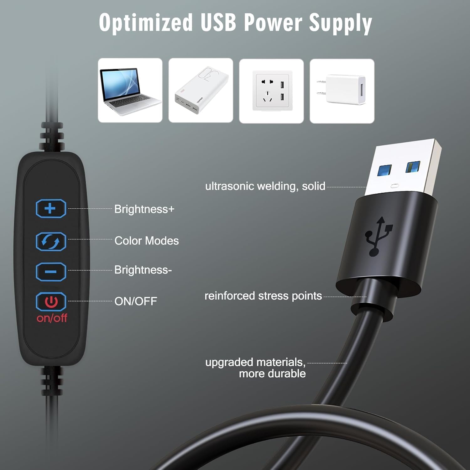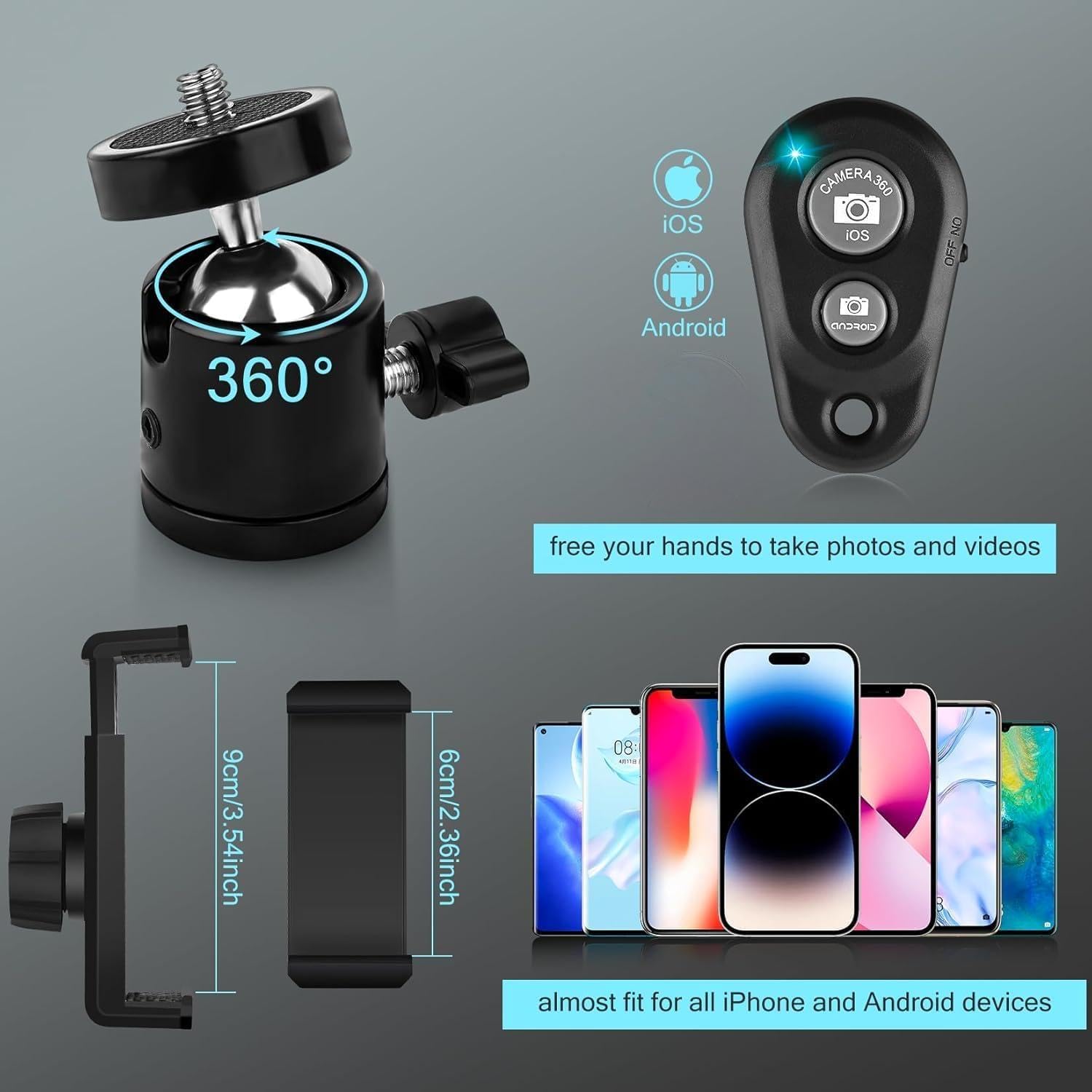 ["Increase brightness and soft light - 184pcs LED beads, with brightness of over 60% circle lights. Color temperature 3200K-6000K, 3 color modes, 10-level dimmable brightness. The inside of the ring light is made of high-quality aluminum plate, ultrasonic welding, with better heat dissipation effect and a lifespan of more than 10000 hours.", "[2023 Upgrade More Stable Four-leg Stand] - The four-leg design gives it a larger contact surface for better balance and stability. The legs are thicker, with stronger load capacity. Made of high-quality aluminum alloy, with four adjustable heights. It can easily stretch from 65 cm/25.6 inches to 142 cm/56 inches, total height reaching 177 cm/69.5 inches when plus the ring light.", "[2PCS Reinforced and Widened Phone Holders] - Can be expanded from 6 cm/2.36 inches to 9 cm/3.51 inches, compatible with almost all iPhone and Android devices, flexible enough to rotate easily in any direction without bouncing. There is anti-scratch design on both sides of the phone clip, so you don't have to worry about scratches when installing the phone.", "[Optimized USB Power Adapter] - Improved the material of the power cable, reinforced voltage points and optimized the circuit, higher safety and stability. 5V input voltage, low power consumption. USB-powered devices, such as phone chargers, computers, laptops, mobile power supplies, etc. We recommend using a 5V 2A charger for power supply, otherwise the brightness may be slightly lower.", "[Mini Remote Shutter for Photos and Videos] - Equipped with sensitive remote control, supports up to 10M, for both Android and iOS."]
