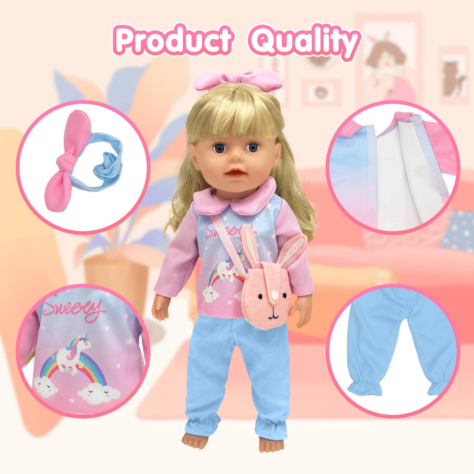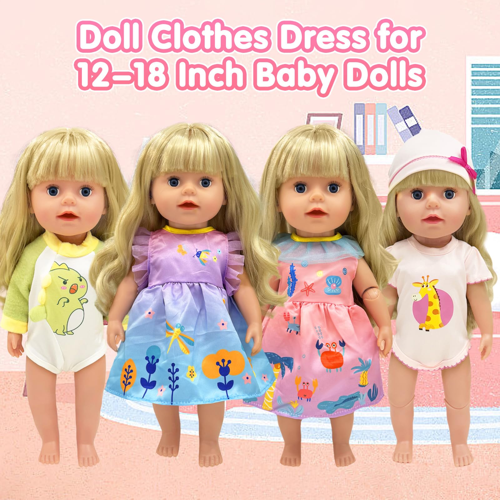 "11 sweet doll clothing set: Fashionable doll clothing set includes 8 different cute baby clothes, 2 diapers, and 1 shoulder bag, suitable for dolls from 12 to 17 inches.","Soft and comfortable material: The doll clothing is made of high-quality, soft fabric, well-made, feels good, and does not cause any discomfort to the child. Safe and non-toxic materials ensure children's health.","Colorful colors: Fashionable rainbow-colored skirt that catches children's attention and stimulates their imagination and practical skills. Children will have fun swapping their dolls with all these different outfits.","Dress-up game: There is a band buckle on the back to make it easier to put on and take off. Perfect for little hands, providing more fun during playtime.","Great gift: Doll clothing and accessories are perfect gifts for children on birthdays, Children's Day, and parties, and are also a starter set or ideal gift for young mothers or fathers."
