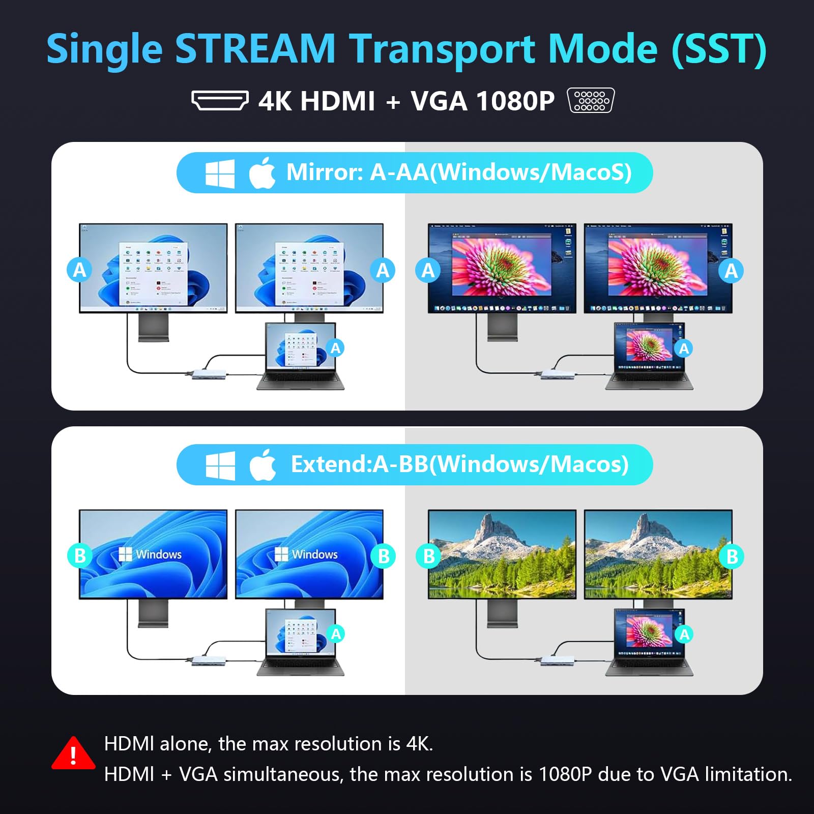 ["【11-in-1 USB-C Docking Station】The Aplimln USB-C splitter includes 4K HDMI, 1080P VGA, PD 100W fast charge, USB 3.0, 3 X USB 2.0, 100Mbps Ethernet, SD and TF card reader, and a 3.5mm audio jack. Expand 1 USB-C port into 11 different ports with just 1 USB-C hub, solving the problem of a single port not being able to meet various requirements.","【4K HDMI and 1080P VGA】The Aplimln USB-C hub with HDMI and VGA supports high-resolution displays, projectors, and more. The resolution is up to 3840x2160@30Hz (4K) when using only HDMI, and is compatible with 1920x1080@60Hz (1080P), 1280x1024, 1600x1200, 720p, and more. When using HDMI and VGA simultaneously, the resolution is limited to 1080p through VGA (Note: When using VGA and HDMI at the same time, one display is in Mirror Mode by default and the other is in Extended Mode).","【100W PD and 100Mbps Ethernet】The Aplimln USB-C adapter supports up to 100W fast charging via the PD protocol, with a power of 87W-100W depending on the device. The Ethernet port provides a stable, fast 100 Mbps internet connection, which is more stable than WiFi and avoids delays due to network fluctuations.","【Multiple Data Ports】The USB-C multiport adapter features multiple types of data transfer ports: 1 USB 3.0 port supports data transfers up to 5 Gbps, 3 USB 2.0 ports support data transfers at 480 Mbps, and the 3.5mm audio jack allows you to connect a mouse, keyboard, stereo headphones, and more simultaneously. With SD and TF cards, you can easily transfer your memories from the camera to the device! (Note: SD/TF cards cannot be read simultaneously)","【Plug and Play】Compatible system: Windows 10/8/7/XP/Vista/Chrome OS/Mac OS/Linux/Android etc. Please make sure your device supports OTG and DP functions. Powering your device through the PD port can optimize performance. If you have any questions, please contact us."]
