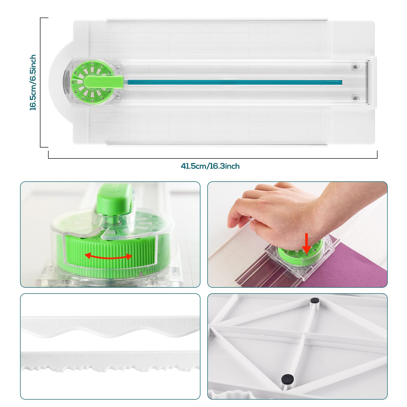 ["Twelve in One Paper Trimmer] - Twelve in One Paper Trimmer includes 12 different shapes, 1 shape for cutting straight lines, 9 shapes for cutting various wave patterns, 1 shape is indentation (for folding paper), 1 shape is dotted line (for easy tearing of paper), tool with automatic safety protection and side ruler for craft paper, label, photo paper cutter ToolRPA222 02320 23 [Multifunctional with extension rulers, foldable] - Tra