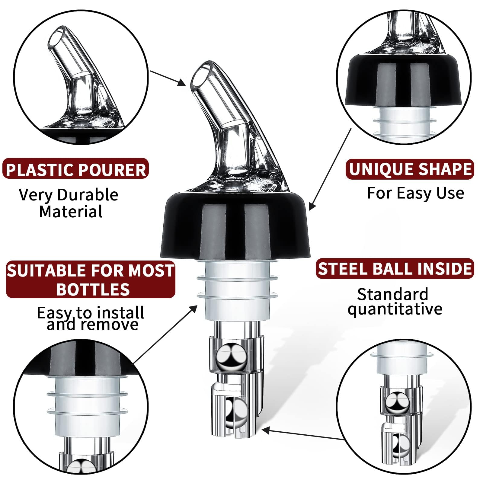 ["High-quality Materials: The automatic pourers are made of untreated plastic, a much more durable material that does not corrode. They can be safely used when used for a long time.","Quality: High-quality solid construction, hand washing recommended.","Convenient: Thanks to the stop function, always pours exactly 3 cl. Note: Inaccurate pourers occur when used with water.","Application: Simply screw onto the bottle and pour at approximately a 45° angle, Fits bottle openings of approximately 18-20 mm, Fits most commercial liquor bottles.","Package includes: 12 x SuproBarware pourers for bottles, 12 x black plastic cap. LENGTH - approx. 9.5 cm, DIAMETER - approx. 3.8 cm, with exquisite packaging."]