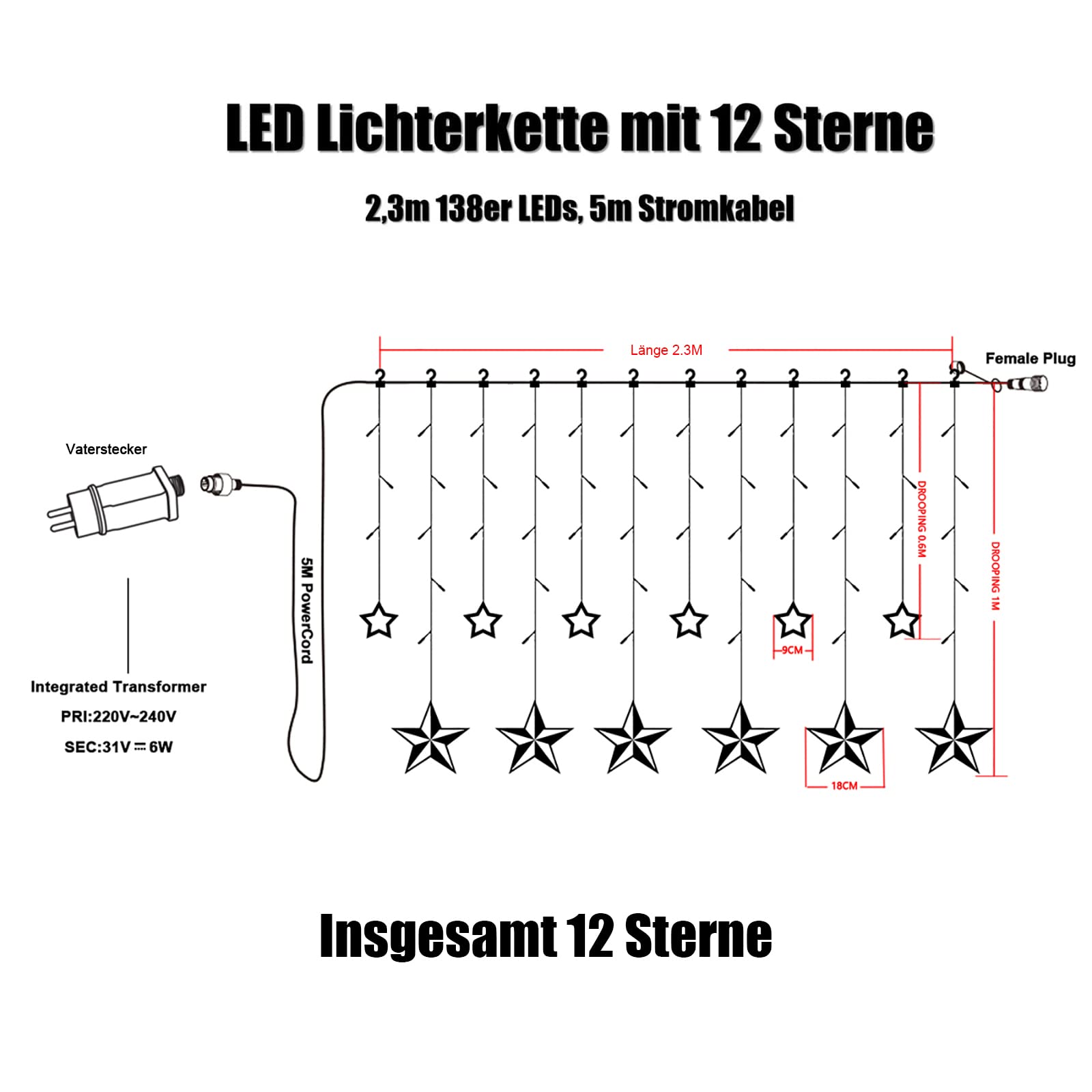 ["12 Stars Fairy Lights Curtain String Lights for Indoor/Outdoor. 12 stars (6 large and 6 small), 138 warm white LED string lights, 2.3m star curtain window decoration, extra 5m detachable lead. 12 hooks attached for easy hanging on curtain rod.","Timer & 8 Different Light Modes. Timer function with indicator light (automatically 6h on / 18h off) and 8 lighting modes. You can choose your desired light mode. A transformer power supply with 8 mode button sits at one end of the Christmas lights, with an end plug at the other end for connecting up to 5 Christmas light strands, meeting your extension needs.","IP44 Splash-proof LED Lights. Star curtain window lights to resist light rain or water splashes. Perfect decoration for outdoor and indoor, will also work well in cold winter. Copper wire has increased conductivity, ensuring long product lifespan.","Easy to Use. Easy to install and remove. Many small plastic hooks on the star icicle fairy lights make it easy to hang on a string or fix with small nails. Can be placed on Christmas trees, walls, windows, doors, floors, ceilings, grass, etc. Simply place the expandable string lights where you want to hang them.","Low Voltage 31V. Works with DC31V low voltage, safe to touch and will not damage your skin. Completely safe to use with no risk of electric shock."]