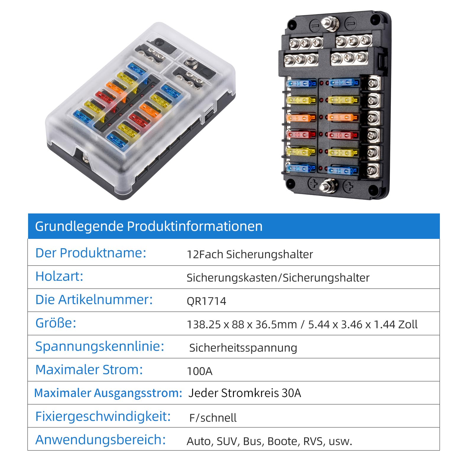 ["đăFireproof PBT Materială: This fuse box is made of environmentally friendly, fireproof PBT + PC material and meets all standards for high strength, good insulation, heat resistance, and flame retardancy fine fuse boxes. The PC dust cover design can be dustproof and splash-proof, extending the life of the fuse box.","đăBest Conductivityă: 12-way fuse box for ATC/ATO (medium) fuses with positive and negative poles. This means there is a negative pole for each positive pole screw. Max operating voltage: 32V DC; max 30A per circuit and 100A per panel.","đăRed LED Display Designă: Each fuse has a red LED next to it, when the corresponding fuse blows, the red LED warning light lights up immediately, easy to find fault problems and replace the blown fuse very abundantly, and all accurately indicate the location of the short circuit or other fault","đă12V 12-way Wiring Designă: The 12-volt fuse box with ground bus kit provides you with 12 dedicated fuses and 12 ground locations to keep all wires clean, organized, and easy to use. Keeps your wiring clean and tidy.","đăProduct Installation Areaă: This 12-phase blade fuse box is widely used in cars, buses, tankers, boats, trucks, SUVs, yachts, RVs, ships, etc. Product application range: can be directly wired with the car, boat any electrical wiring above, such as car headlights, dome lights, fog lights, warning lights, car chargers, car fans, car refrigerators, car TVs, etc."]