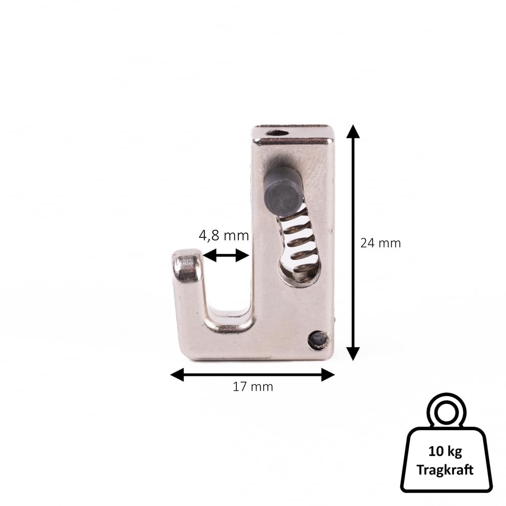 "Attractive aluminum picture hanging system in silver or white. This complete package includes: 60 x rails, 300 x mounting materials, 88 x end caps, 240 x perlon cords & picture hooks. The rails are mounted on power clips using a snap-on principle. Mini-Magic picture hooks: approx. 22 lbs weight capacity. Perlon cord: Length 4.9 ft, Diameter: 0.08 inch."
