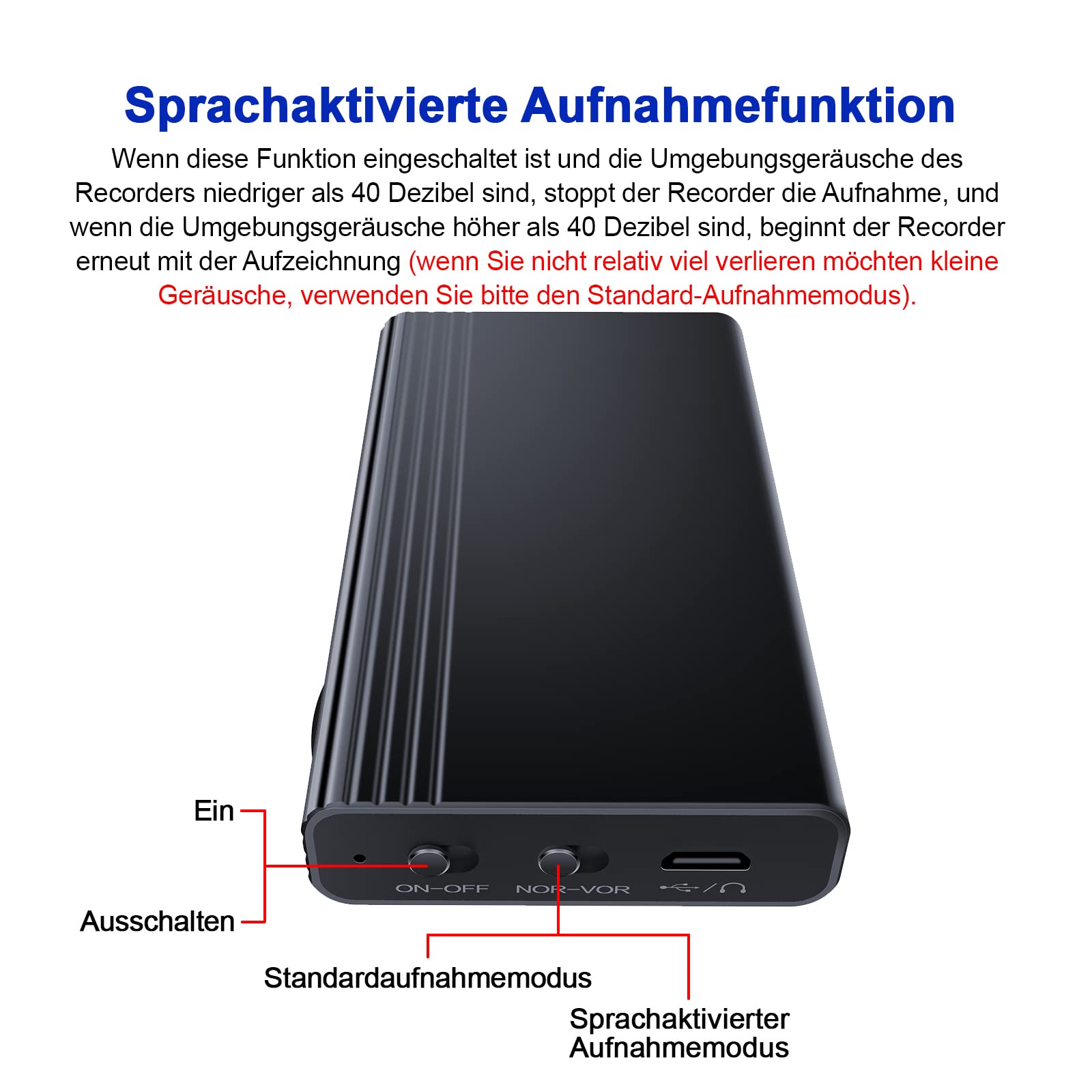 ["Built-in magnet】 The STTWUNAKE recorder has a built-in magnet. Users can attach the recorder to magnetic metal, which is convenient for users.,【Long-term recording】 The recorder has a high-capacity built-in battery. After a full charge, the battery life is about 300 hours. Do not worry about the recorder not being able to record for a long time due to insufficient battery capacity.,【Large capacity storage】 When the recorder records for a long time, the key is the storage capacity. If the storage capacity is too low, users easily lose important recording data. The storage capacity of 128G is four times that of 32G.,【Intelligent noise reduction】 Built-in intelligent SDP noise reduction chip, which helps users to record clearer sound.,【Easy to use】 To make it easier for users to turn the intelligent recording function on or off, we have independently developed the intelligent recording switch for user convenience."]