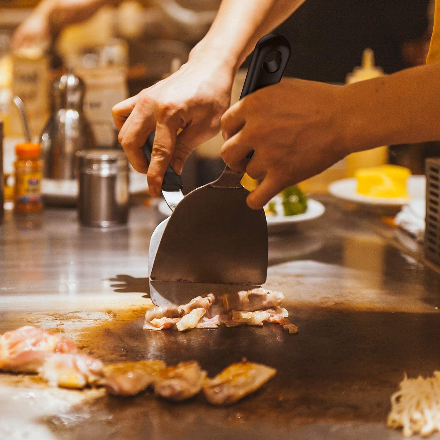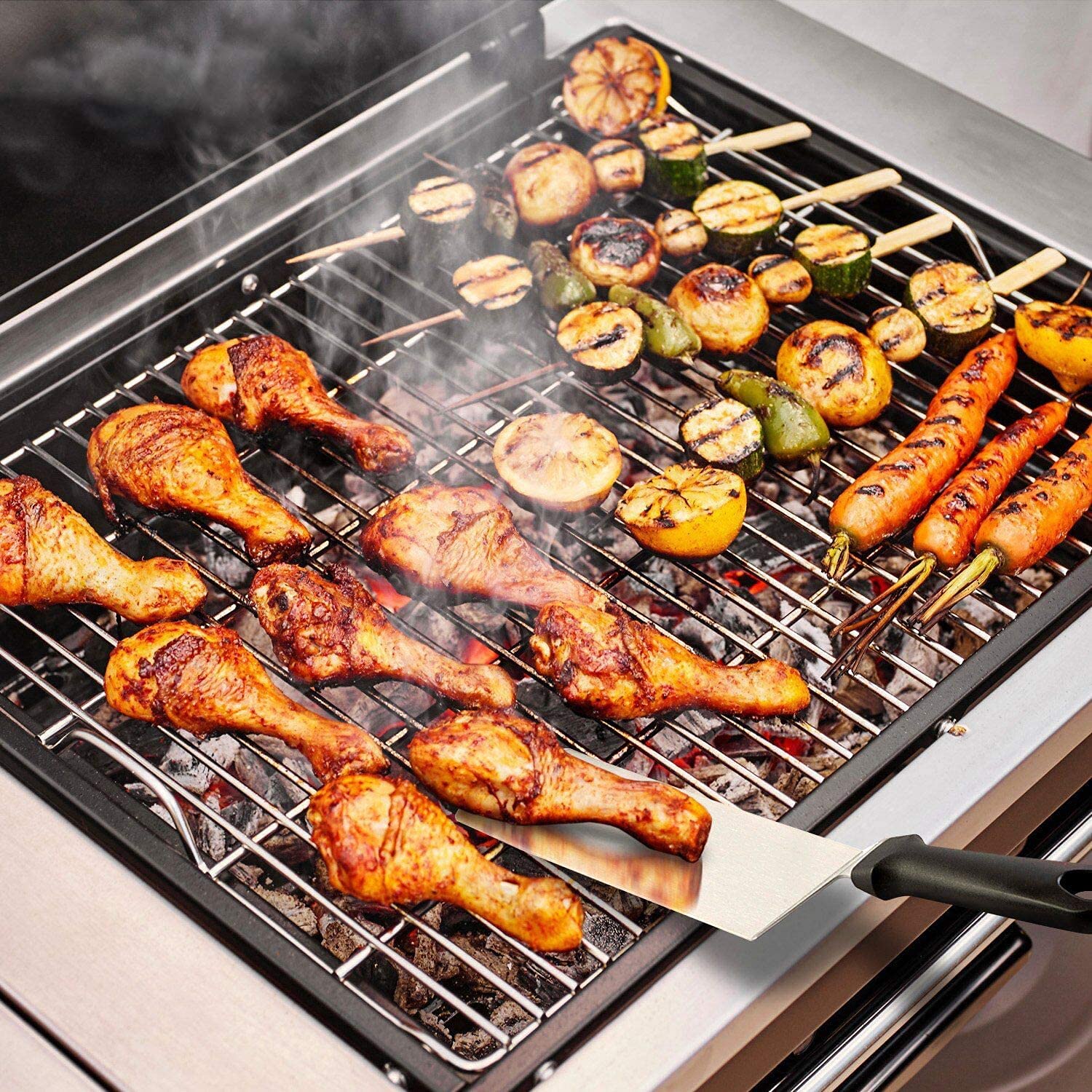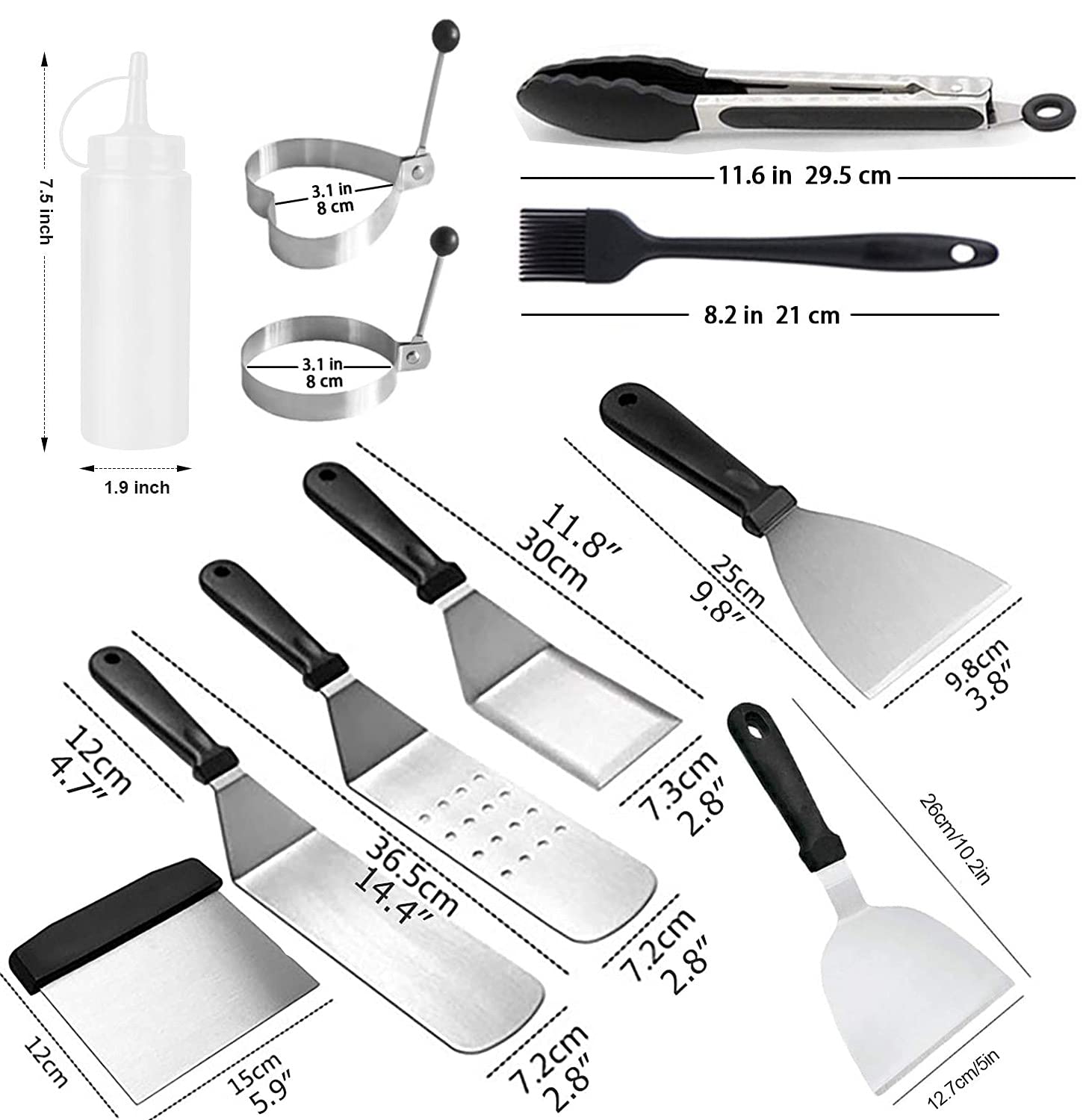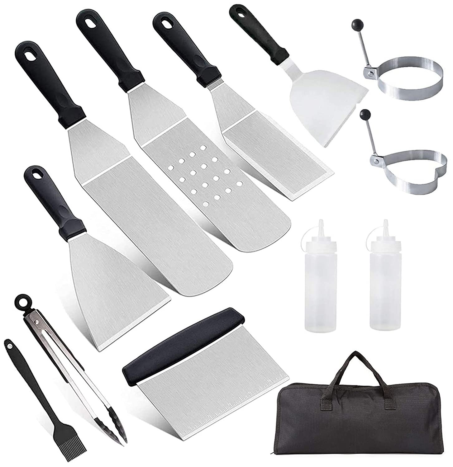 ["High Quality: Made from high-quality stainless steel for durability, with heat-resistant handle for a comfortable grip, all grill spatulas with flexible blade.","Must Have Grill Accessory Kit: Scraper, spatula, and oil bottle are essential grill tools for the grill cook. Grill spatulas can move large amounts of food quickly and accurately. Scraper for chopping food and scraping grill plates. The tapered spatula is good for your chopping needs and grill cleaning. Egg rings and other grill tools help you with grilling.","Easy to Clean: The flat grill accessories are dishwasher safe or easy to hand wash with water and soap, so you can enjoy a delicious barbecue with your family without any hassle (Note: After washing the flat grill scraper in the dishwasher or by hand, please make sure to dry them to ensure a long lifespan.","Professional Design: The curved or beveled edge makes the grill tool easier to use, slides under the food and flips easily, perfect for flipping burgers, pancakes, vegetables, cutting bread, meat, and sausages.","Great Gift Idea: The grill spatula set is an ideal gift for friends, lovers, or family members who enjoy cooking or grilling and camping enthusiasts. Unique grill gift selection for Father's Day, Thanksgiving, or Christmas. With the right accessories, grilling becomes much easier, safer, and more fun."]