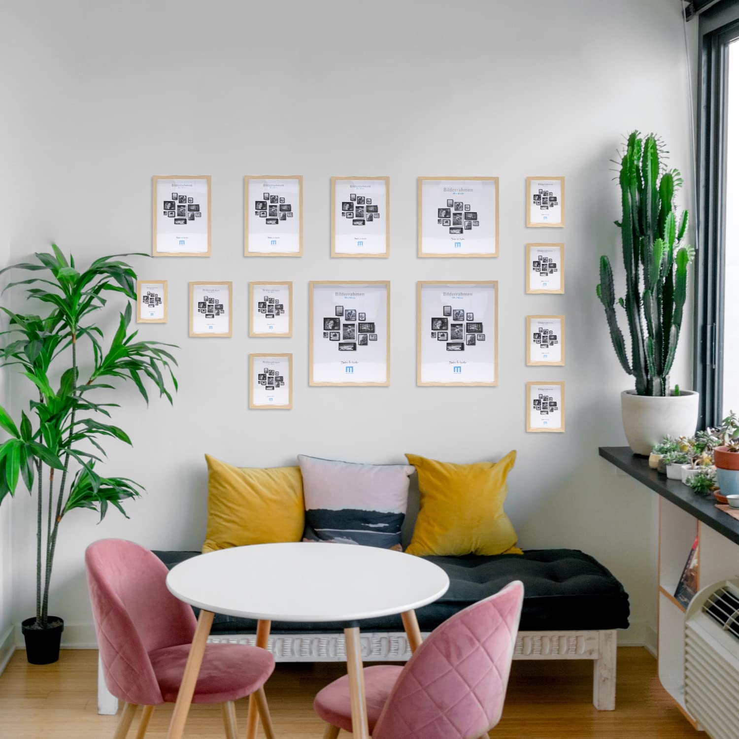 14-piece photo frame set in natural wood look in various sizes. Perfect for creating photo walls with a mix of portrait and landscape frames. Suitable for photos ranging from 10x15 to 30x40cm.