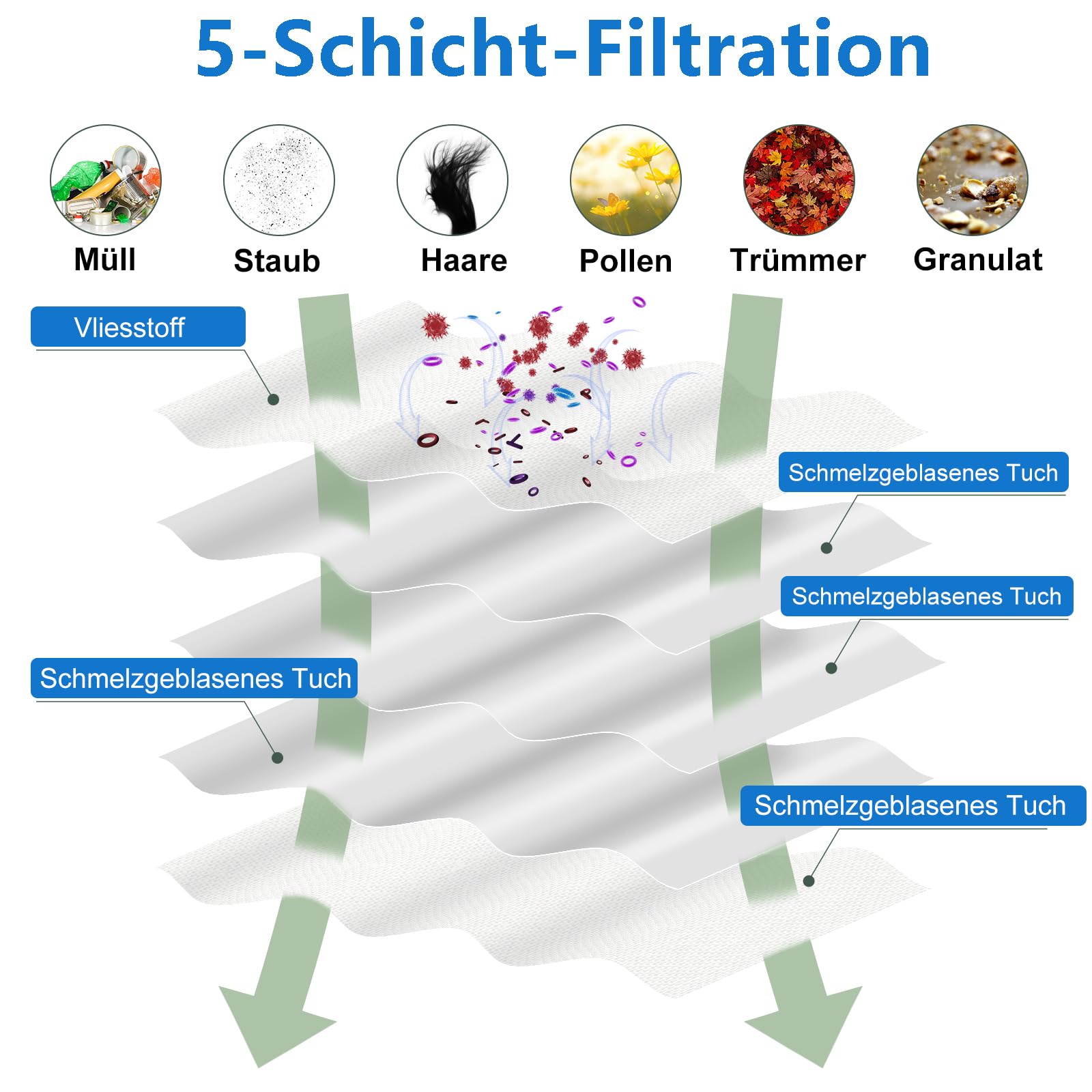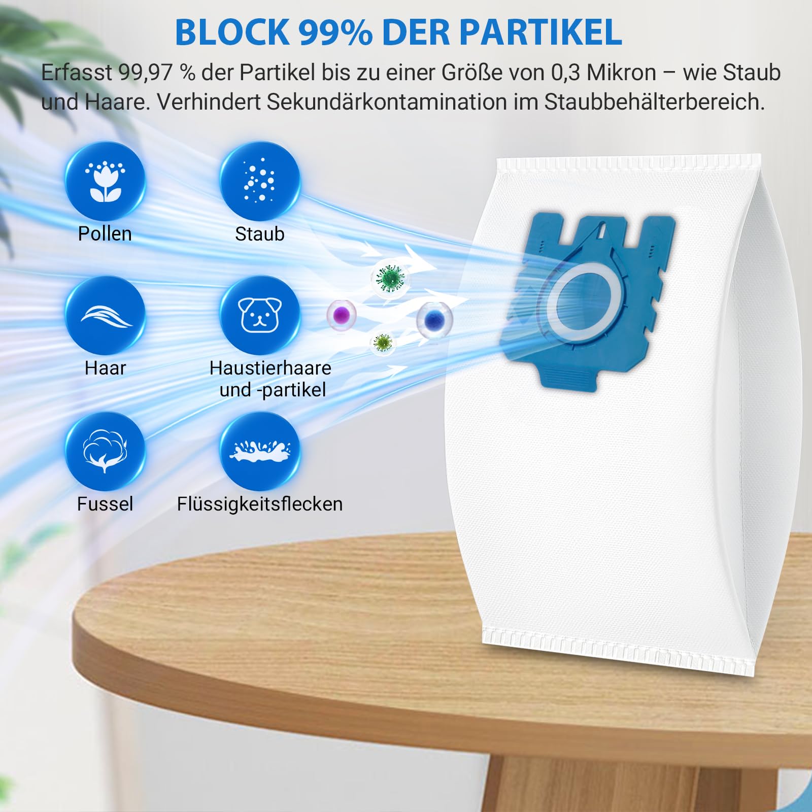 "【Excellent Filtration Performance】 These vacuum cleaner bags feature advanced 5-layer microfilter technology, capturing 99.97% of dust, pet hair, and other fine particles effectively. This significantly improves the air quality in your home, keeping your environment fresh and clean.",