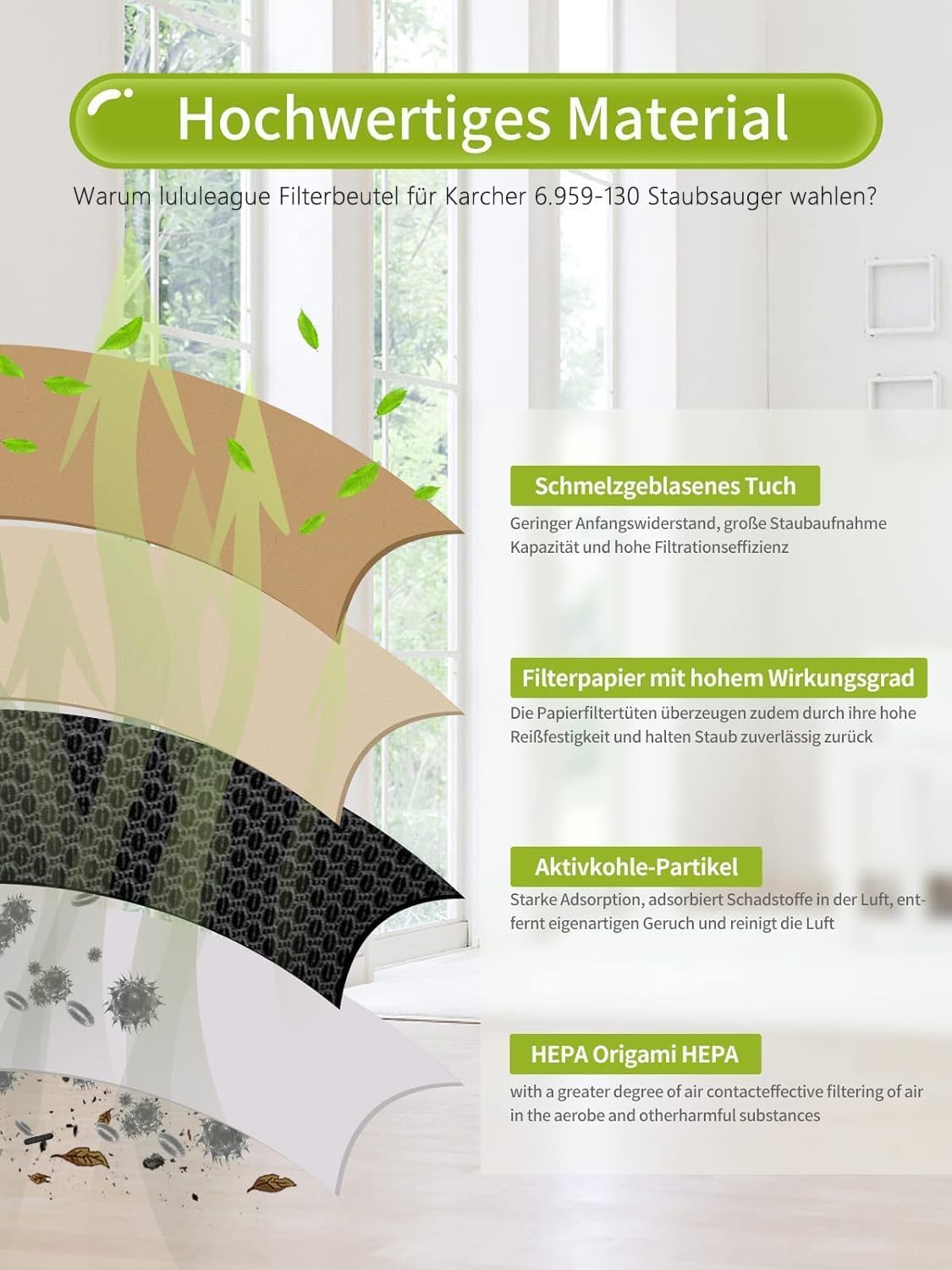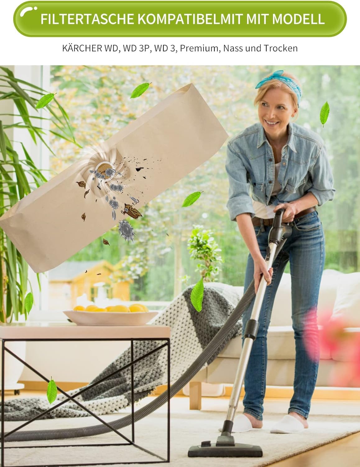 ["【WIDE COMPATIBILITY】lululeague 6.959-130.0 Vacuum Cleaner Bags Compatible with Kärcher Vacuum Cleaners WD 3, WD 3 Battery, MV 3, WD 3.200 to WD 3.800 M, SE 4001, SE 4002","【2-layer and tear-resistant】MV3P Premium Filter Bag is made of 2-layer microfiltration paper and environmental material, with a filtration efficiency of up to 99.99%","【Product Type】lululeague 6.959-130.0 Vacuum Cleaner Bags for Kärcher Wet Dry Vacuums and Multi-Purpose Vacuums. These vacuum bags for Kärcher WD3 are Easy to Install and Replace","【PACKAGE】15 Pieces of Paper Filter Bags Vacuum Cleaner Bags for WD3 Karcher 6.959-130.0 Paper Filter Bags. We recommend replacing the WD3 bag every 2-3 months for optimal performance (depending on your usage)","【Service】If you have any doubts about compatibility or product quality, feel free to contact us. We are online 24 hours to assist you. Contact us for quality or compatibility issues to get a solution"]