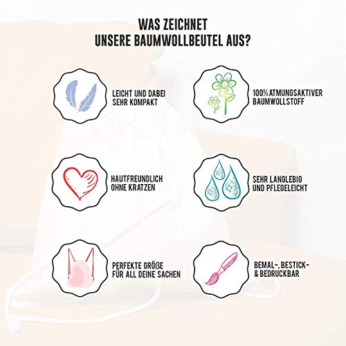 ["HIGH QUALITY & ECO-FRIENDLY: With a weight of 140 g/m² instead of the usual 100 g/m², these bags are almost 40% stronger and more durable. The OEKO-TEX certified cotton, as well as the overlocked inner seams, ensure stability and optimal protection for your favorite items.","VERSATILE AND CREATIVE: Whether as a sachet, gift wrapping, jewelry and make-up storage, for candies, or for creating your own advent calendar. Our great drawstring bags can be used multifunctionally and individually.","SUSTAINABLE AND EASY TO CARE FOR: The bags can be easily cleaned as needed and reused again and again. They are ideal for a variety of DIY projects and can be printed, painted, or even stamped. Let your creativity run wild!","TIMELESS AND PRACTICAL DESIGN: The bags are equipped with a drawstring cord, which allows for easy opening and closing. This guarantees that all secrets will be safely kept inside the bag.","25 YEARS OF EXPERIENCE AND BRAND QUALITY: If our cotton bags do not meet your expectations, you will of course receive your money back. Constant quality control of production with over 25 YEARS OF EXPERIENCE allows us to pass on this promise to you."]