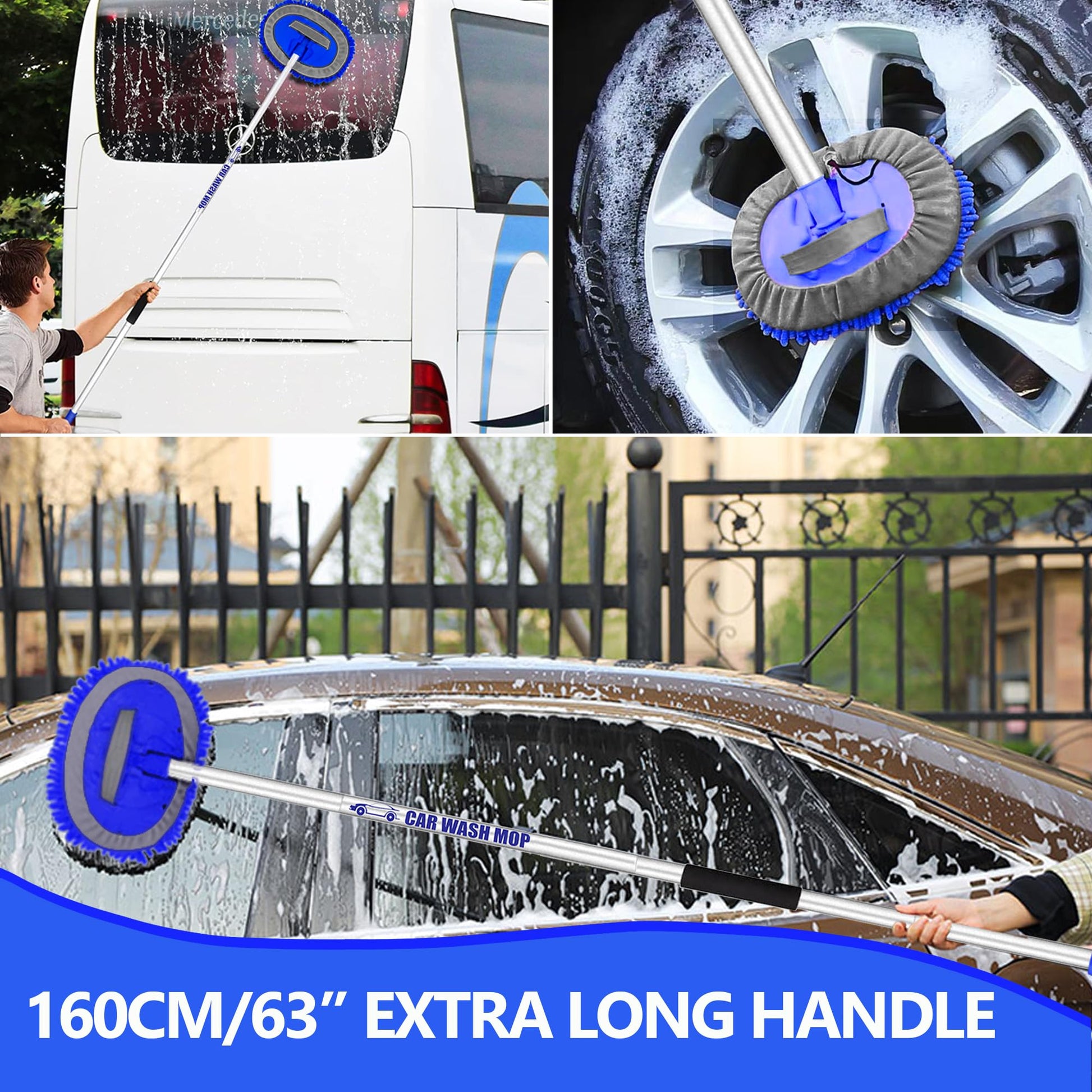 160cm 63" car wash brush with telescopic handle. Brush for motorhome, caravan, truck. Microfiber cleaning brush for car. 2 in 1 anti-scratch telescopic brush. Car brush cleaning set includes 3 replacement mop heads.
