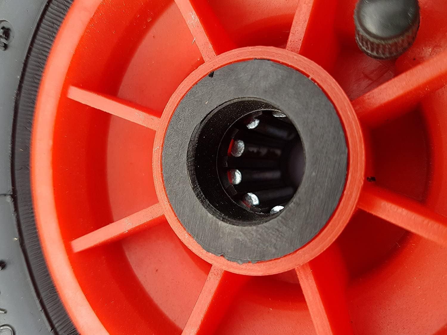 ["Set consisting of 2 air wheels for hand trucks / wheelbarrows / wagons / handcart / cart", "With red nylon rim and pneumatic tires with a maximum load capacity of 80 kg per wheel", "Easy gliding with needle bearing for higher strength", "Details: Dimensions of the black rubber wheel (diameter x L): approx. 260 x 85 mm. Axle D: approx. 20 mm. Hub length: approx. 75 mm", "Tubes (included) with 90° bent valve.", "Scope of delivery: 2 x replacement tires"]