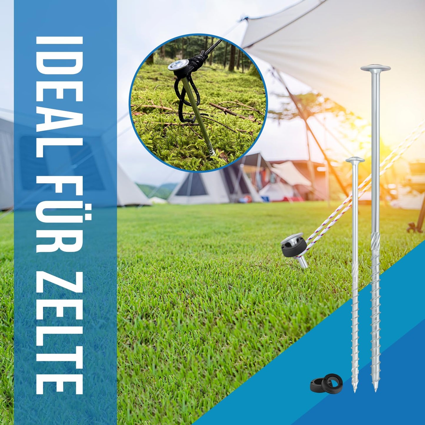 "Robust and resistant: Thanks to the hardened screw, the tent screws are ideal for challenging, hard surfaces, including rocky, clayey, frozen, and root-filled soils. Their sturdy construction ensures long-term use even under demanding conditions."
