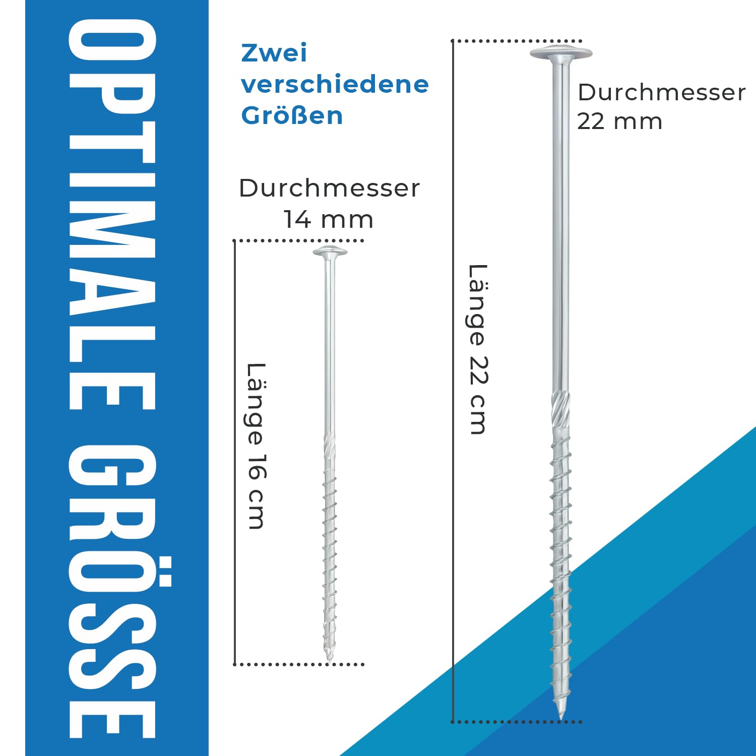 "Flexibility with different sizes: The set includes two sizes of screw stakes: the 6x160mm version for heavily rooted or clayey soils, and the 8x220mm version for even deeper ground anchoring. This flexibility allows you to choose the right screws for various surfaces and applications."