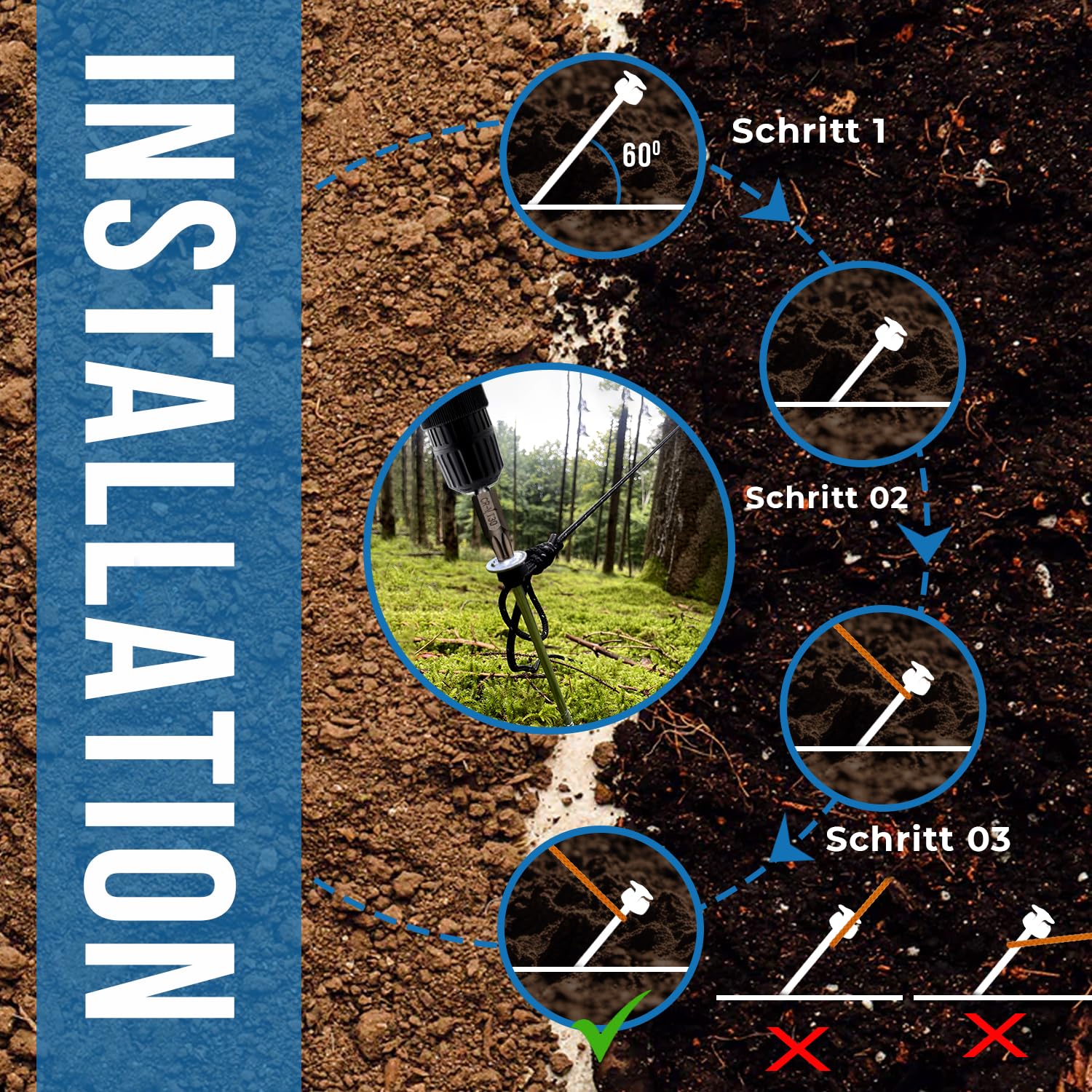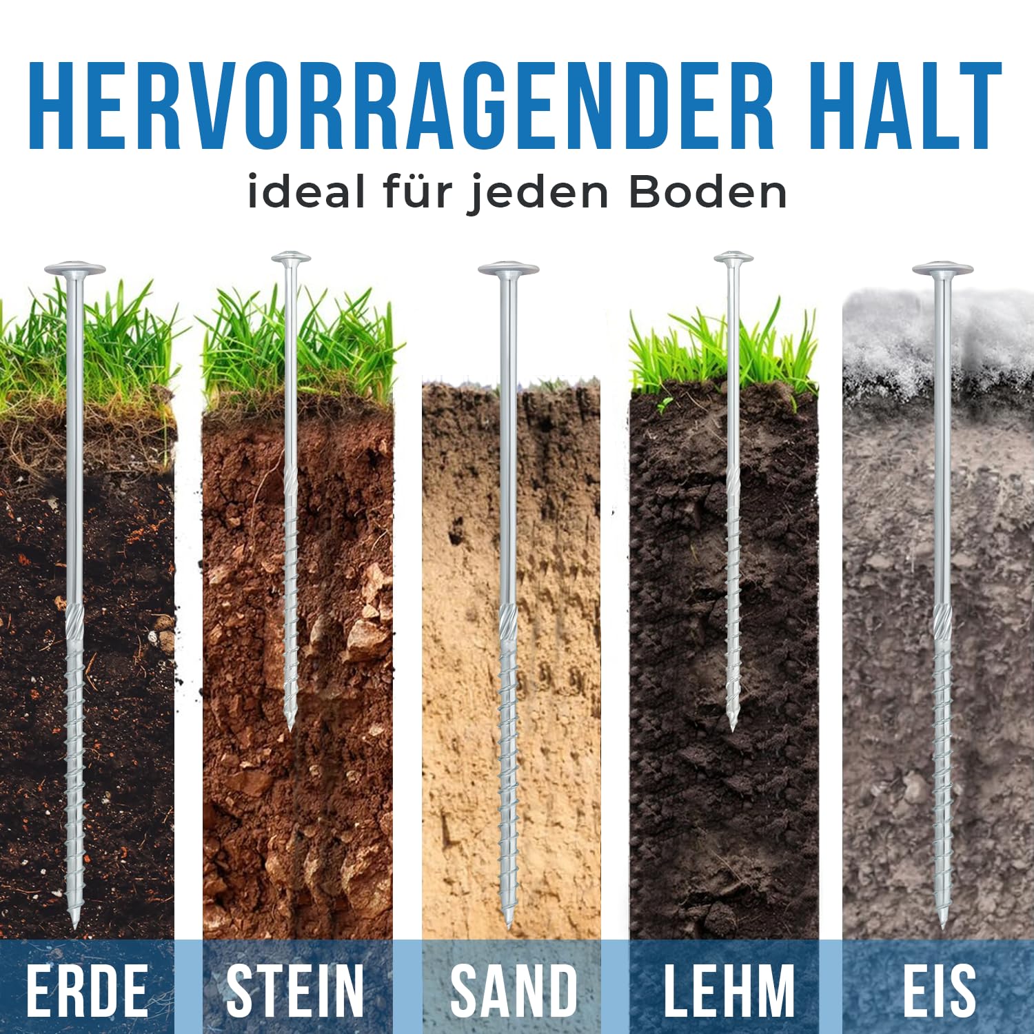 "Easy installation without hammering: The set of tent screws can be easily screwed in with a cordless drill or a hand grip (for bits), without the need for hammering. This saves time and effort during setup and teardown. Matching bits are included in the set so you can start right away."