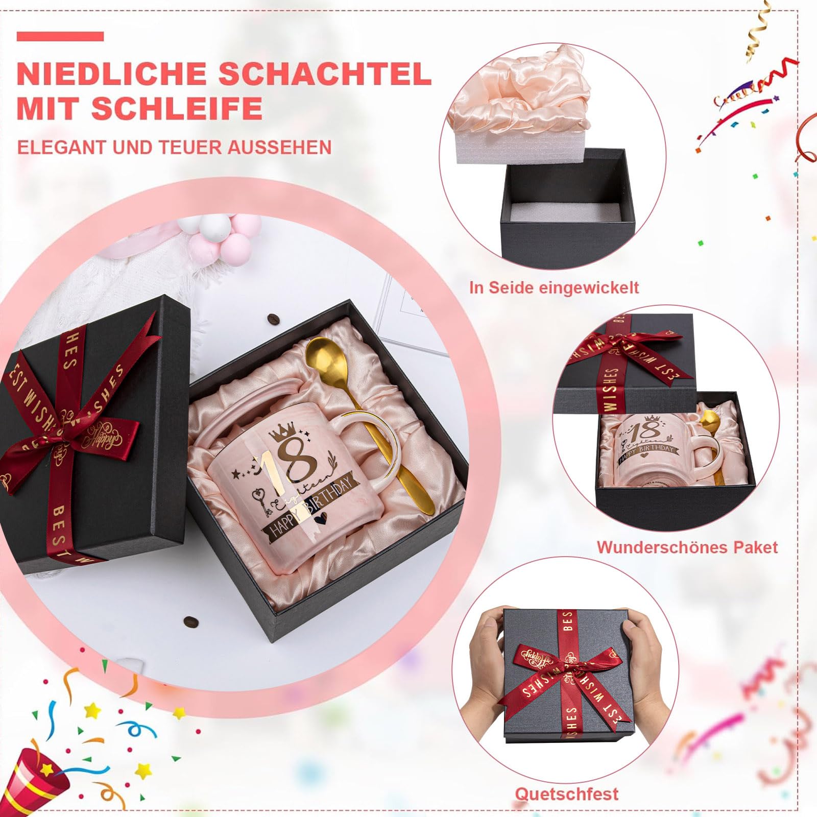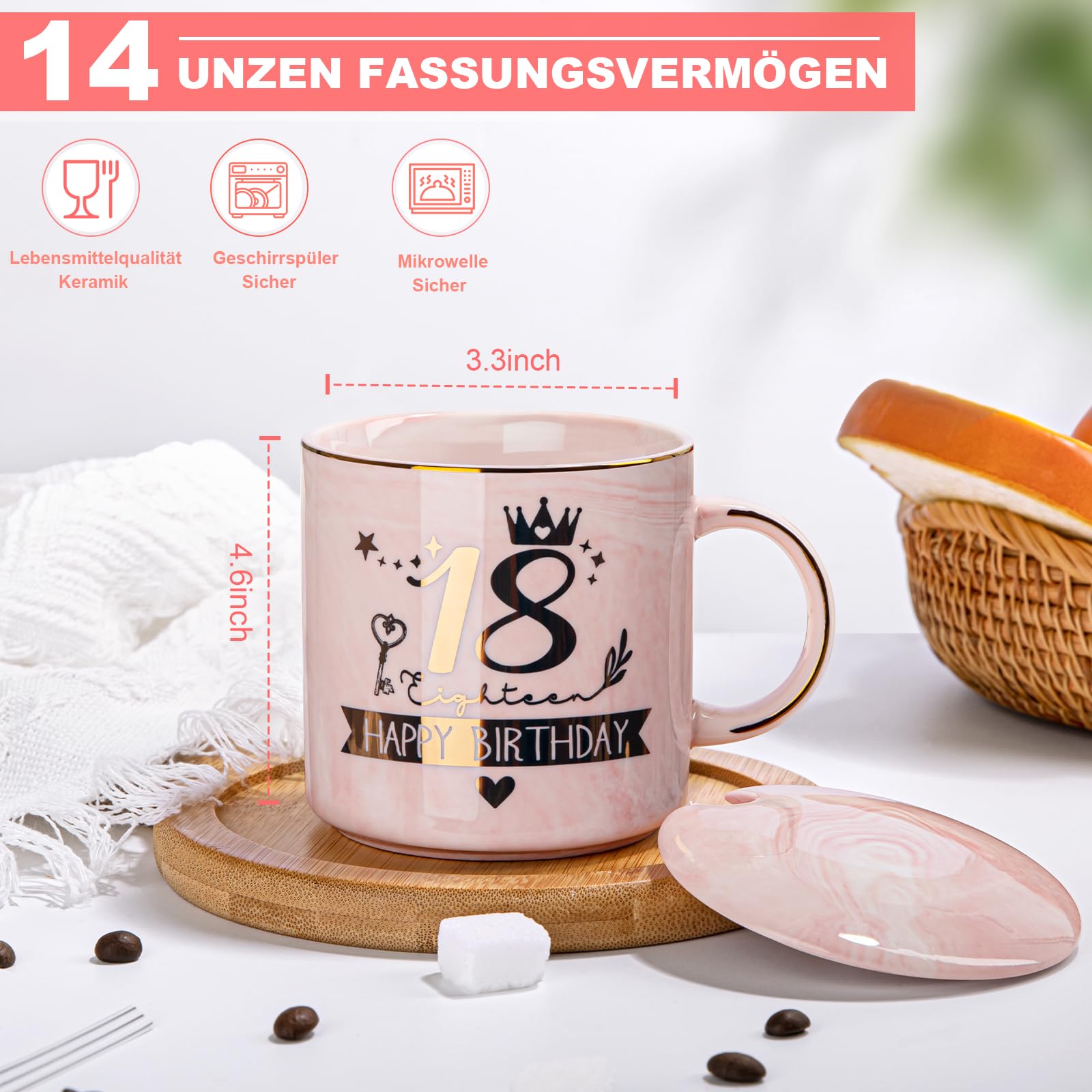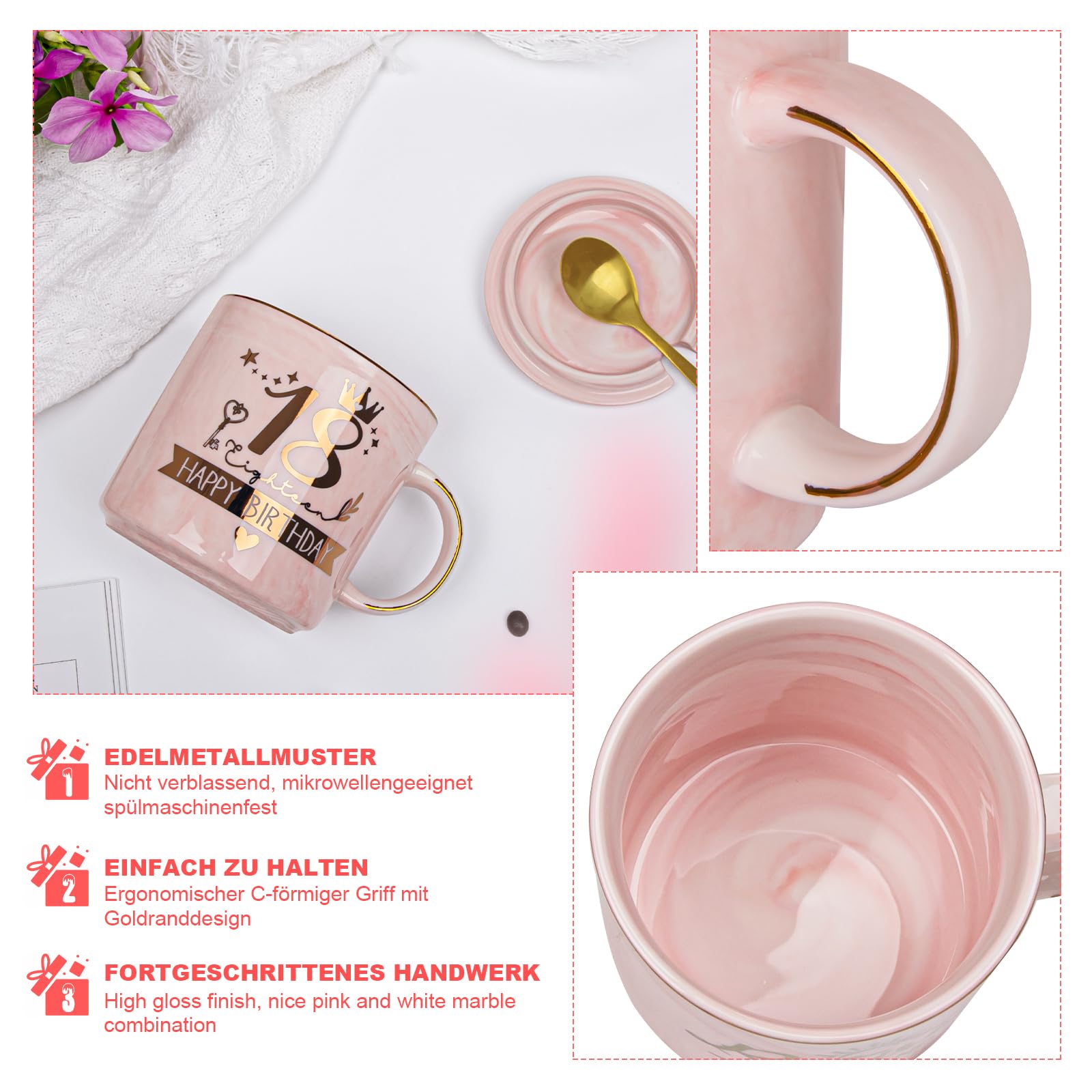 ["【Gift for 18th Birthday for Girls】This is an ideal and practical gift for the 18th birthday for girls. Also very cute and beautiful. A great gift for a girl's 18th birthday, not just for daughters. This mug will remind her how wonderful and glamorous it is to be 18. Absolutely happy and unforgettable!", "【Golden Design and Microwave Safe】This 14-ounce marble mug is small in size but big in capacity, designed by professional designers and handcrafted by artisans. Professionally made with durable metal prints and baked in a high-temperature oven for a flawless finish. Microwave and dishwasher safe, convenient during your coffee enjoyment", "【Ready to Give, Gift Wrapped】This 18th birthday mug is the perfect birthday gift for girls, nieces, and granddaughters. It will surprise her so much that she will always remember the beauty of this moment.", "【18th Birthday Girl】This 18th birthday mug is the perfect gift for women, girls, grandma, mother, daughter, wife, aunt, niece, granddaughter. Or as an unforgettable gift for Mother's Day, birthday, Christmas, graduation, prom, Valentine's Day, family celebrations, Christmas, holidays, Thanksgiving", "【Satisfactory Service】We strive to provide every customer with the best products and services. If you have any questions, feel free to contact us. We will provide you with a satisfactory solution. An unforgettable 18th birthday gift that will surely put a wide smile on her face!"]