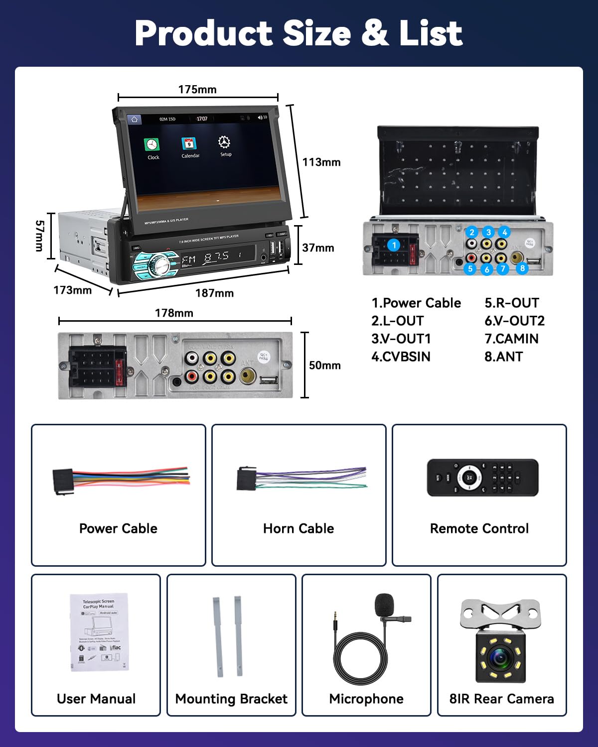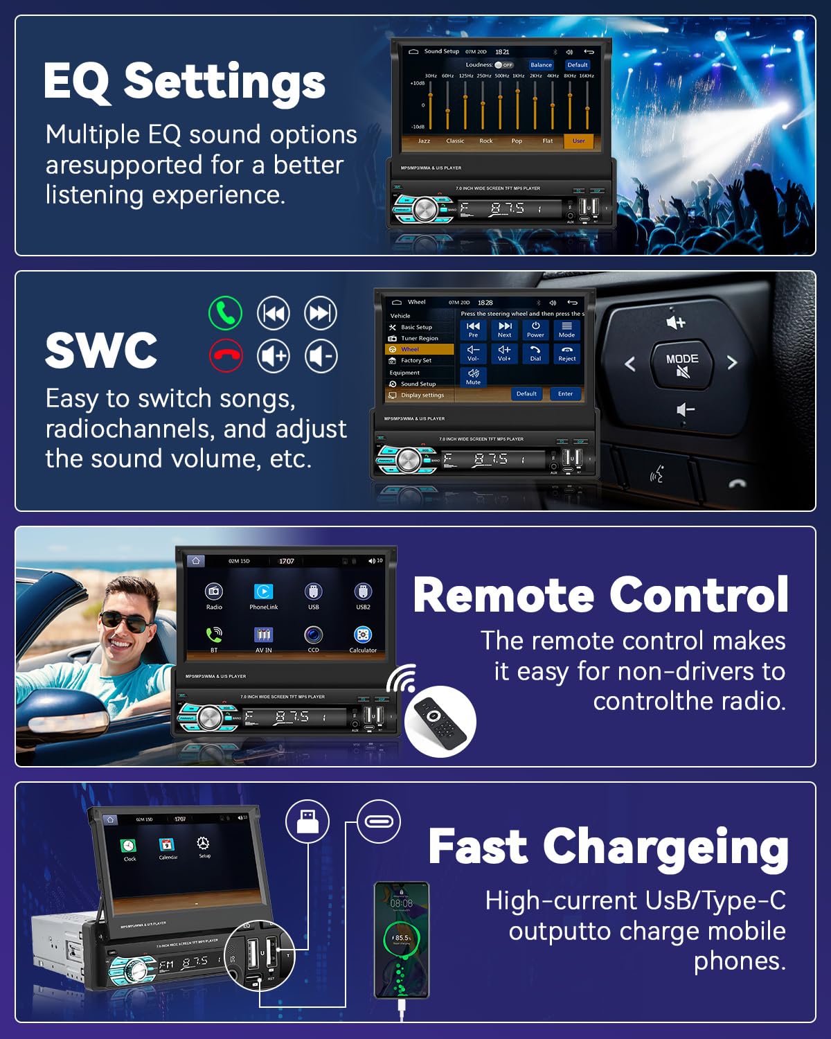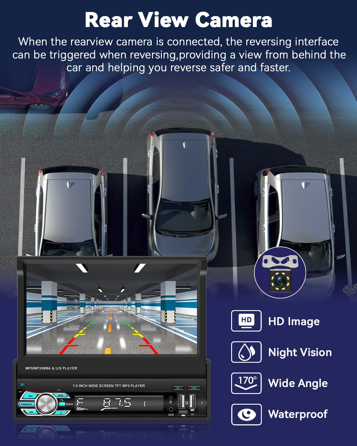 1Din wireless carplay android auto with retractable 7" screen car stereo with bluetooth hands-free calling USB Type-C interface AUX FM RDS mirror link backup camera