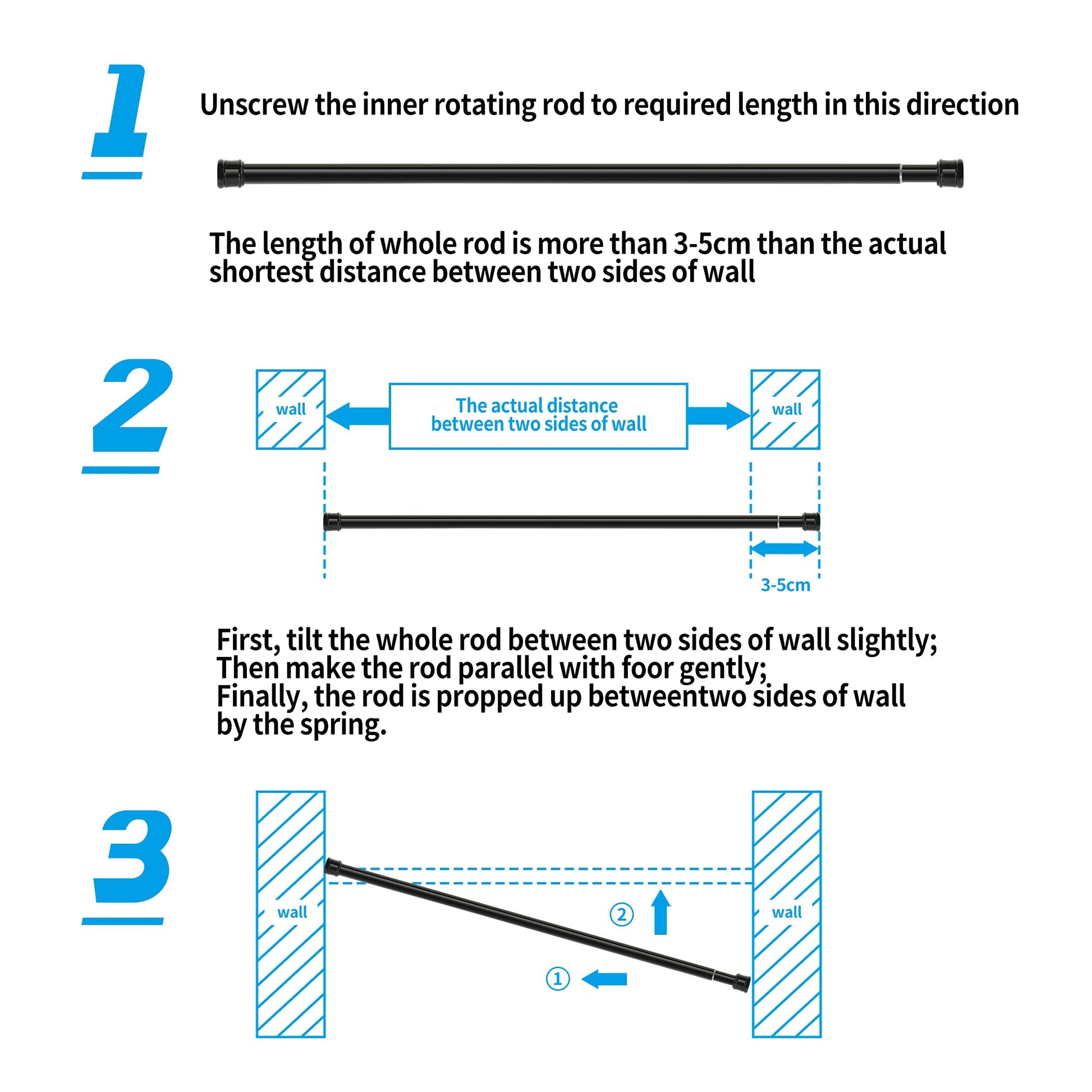 ["【ANTI-SLIP & ROST-OFF】 Aiitomg Shower Curtain Rod is designed with a delicate and non-slip head and made of high-quality paint to keep rust away.", "【Durable and strong enough】 1 inch rod diameter. Thicker spring. Maximum load 25 lbs.", "【Package Contents & Attention】 1PC 40-63CM telescopic rod and 1PC 25CM extension rod. Curtain rod without drilling, please make sure to install after the second picture and the installation video in the left photo gallery.", "【Multipurpose】 The retractable shower rod without drilling is suitable for shower rooms and bathrooms, cabinets, windows, doors, etc. Can be used indoors and outdoors.", "【Service】 Aiitomg offers reliable replacement and service. If your rods were damaged during transport, please contact us to receive a new rod or a refund."]