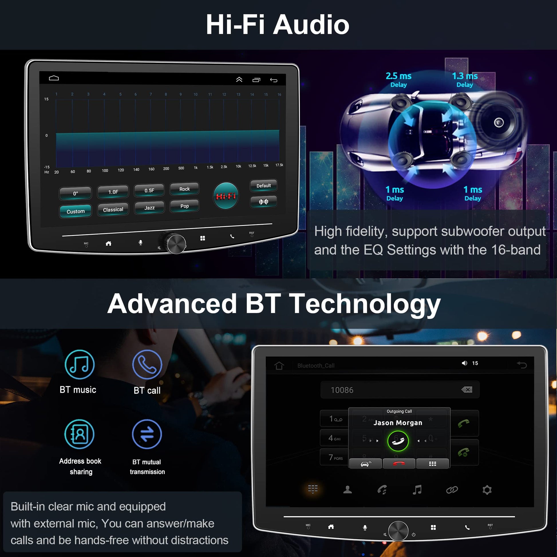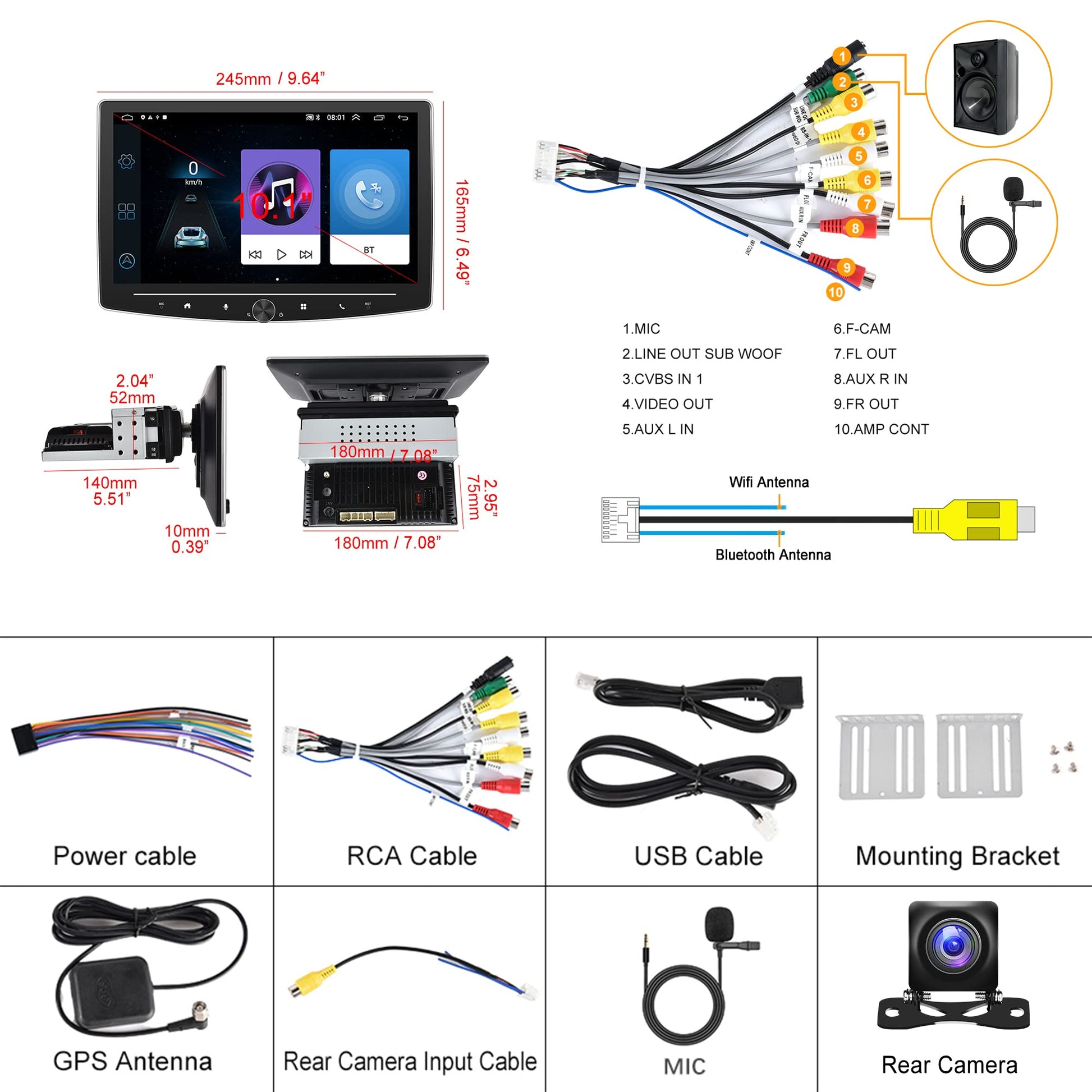 ["1.Android Car Stereo 1 Din with Swivel Screen: The installation size of this 1 din car stereo is 7.09"(Length)*5.51"(Width)*2.05"(Height) inches, with a 10-inch swiveling large screen. High sensitivity, high transparency 2.5D curved edge, scratch-resistant tempered glass capacitive touchscreen, can watch HD movies, TikTok, and YouTube. The screen can swivel and adjust left and right, up and down.","2.Car Stereo Apple Carplay Wireless/Split Screen: the car stereo 1 din can do wireless carplay, wireless Android auto, by connecting bluetooth, can also be a wired connection. 2 USB cables are provided. Supports external microphone, DAB input, DVR. It can be set to expand two applications at the same time, for example, maps and music can be opened simultaneously.","3.Car Stereo with GPS Navigation: You can use online/offline maps, with the help of GPS antenna (included), the signal will be stronger. The storage of this Android 11 system is 2(RAM)+32(ROM), applications can be downloaded, such as Waze, YouTube, Pandora, then you can listen to online music while driving, watch videos and movies when you are alone in the car.","4.Car Stereo Bluetooth/HI FI Sound: Support hands-free calls, you can safely answer the phone while driving. Bluetooth 4.2 technology, music playback, you can quickly play music wirelessly, with HI-FI (High Fidelity) Sound, produce sound very similar to your original sound. FM: Online music can be transmitted to the car stereo via FM to enjoy the original sound of the car stereo, with 18 preset stations, RDS is supported.","5.Car Stereo with Rearview Camera AHD/SWC: Upgraded AHD chip, with a 1/2.9" CMOS image sensor (5321+2053), high definition, as an additional system for vehicles, provides real-time images within the camera's field of view. Supports steel wheel control, please connect your vehicle's swc cable to the "key 1" and "key 2" wires of this car stereo, follow the instructions to learn buttons, then you can use the steering wheel control function."]