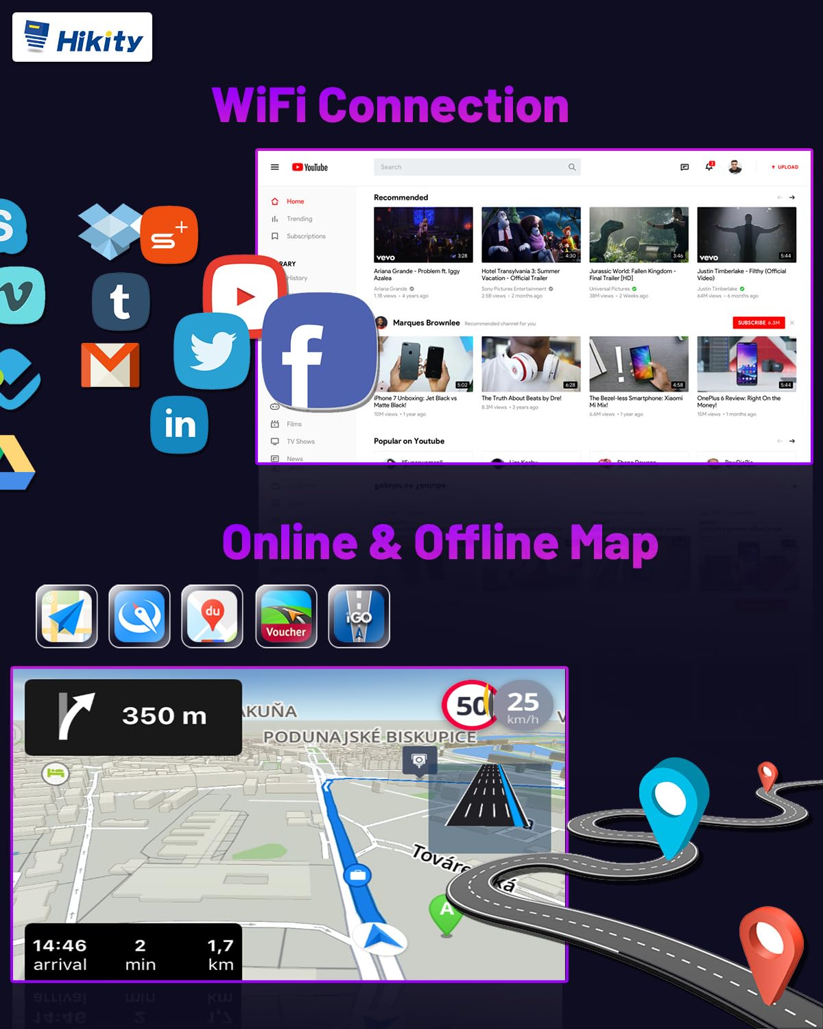 GPS navigation and WiFi: When the Android car radio connects to a mobile hotspot, you can use online GPS navigation and download Android applications such as YouTube/Facebook/INS. You can also download an APK called "Here We Go," which allows you to download free map data to enjoy offline maps when there is no internet connection.