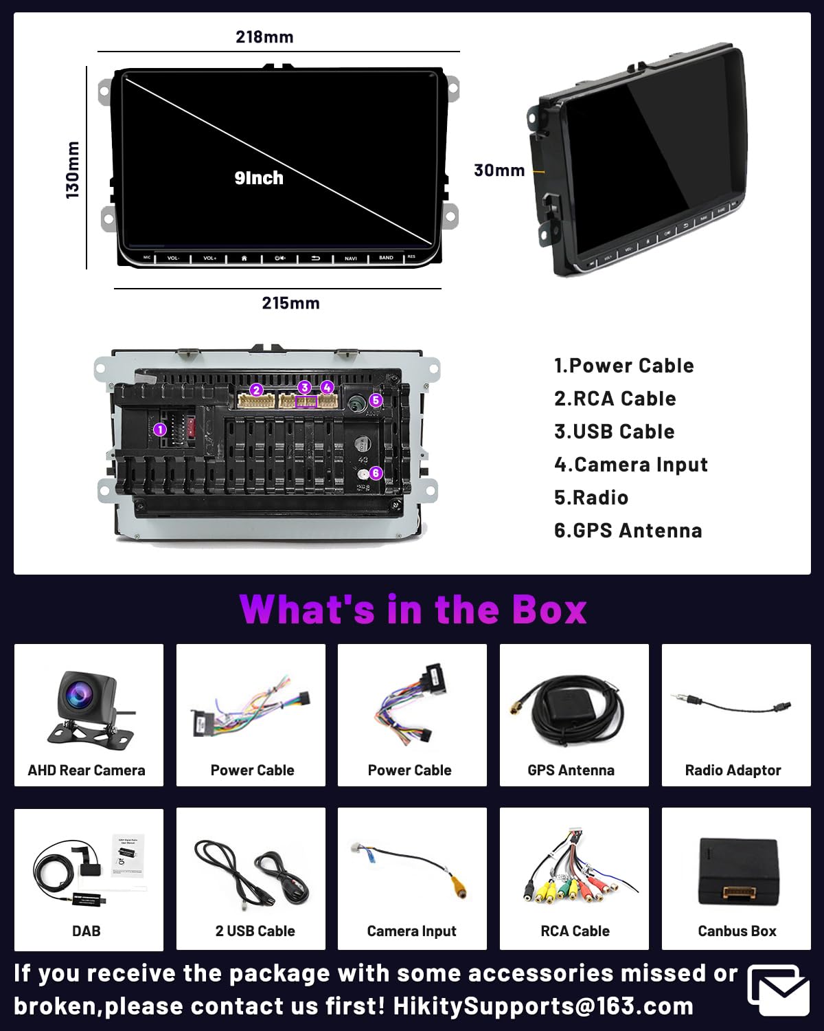 "9" DAB Android car radio for VW/Golf/Seat: This wireless Carplay car radio is suitable for VW/Golf/Seat vehicles and is delivered with a DAB adapter, no additional purchase required. The 9" capacitive touchscreen has a resolution of 1024*600 and offers super clear images. Equipped with a 4-core processor, 2 GB RAM, and 64 GB ROM. Built-in WiFi module, allowing you to use apps like Waze, Shopify, etc.