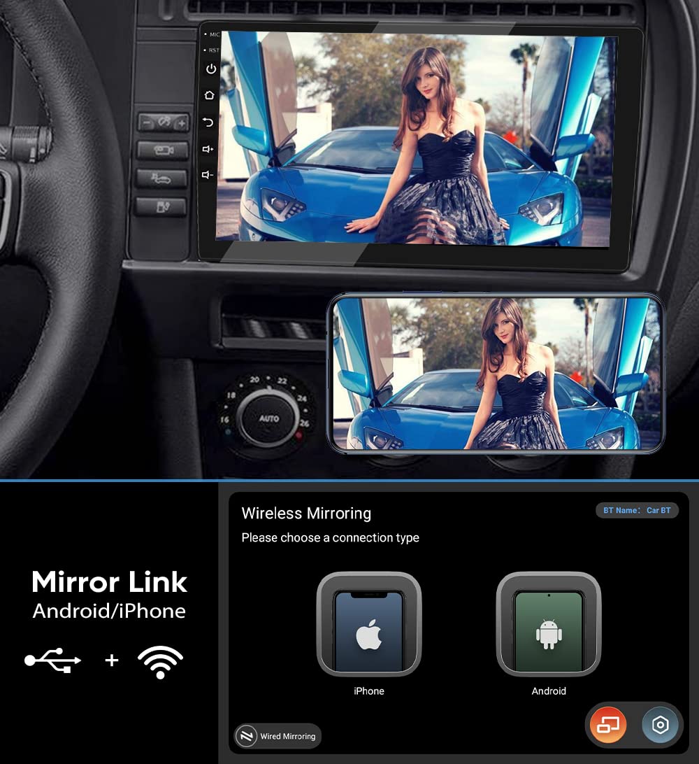 2 DIN car stereo, 10 inch 1080P HD touchscreen car radio with Bluetooth, Android car radio with navigation, Wireless CarPlay & Wireless Android Auto, FM radio, Mirrorlink, WiFi, 2 USB ports, 2GB RAM + 32GB storage.