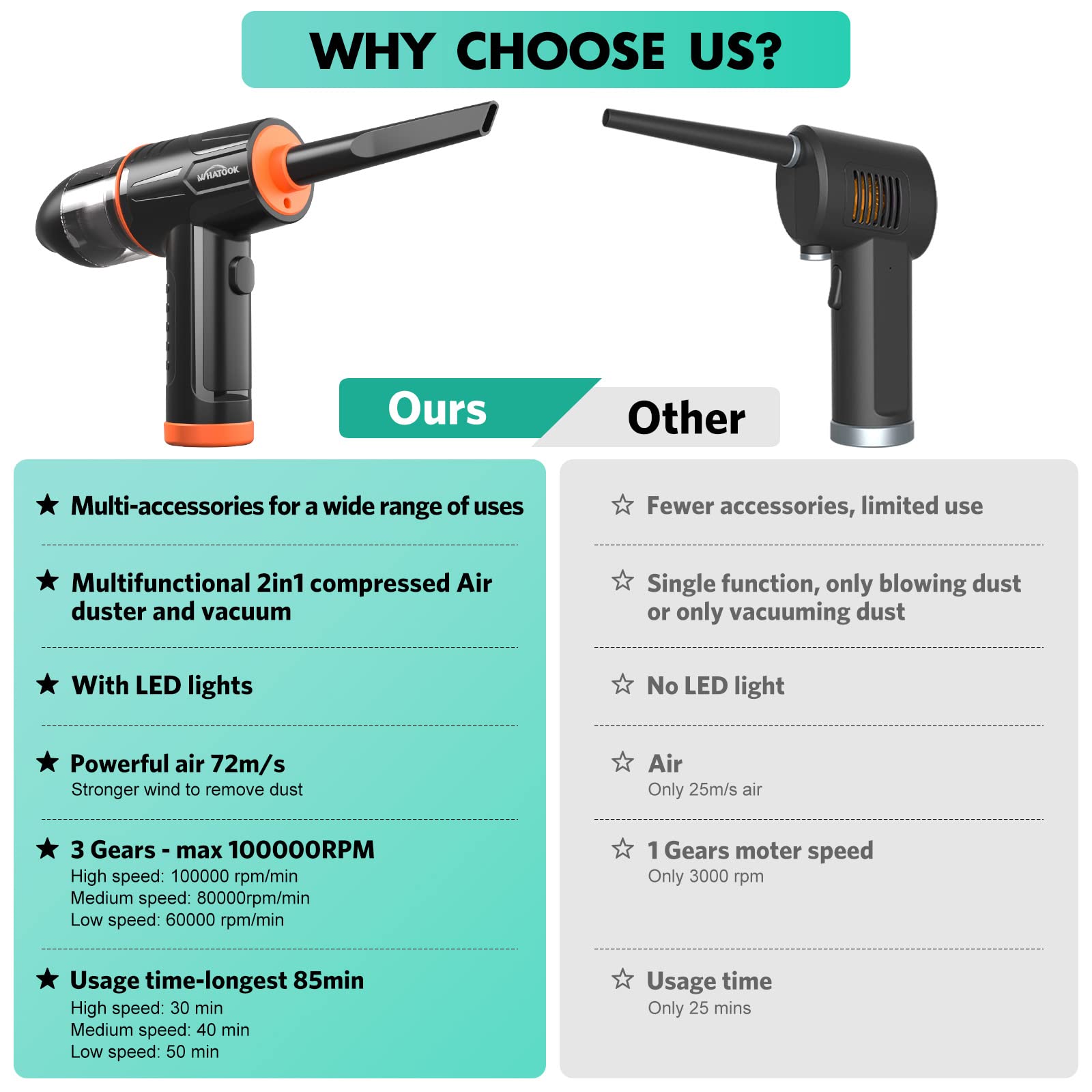 "Reusable: The Air Duster air pressure spray 7600AMH Ultra-Life Battery of the vacuum cleaner can be reused many times, with Type-C fast charging and up to 50 minutes of runtime. Our environmentally friendly and energy-efficient vacuums are the perfect alternative to air pressure canisters and can help you save a lot of money.",