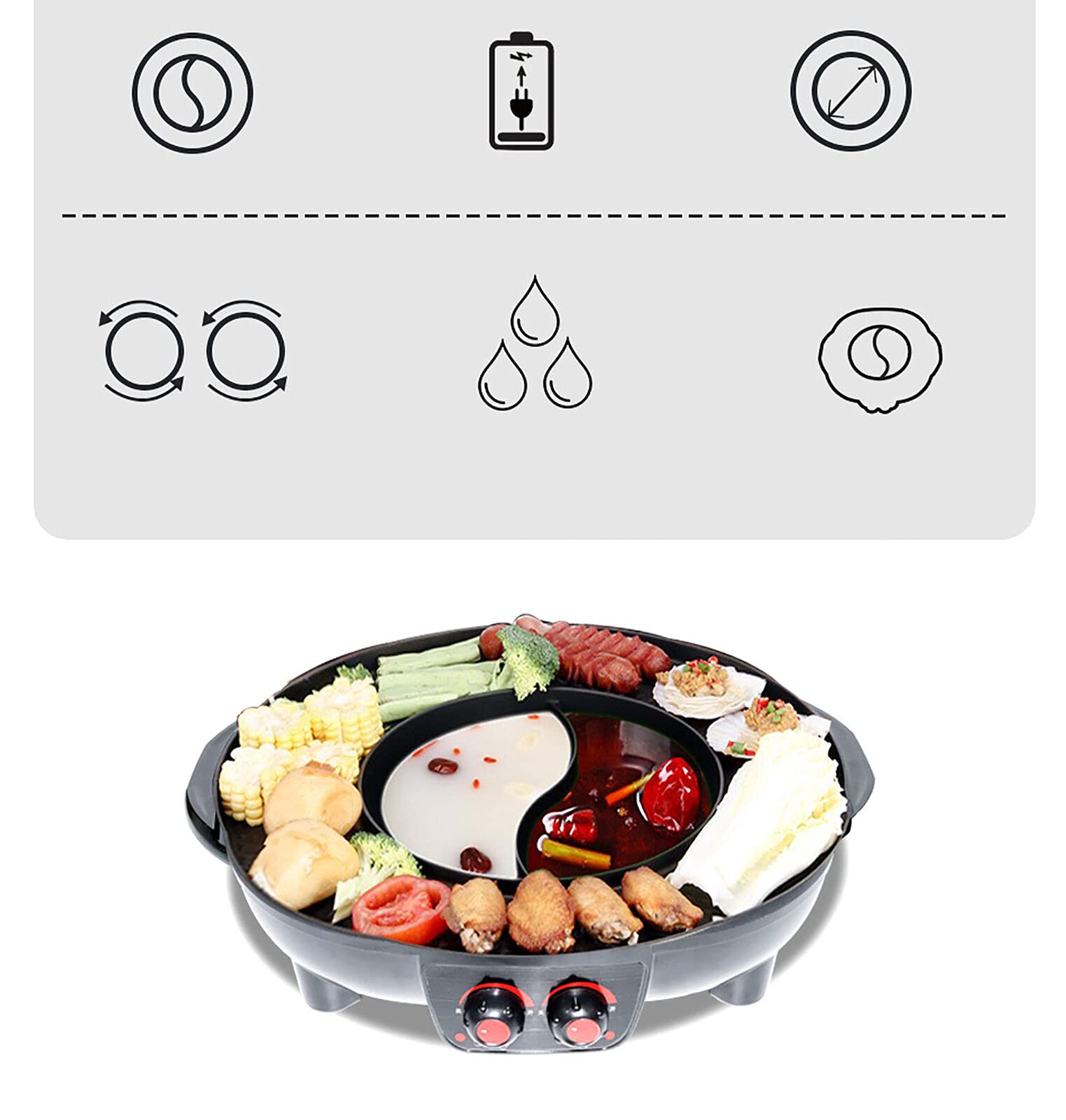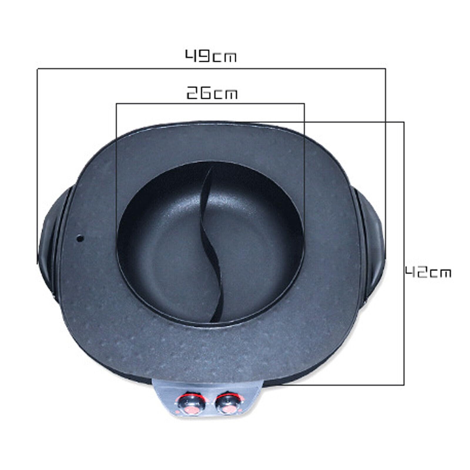 ["With a unique 2-in-1 grill and hot pot oven, you achieve the perfect combination of cooking and grilling.","The surface of the baking tray with smoke-free non-stick coating can effectively inhibit fumes and protect your health. No rust, high hardness, even heating.","Dual temperature switch can be freely used, grill and hot pot can be freely adjusted, and the heat can be controlled as desired, making cooking more convenient.","Using high-quality electronic components, fast and even heating, long service life. Can meet the needs of 5-6 people.","With oil holes in the pan. An oil plate for collecting the start oil."]