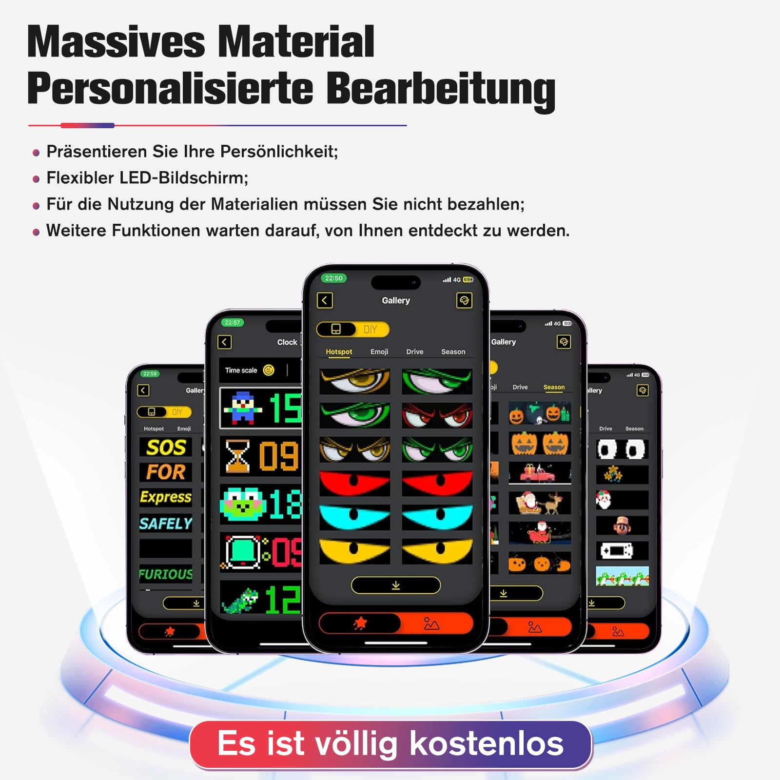 "Intelligent App Control - You can easily control the Devil's Eye Lamp with a user-friendly smart app on your phone. Not only can you choose different eye patterns according to your preferences, but you can also create patterns, colors, and texts to express your unique personal style and make your journey more exciting. Also, you can select German in the language settings.",