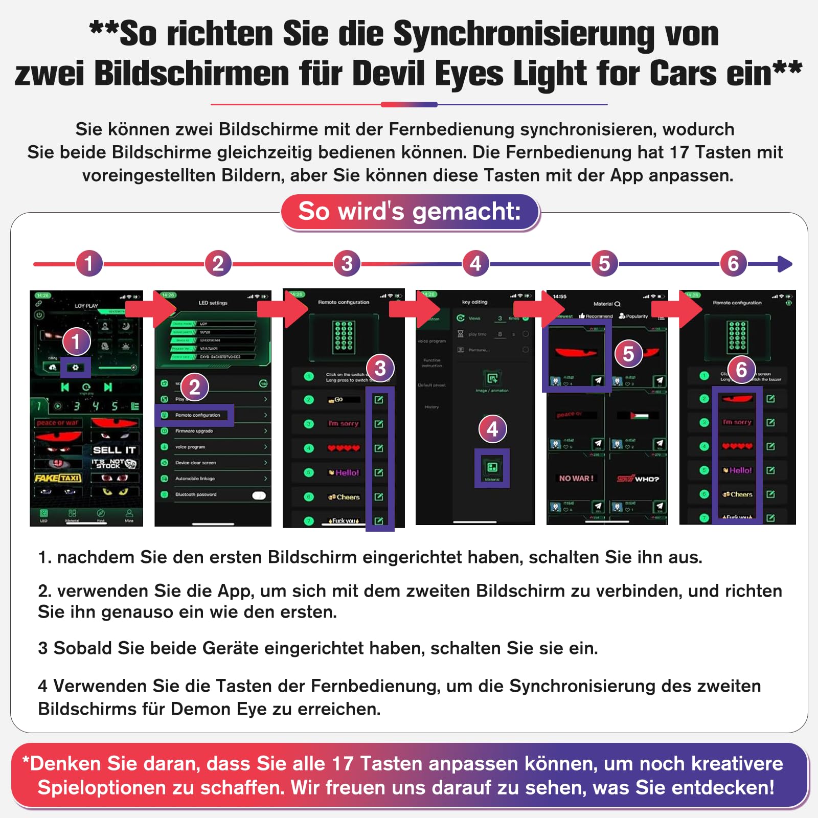"The remote control controls two devil lights - Our manual includes an app suitable for Android and Apple downloads. Through the mobile app, we can link two devil lights. First, use Bluetooth to connect the left eye light. Then you can set the pattern of each button on the remote control. Then use the app to connect the right lights, which also have a pattern for each button on the custom remote control. Once the custom pattern of the two devil eye lamps is set, we can control two devil lights simultaneously with the remote control to display interesting lighting.",