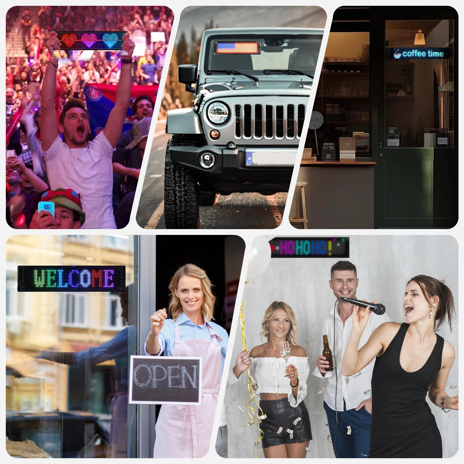 "Versatile Applications - The dynamic programmable flexible LED screen is not only ideal for your car but also perfect for bars, restaurants, shops, cars, street vendors, parties, concerts, wedding decorations, etc. You can also DIY your own text and patterns to express your love and blessings for Christmas, New Year, or wedding.",