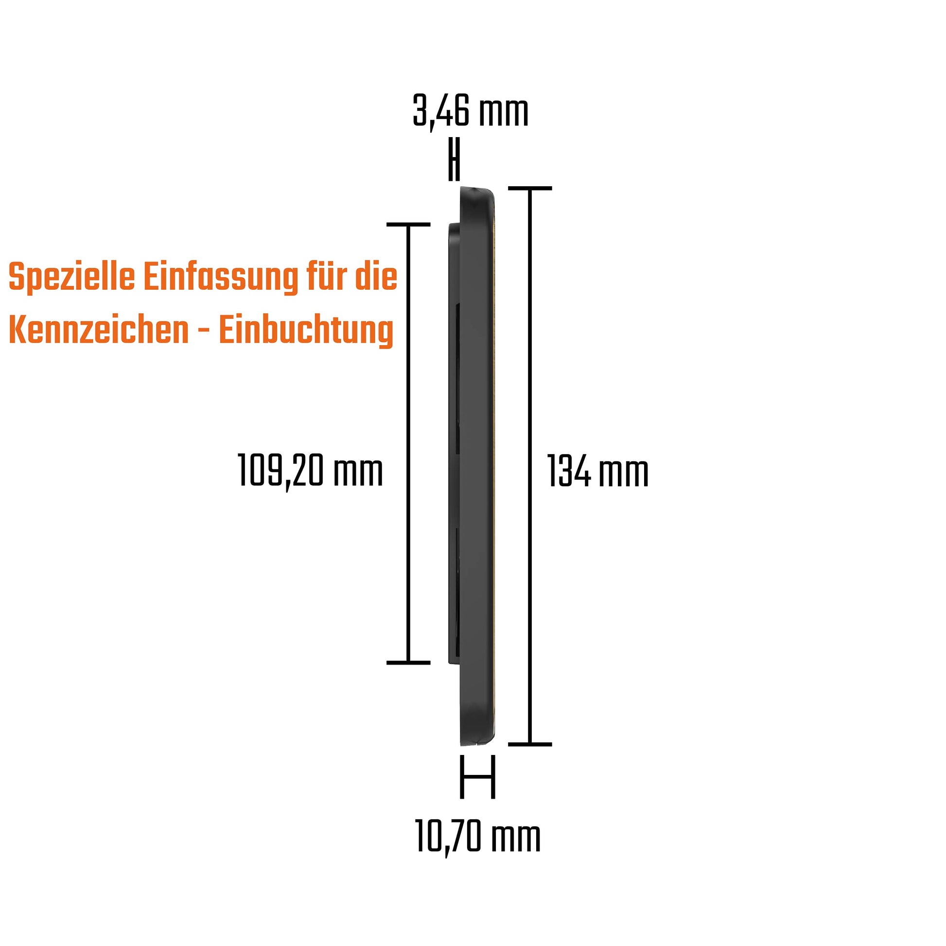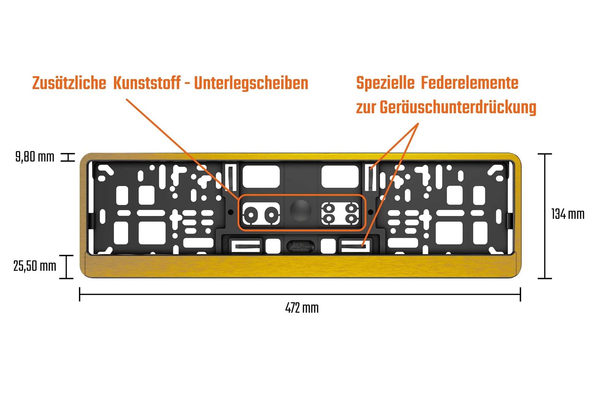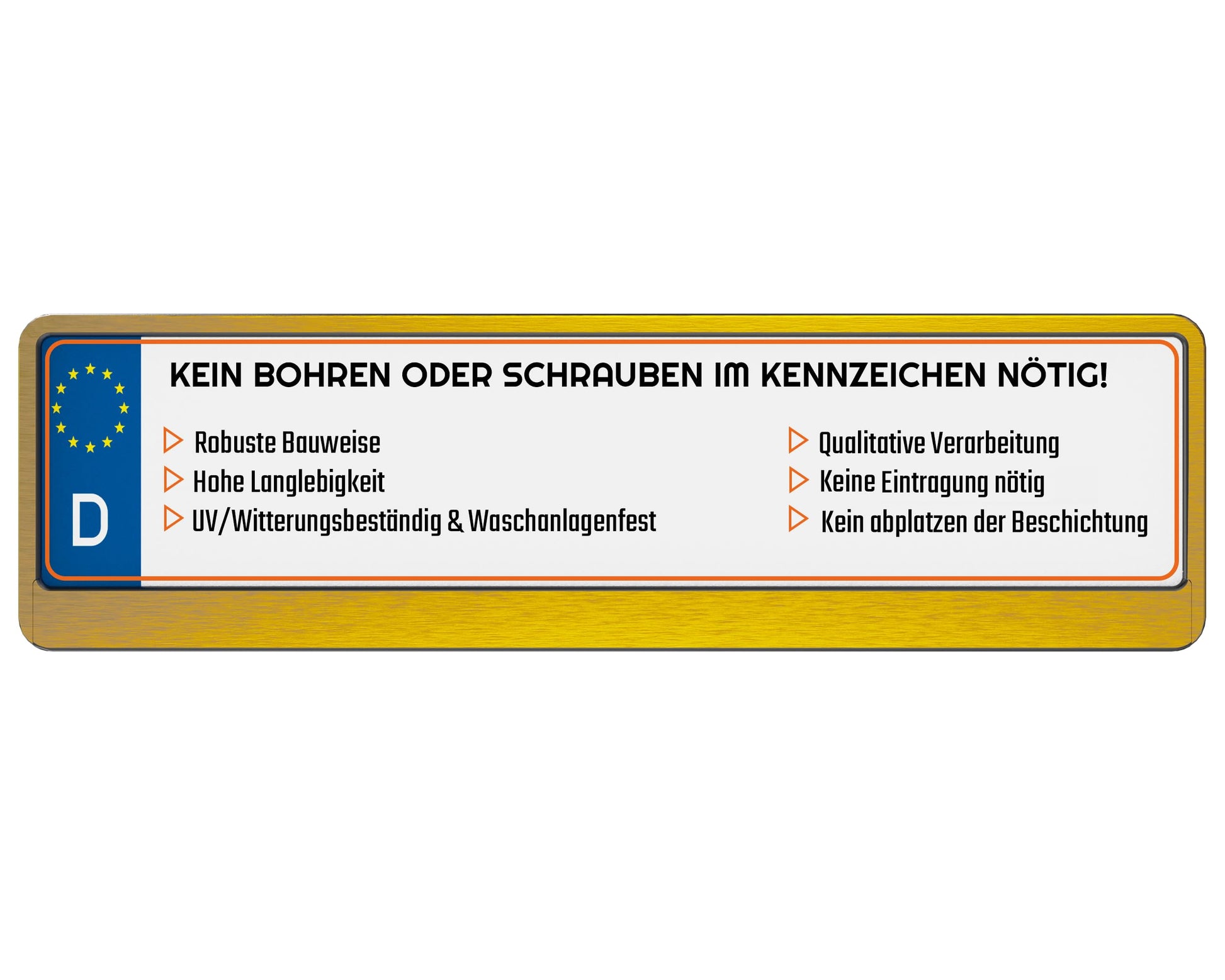 ["2 pieces short license plate holders in GOLD - CHROME BRUSHED for your car, discreet and elegant","The license plate holders 18 inches fit all short EU license plates 18 inches x 4.3 inches. Short license plate holders 18 inches do NOT fit Austria and Switzerland!!!","Weather resistant and car wash proof - quick and easy installation with click system - no drilling required in the license plate","Short license plate holders car feature an intelligent hole pattern, proven construction millions of times, compatible with all vehicle types","License plate holders 18.2x4.3 have the following dimensions: approx. 18.6 inches x 5.3 inches (width x height) & click strip width approx. 1 inch"]